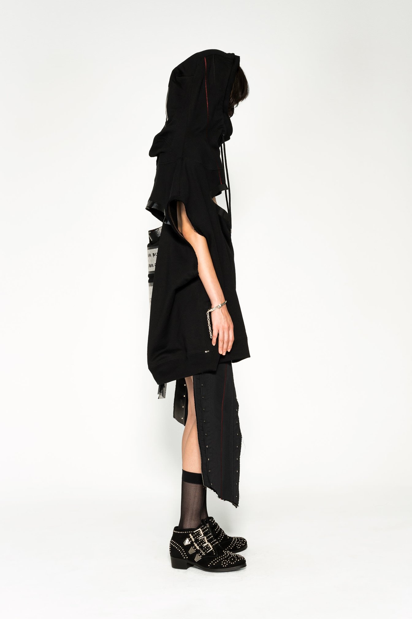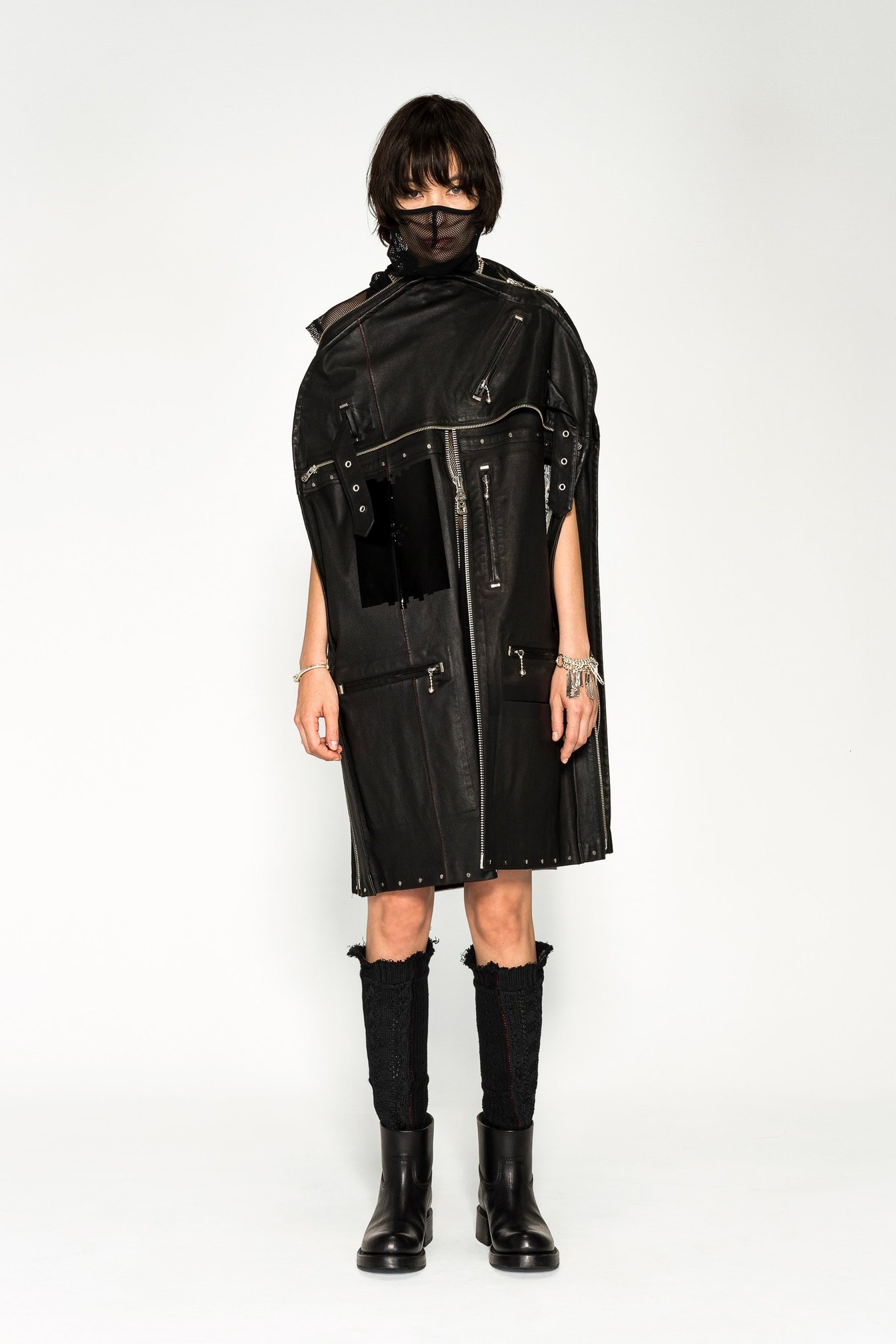 服に目を向けてみよう。今シーズンを象徴するピースは、ガーメントケースを開いたような形状のワンピース。レザーやキルティングで作られたそれは、女性モデルの上半身を包み込むような形をしていて、ジッパーの開閉で表情が変化する。スタッズと閂止めのような形状のシルバーのパーツ使いも特徴のひとつ。なかには縫製の代わりに使用しているように見えるものもある。