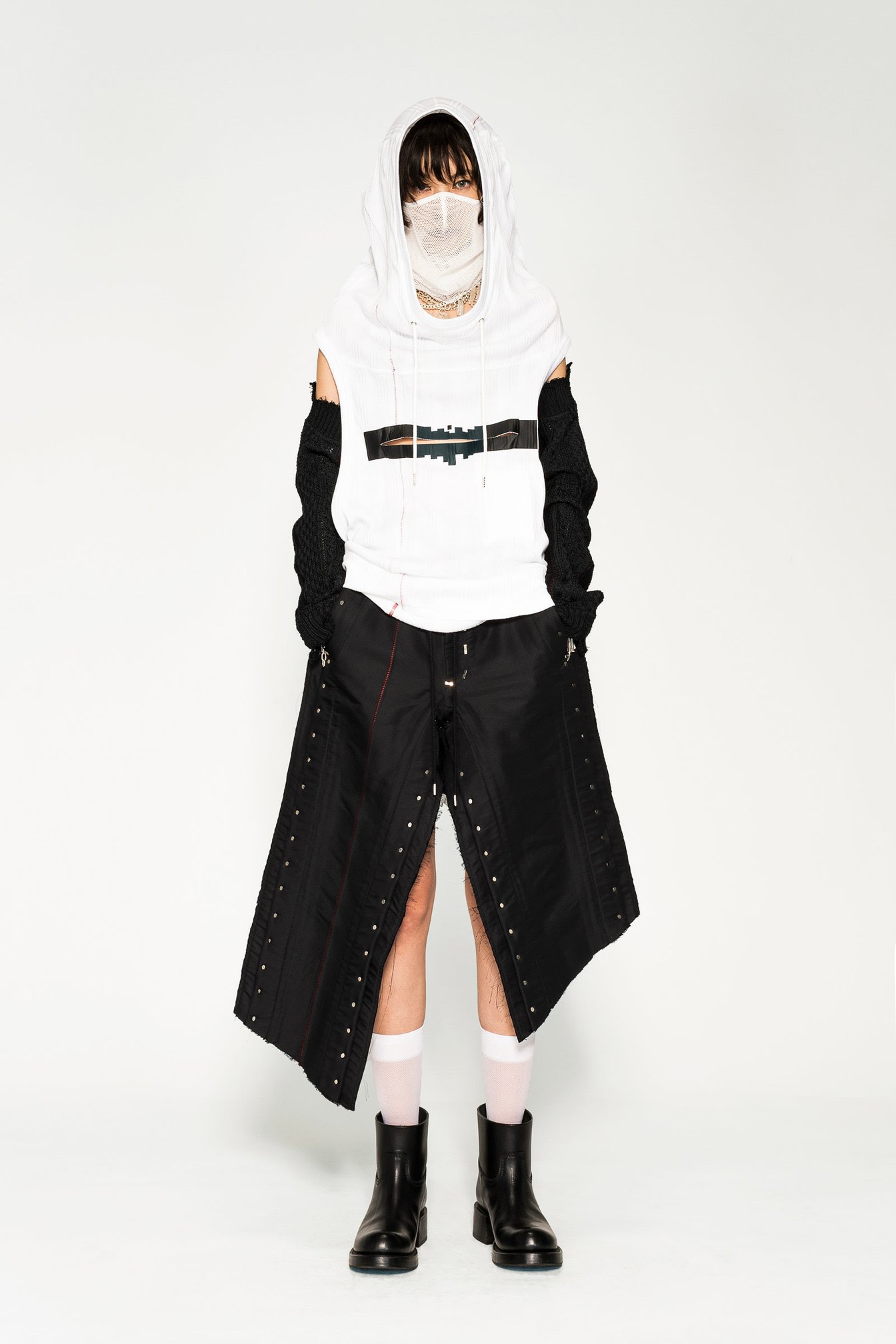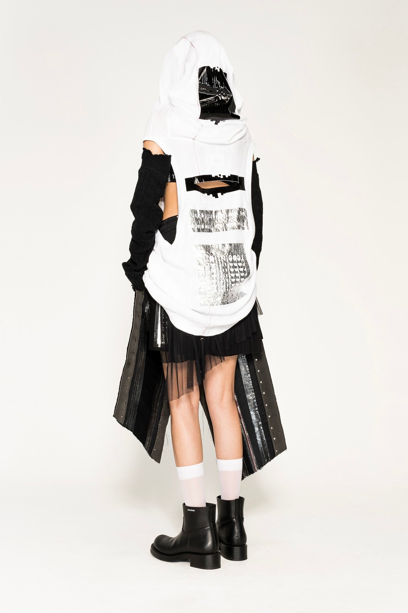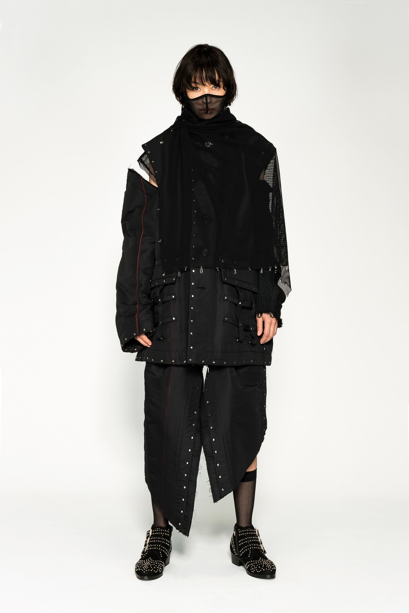 スタッズで装飾された3つのバックルが付いたブーツは、マイケル・ジャクソンの「BAD」の衣装を連想させる。カラーパレットは潔くブラック&ホワイトのみで、素材はレザー、キルティング、メッシュ、コットンなど。顔を覆うマスクは、ウイルスを防御できないメッシュとなっている。