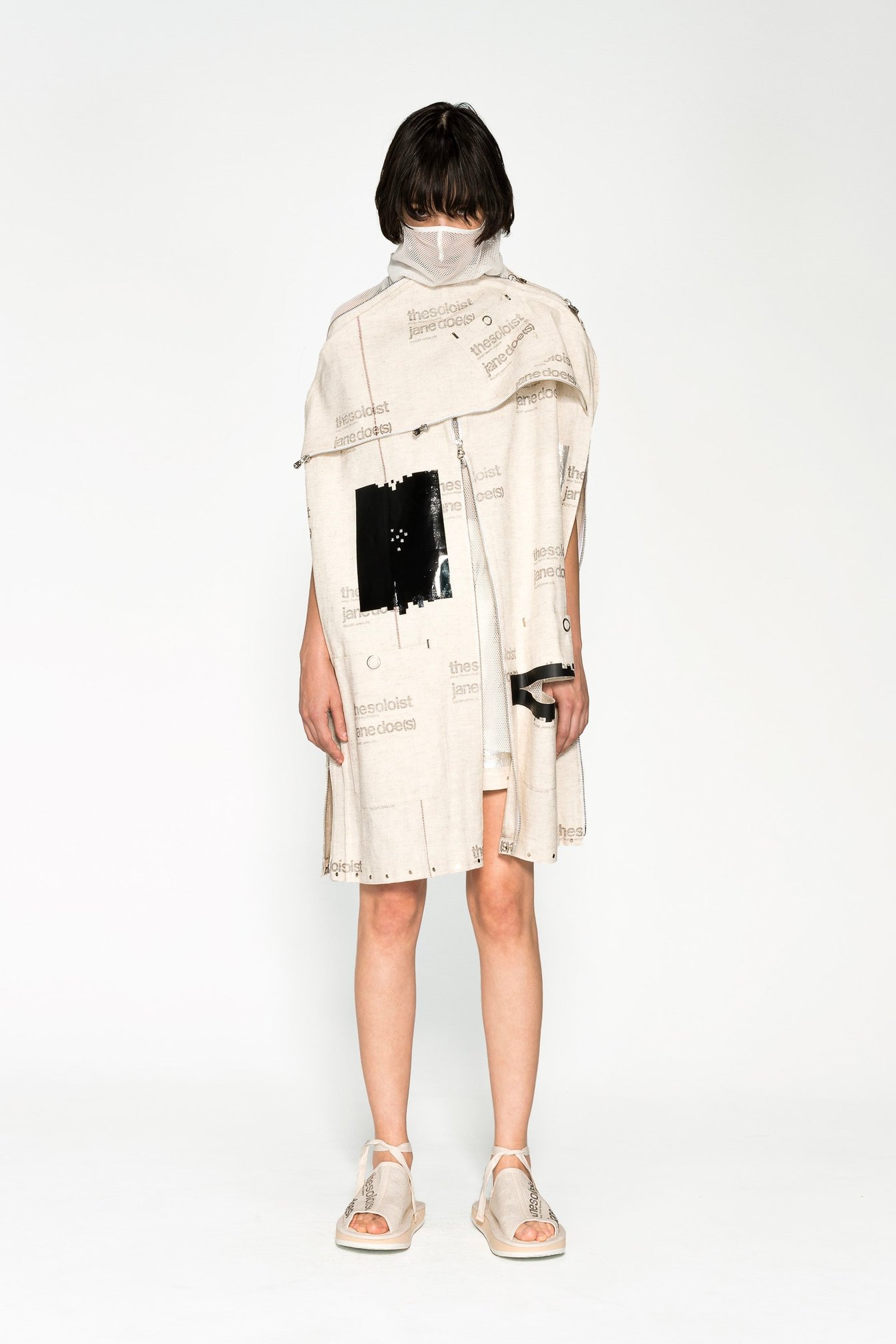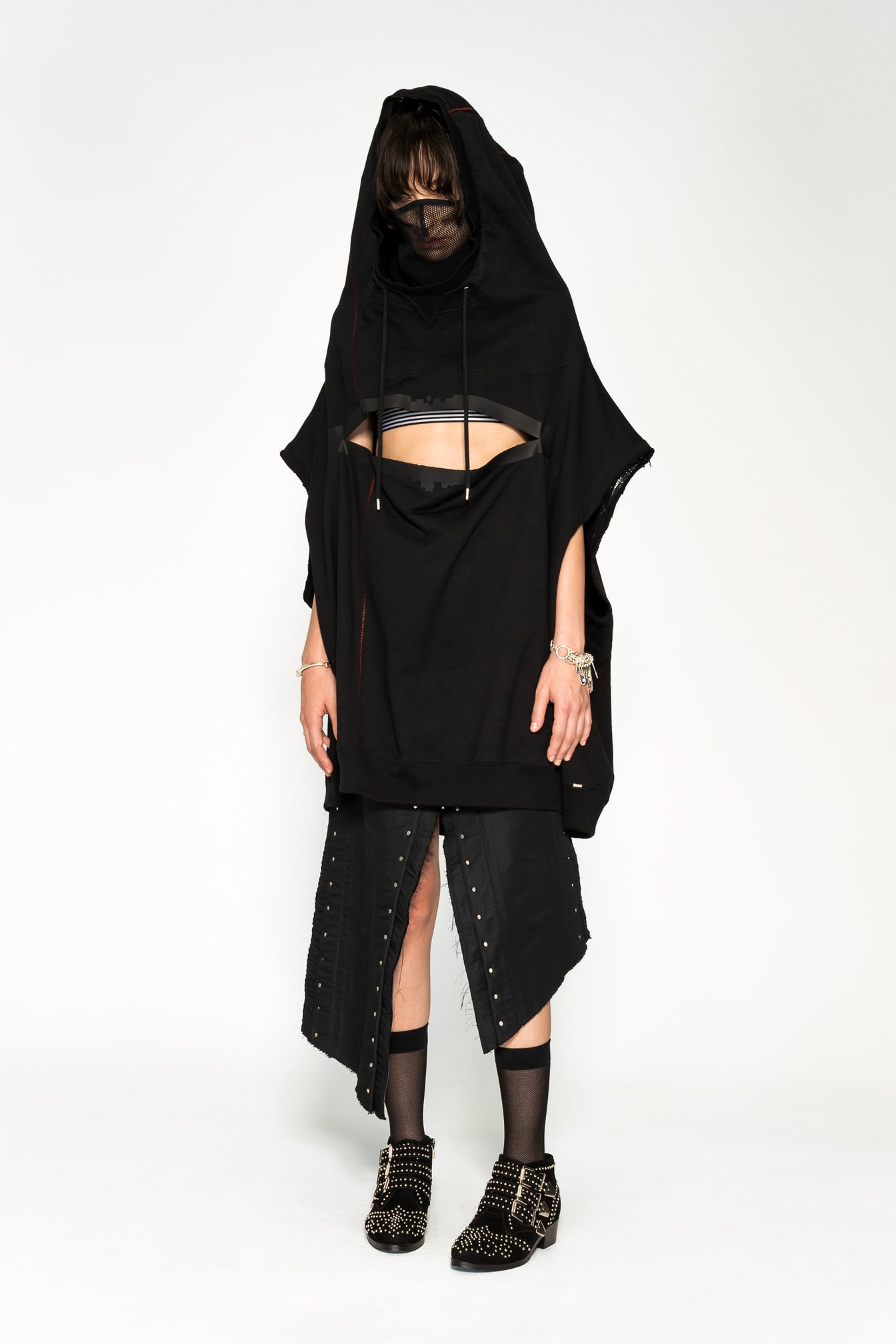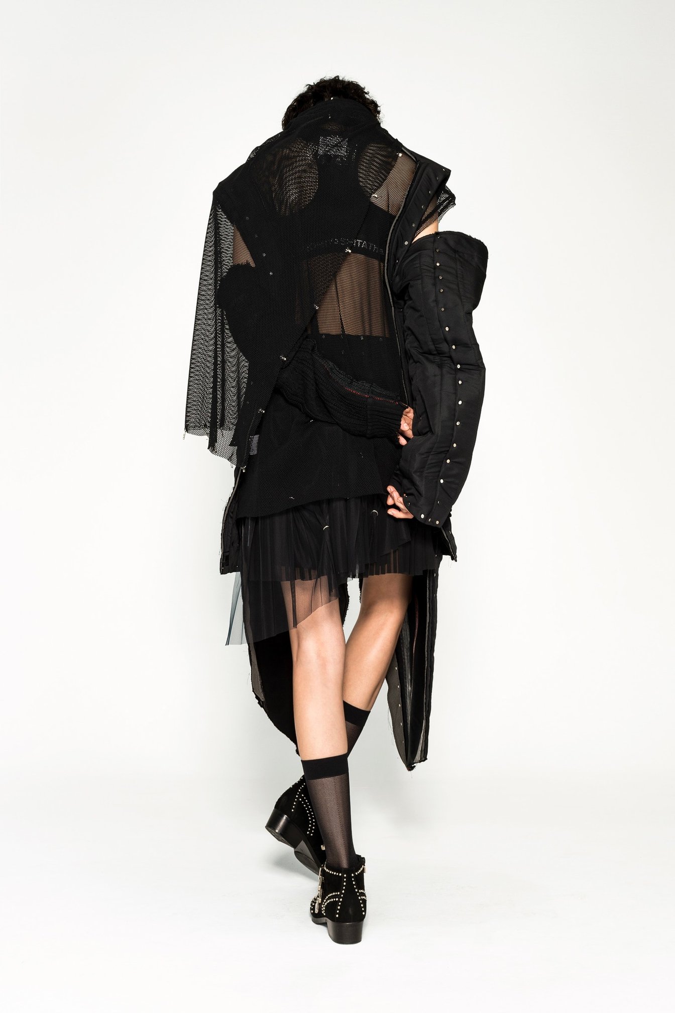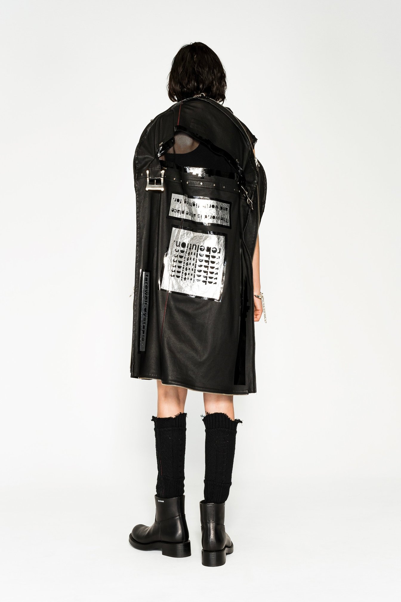スタッズで装飾された3つのバックルが付いたブーツは、マイケル・ジャクソンの「BAD」の衣装を連想させる。カラーパレットは潔くブラック&ホワイトのみで、素材はレザー、キルティング、メッシュ、コットンなど。顔を覆うマスクは、ウイルスを防御できないメッシュとなっている。