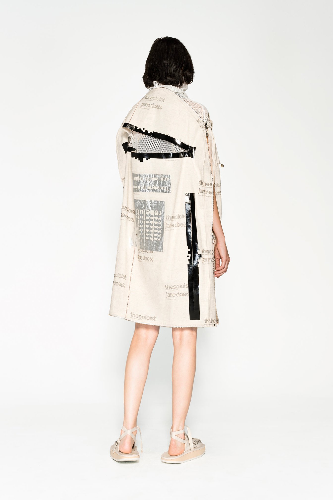 ガムテープで塞がれた布の扉をこじ開ける男。男はメッシュのマスクをしていて、ジージャンをモチーフにした白シャツを着て、華やかなビジューを首から下げている。こんなシーンからフィルムは幕を開ける。白い手袋をした人間は書物を捲り、気になった言葉をカッターで切り刻んだり、縫って修復したりする。その言葉は、服の上でコラージュされ、宮下のメッセージとして声高に主張することになる。