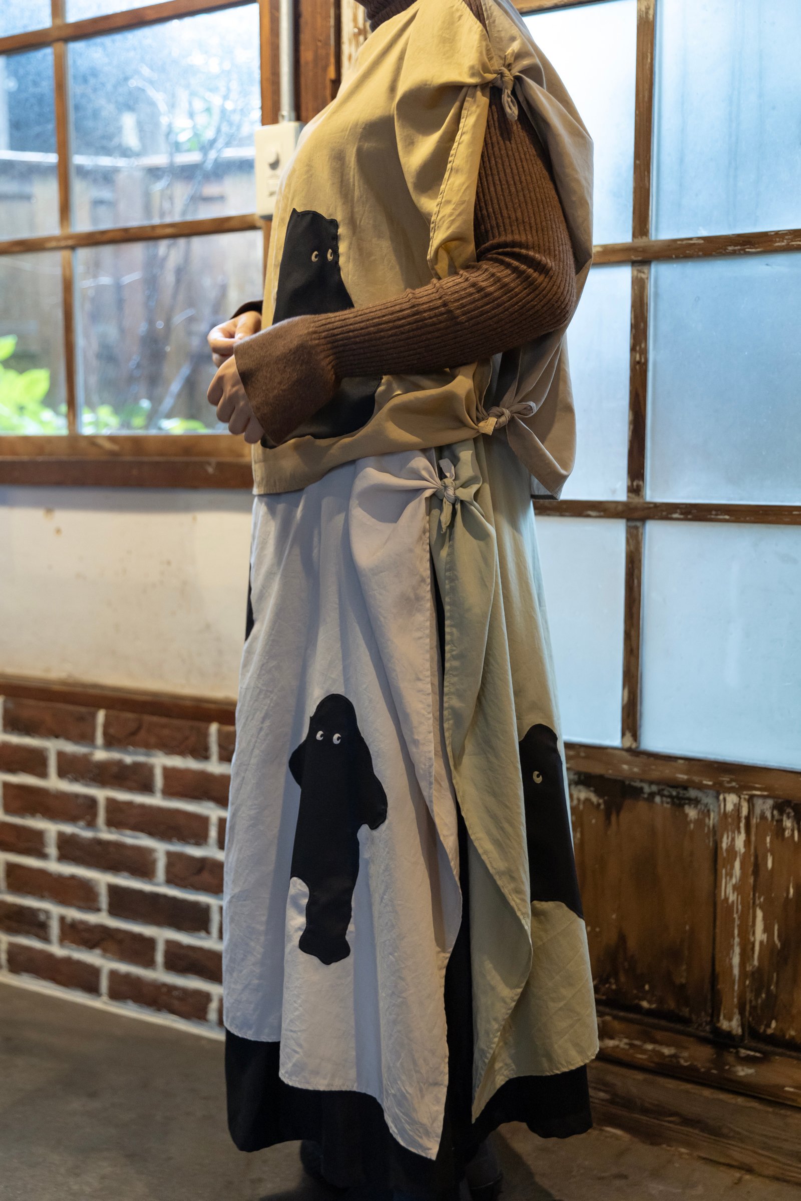 個展の開催はコロナの流行前から決まっていたので別の構想があったのですが、ブランドが休止することになって服を作ることから離れていたこともあり、本能的に服を作りたくなって。1枚の布に絵をパッチワークであしらっていて、布2枚を結ぶと服になるんです。