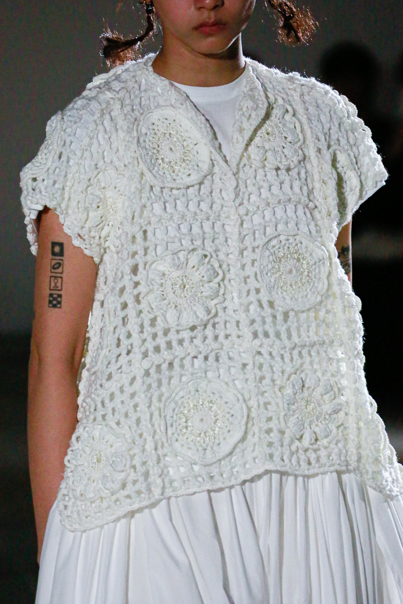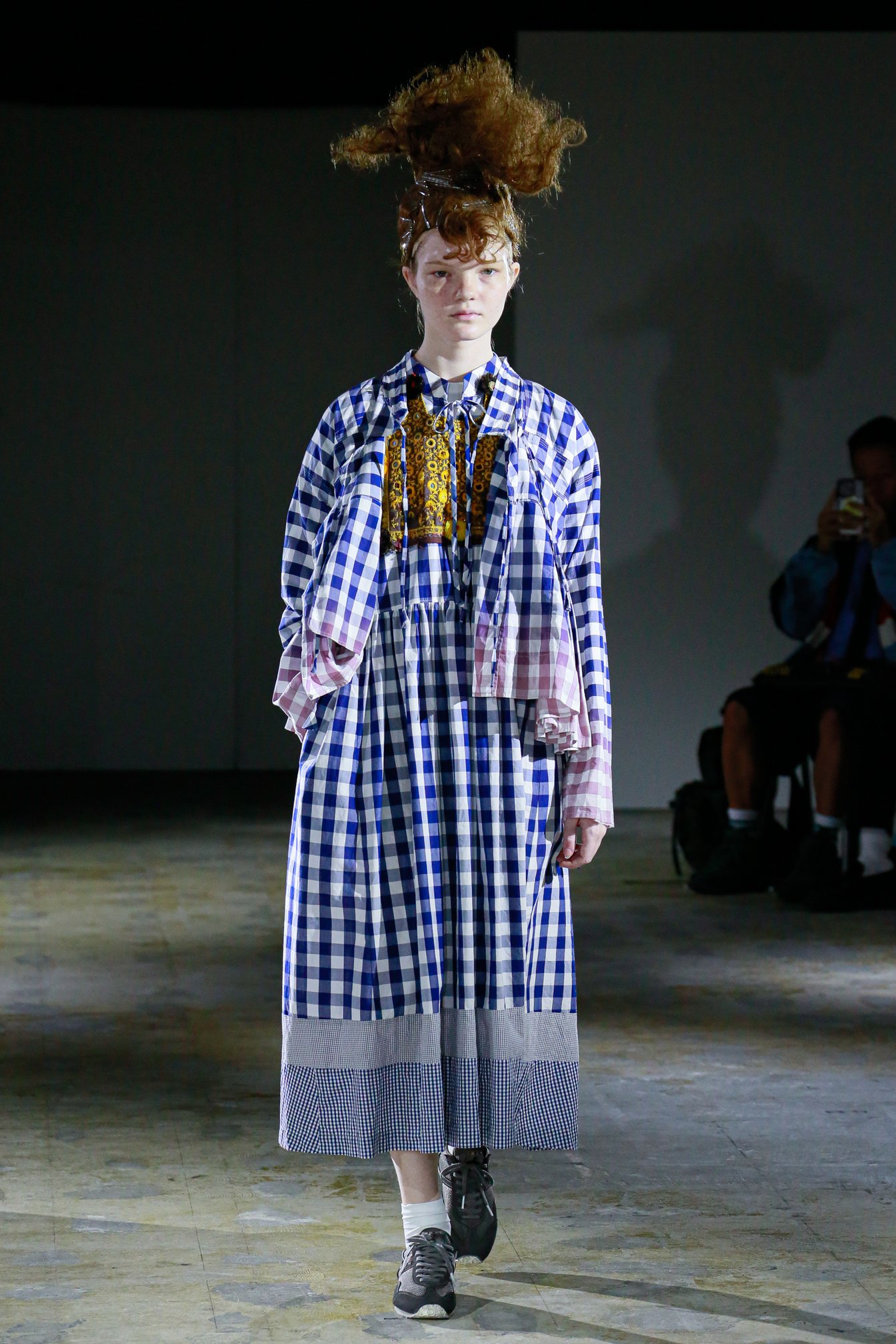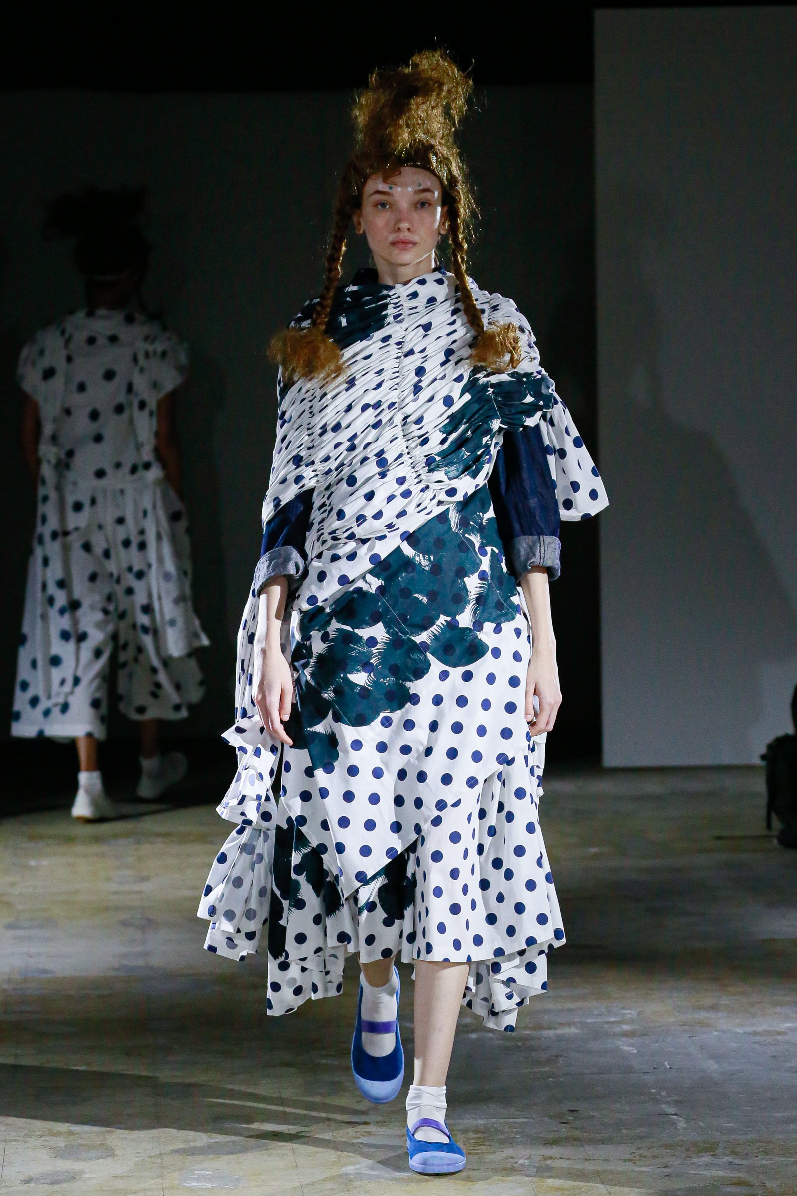 さらに、無数のヘアピンで無造作に結い上げられたヘアや、足元の上履き風シューズが、無垢な少女性をひき立てる。上履きは「トリコ コム デ ギャルソン(tricot COMME des GARÇONS)」時代から提案しているアイテムで、今回のために染められたものだそう。