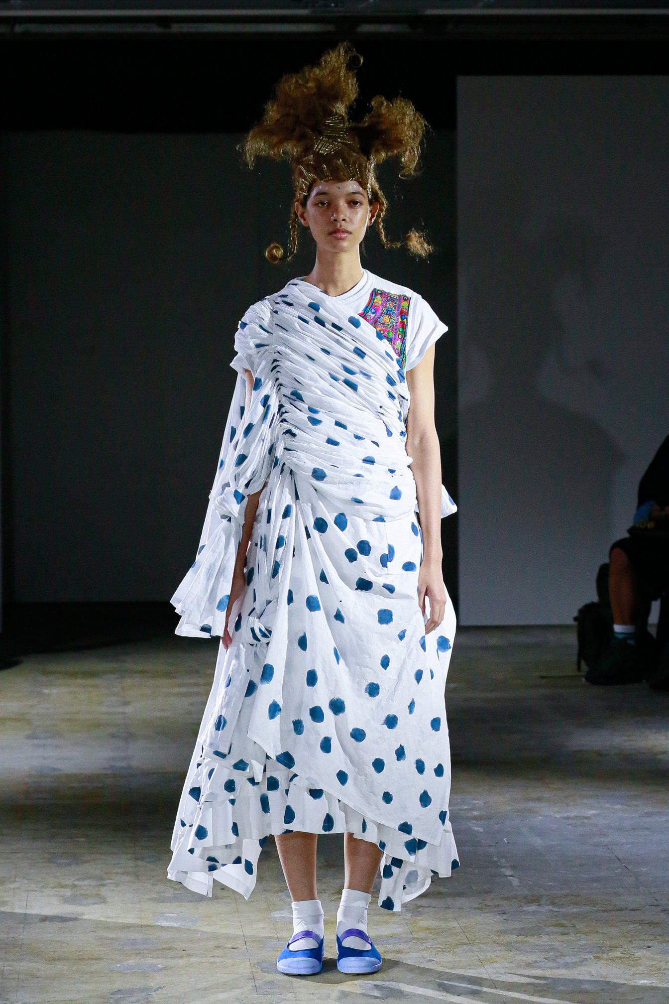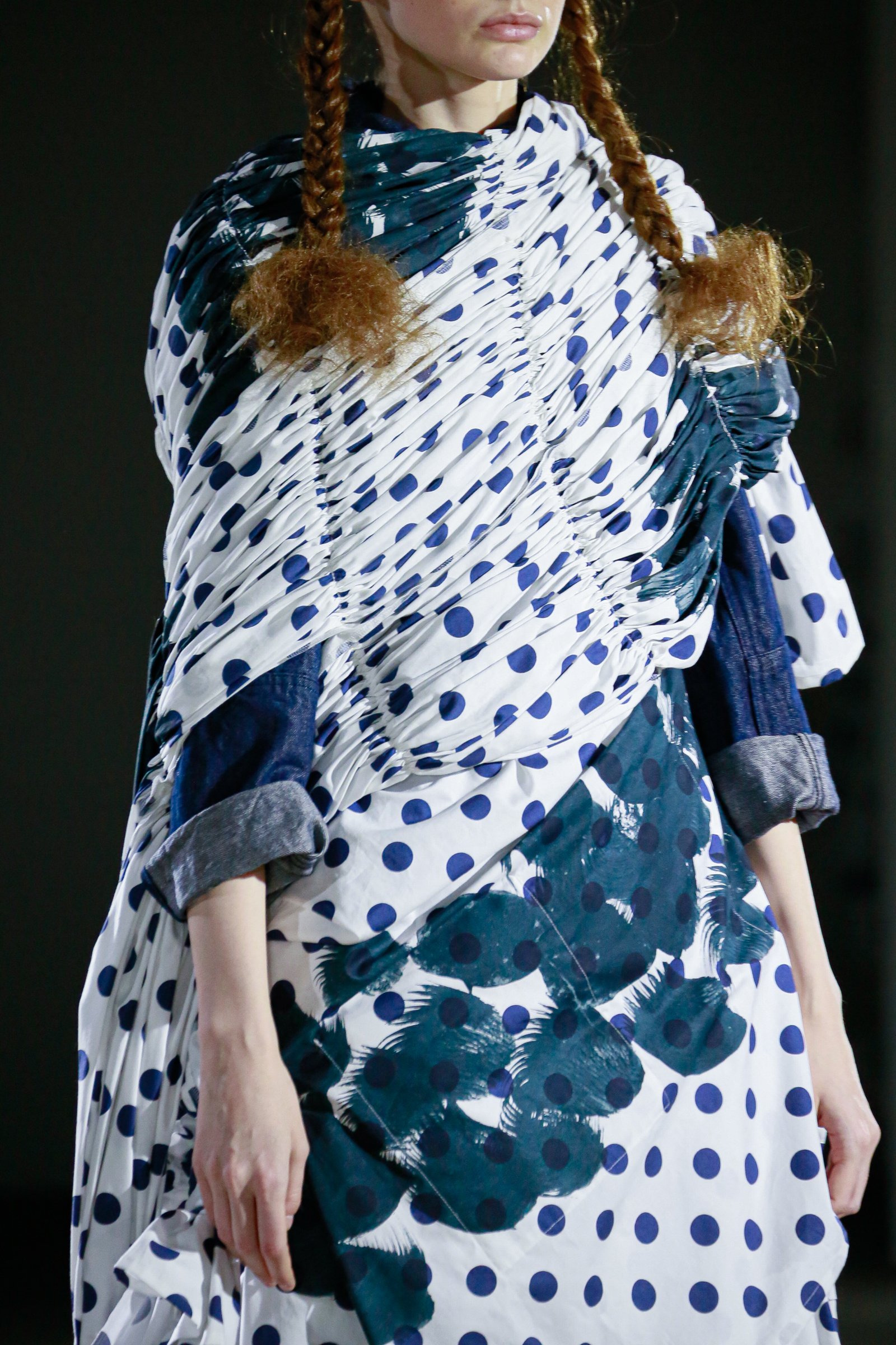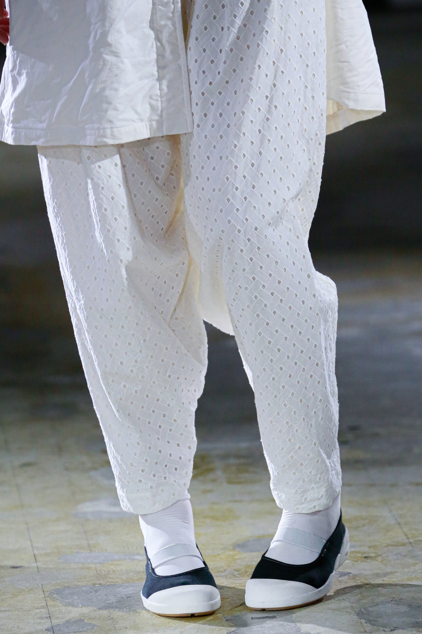 さらに、無数のヘアピンで無造作に結い上げられたヘアや、足元の上履き風シューズが、無垢な少女性をひき立てる。上履きは「トリコ コム デ ギャルソン(tricot COMME des GARÇONS)」時代から提案しているアイテムで、今回のために染められたものだそう。
