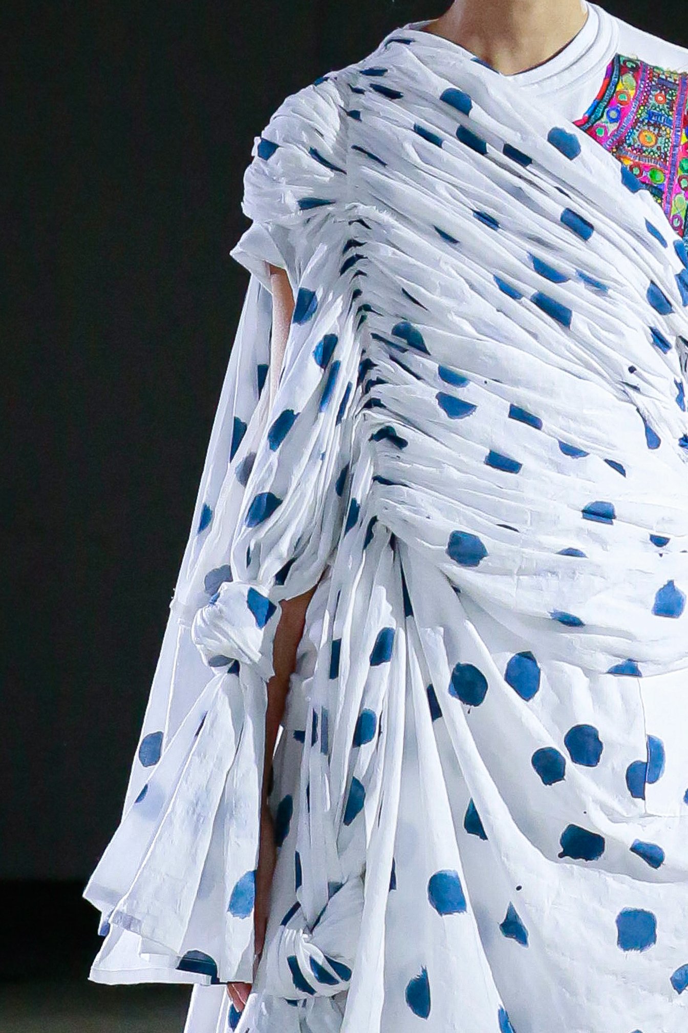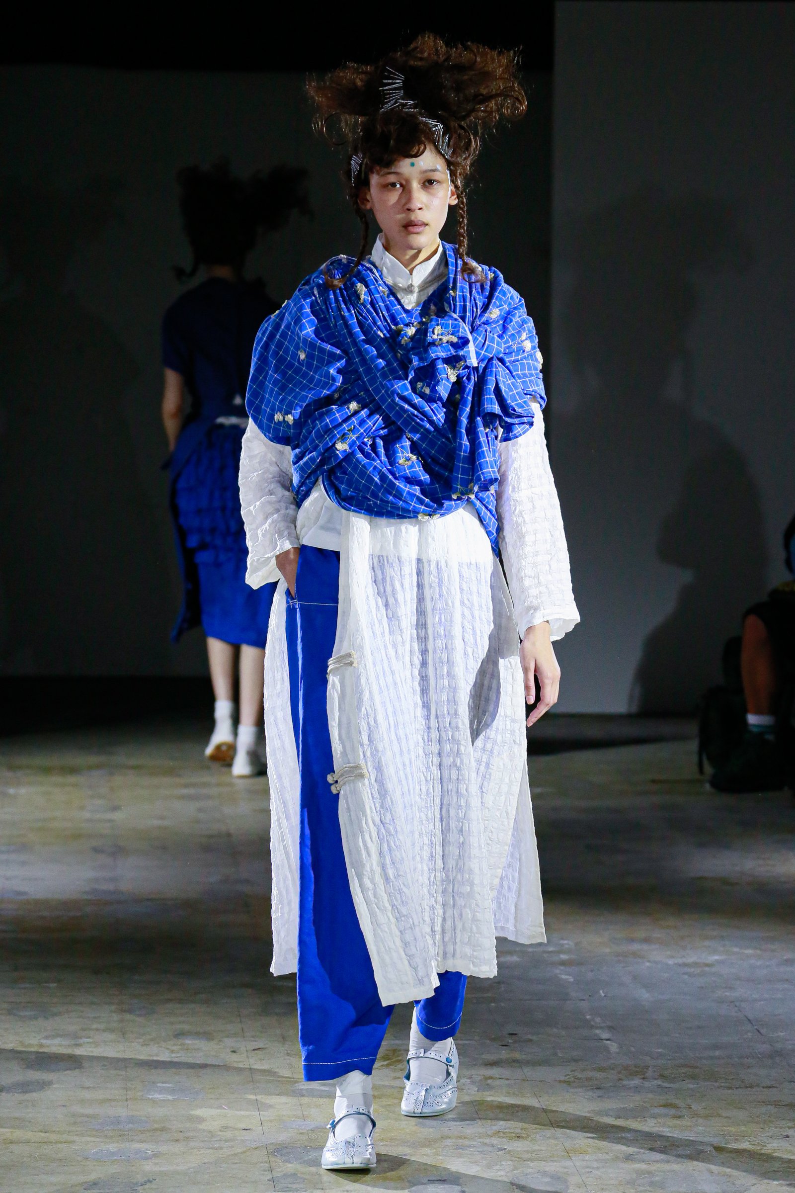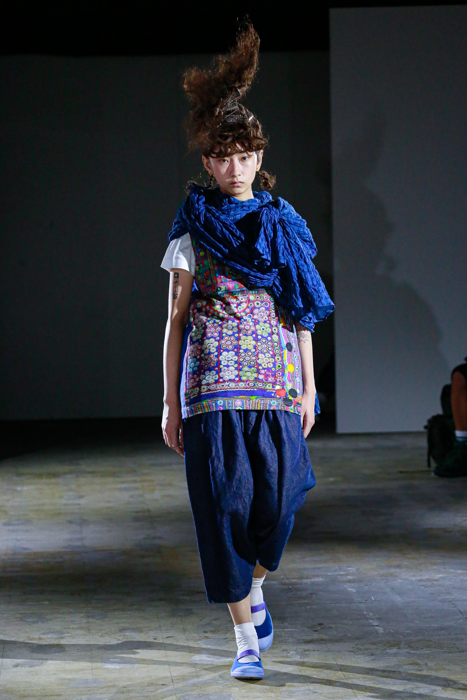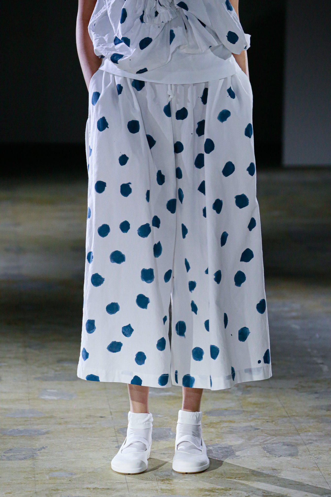 コレクションの要となったのは、テーマである藍染。特に沖縄の伝統的な染織物である琉球藍染のドット模様が多用された。これは宮古島在住の書道家である新城大地郎が手がけたもので、タオとは2回めのコラボレーションとなる。「琉球藍は希少なもので、生産が極めて難しい。墨ではなく、琉球藍で『書』を書いたらどんなふうになるのか?ということを知りたくて、新城さんにドットで描いてもらった」と栗原は振り返る。“自然=丸” というイメージもあったという。