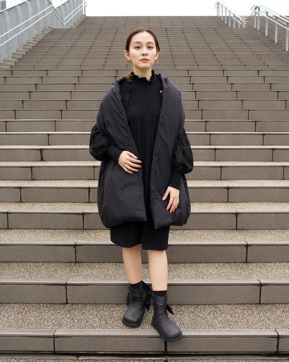 アメカジやスポーティーなスタイルに取り入れられることが多いダウンベストを、ドレス顔な一着にアップデート。ショールを肩掛けしているように見えるデザインや丸みを帯びたシルエットが、ダウンベスト特有の無骨さを打ち消してくれます。カジュアルなアイテムと合わせてもバランスが良く、ワンピースやスカートなどと合わせればオケージョンシーンでも活躍してくれること間違いなし。