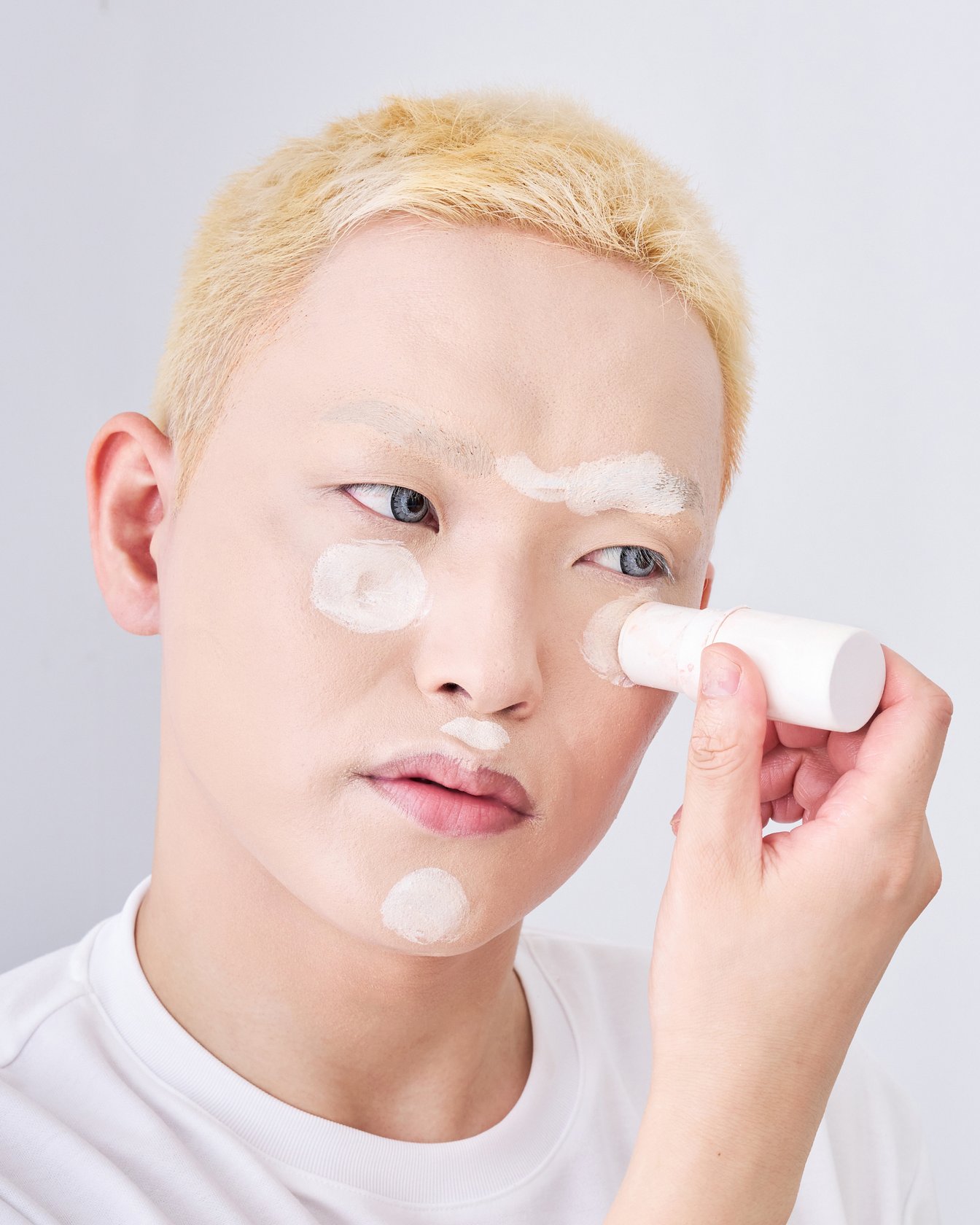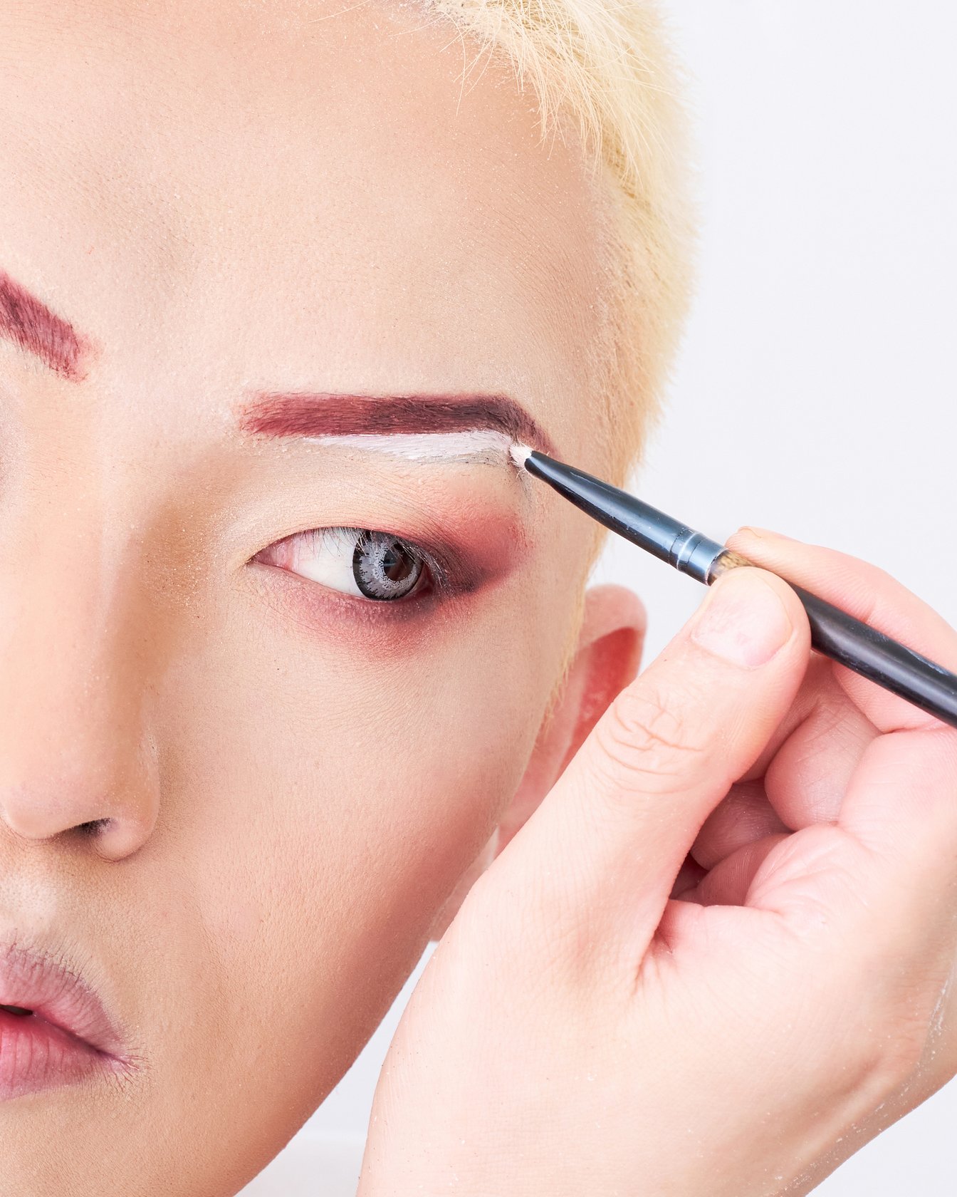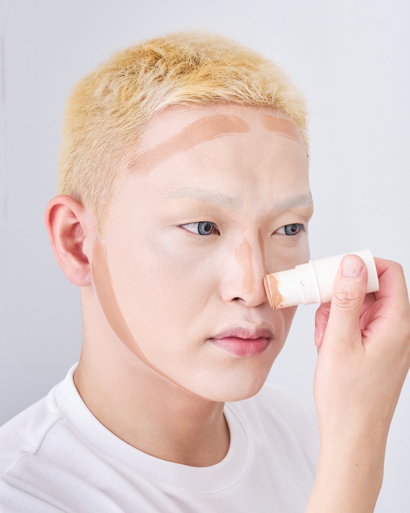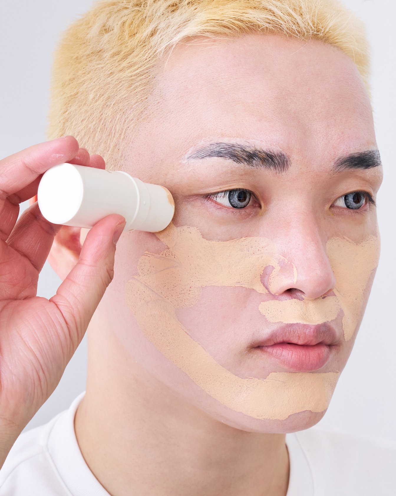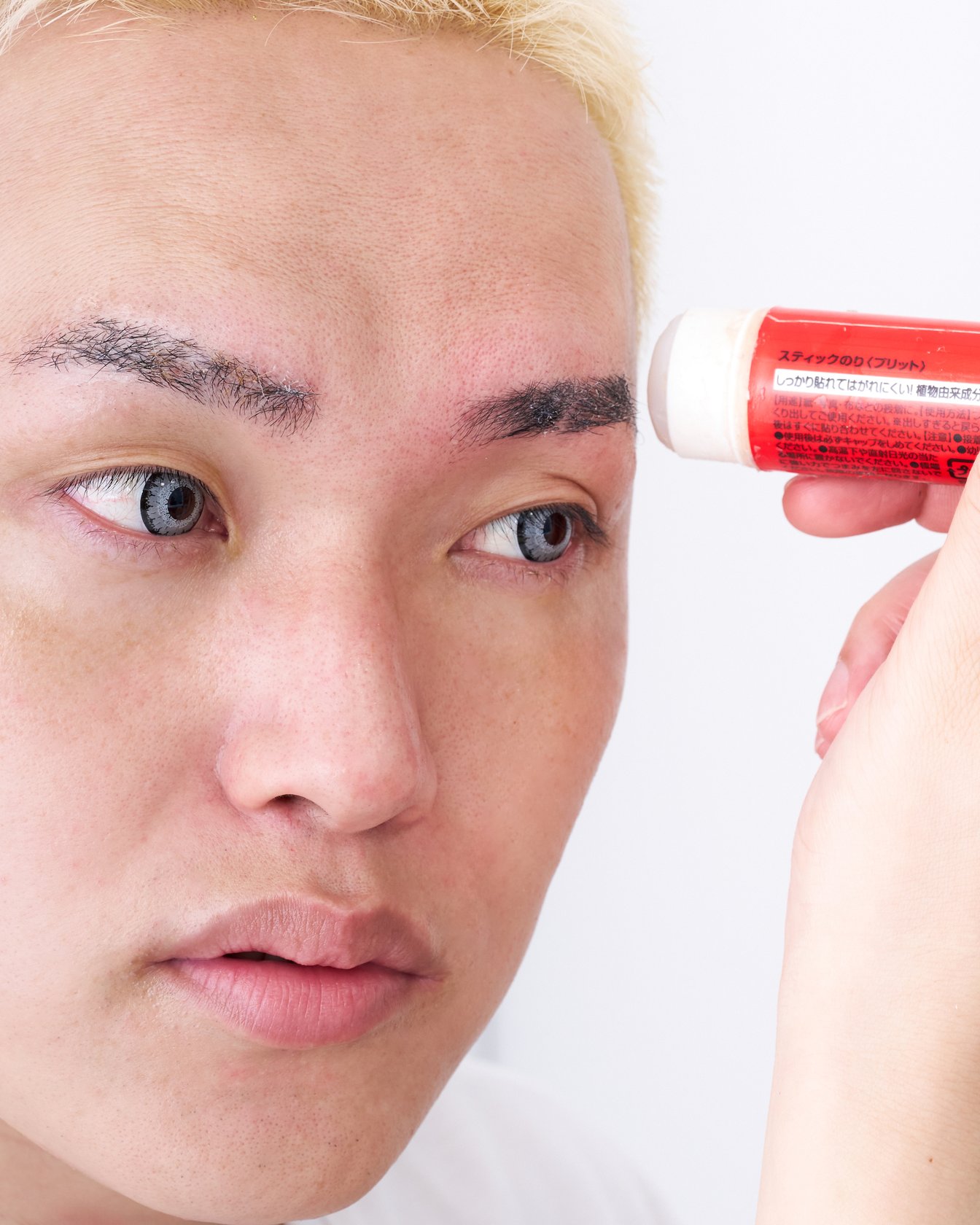 まずは眉毛をスクリューブラシでとかし、毛流れを整えます。テマンダさんの場合は、しっかり、はっきりとした眉毛にしたい時に、スティック糊で貼り付けフラットな状態にセットしているのだそう。プライマーには夏の暑さを緩和してくれるひんやりタイプを、ファンデーションには、崩れなさにもフォーカスした舞台化粧用のスティックタイプを使用します。顔全体に塗ったら、スポンジを使ってやり過ぎくらいしっかり時間をかけて肌に叩き込んでいきます。