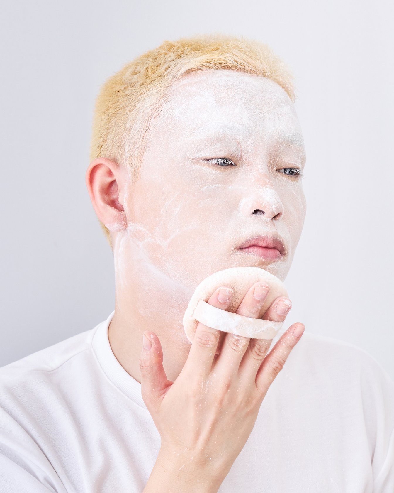 パウダーを全面にセットしたら、2〜3分ほど放置。その後、肌の表面を優しくなでるようにブラシで払います。より強固なベースに仕上がるのだとか。ちなみにテマンダさんがおすすめのパウダーは、コスパが良く心置きなく使える大容量サイズの「ベビーパウダー」。