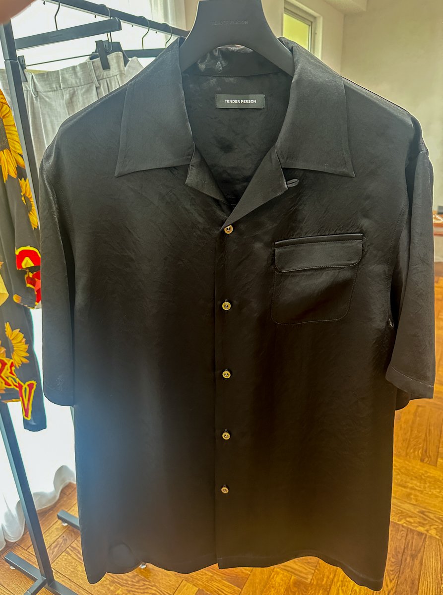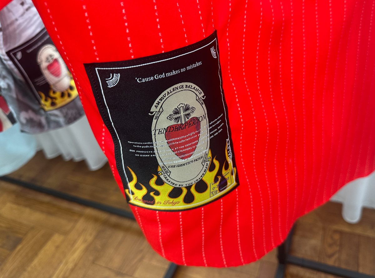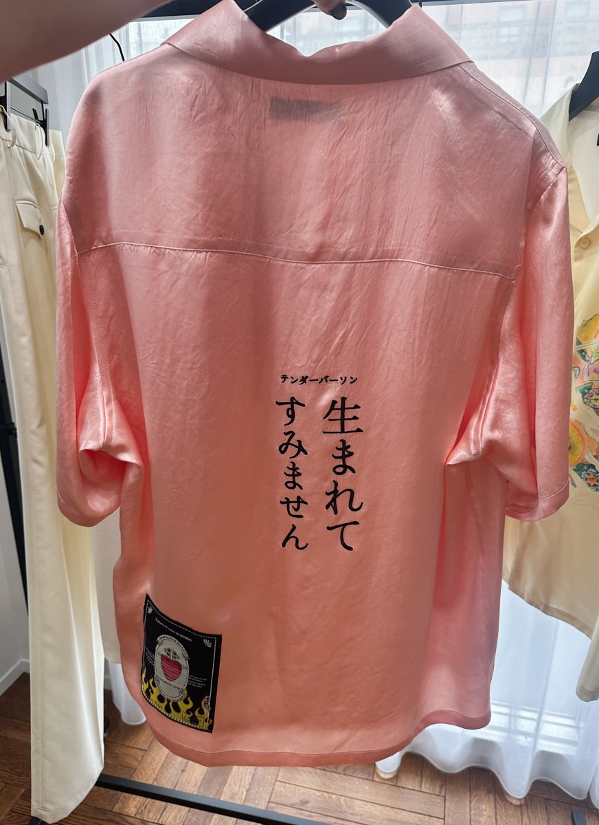ラインナップには、トラック野郎のシーン写真を大胆にあしらった鯉口シャツや、主人公 星桃次郎のトラックのデコレーションにも使われた太宰治の「人間失格」の一節「生きててすみません」を刺繍した開襟シャツが登場。ローライダーカルチャーを彷彿とさせるレタリングのエアブラシペイントは、米軍の基地で働いていた父の影響を受けながら、ブランドが持つ「真面目な不良」の美学と融合させた。そのほか、“デコトラ”的なグラフィックをあしらった派手なシャツやバンダナ、アイコンであるフレームモチーフをあしらったアイテムを展開し、テンダーパーソンらしいセットアップには尾州の生地を採用した。