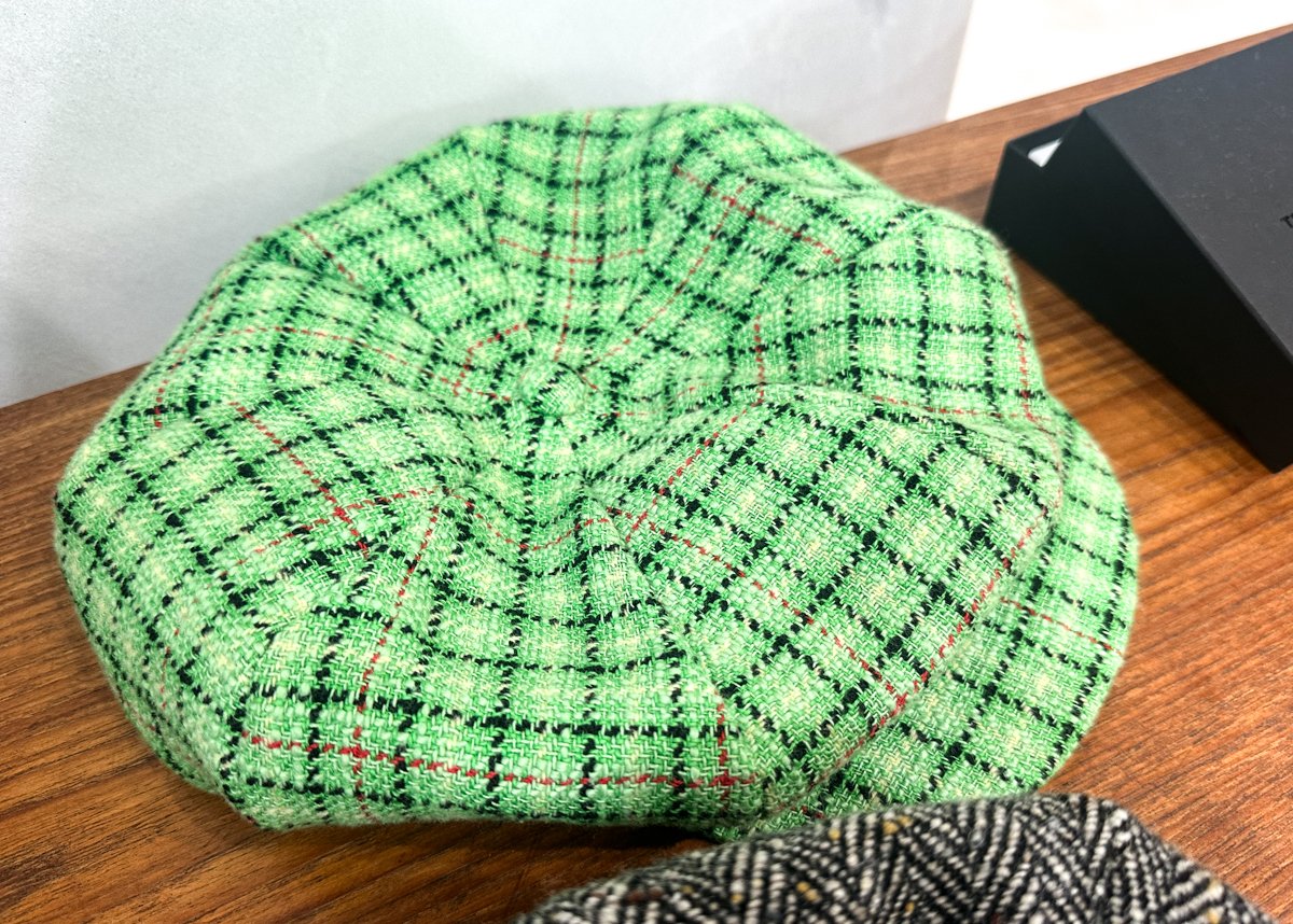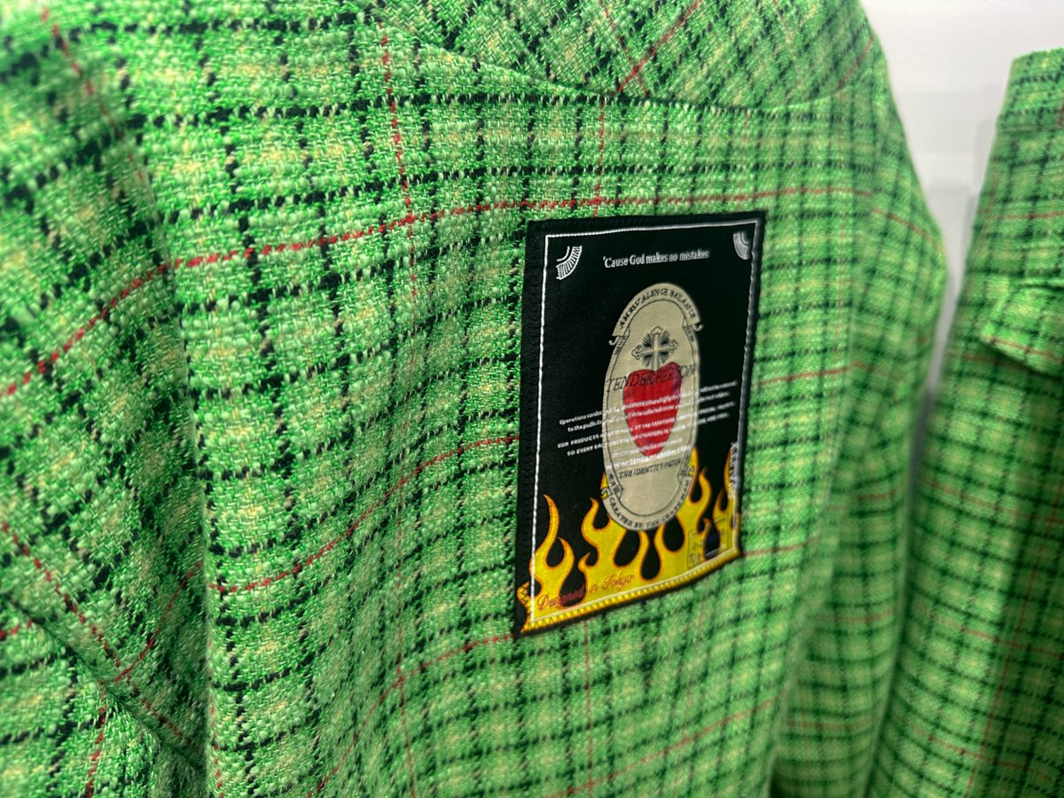 そのほか、スペシャルピースとして製作した鮮やかなグリーンのツイード生地は、某ラグジュアリーメゾンのテキスタイルデザイナーを務める日本人との出会いから生まれた。工場に赴き、手織りの機械で美しいテキスタイルが織られていく様子に感銘を受けたというヤシゲは、同工場の協力を得て、糸からオリジナルでツイード生地を製作。「工場で保管している膨大な生地のアーカイヴや職人さんたちの素晴らしい手仕事(サヴォアフェール)を見せていただいて、僕自身、もっとクリエイティブを磨かなければいけないと背筋が伸びました。実は今回のツイード生地はまだプロトタイプ。今後、デザインにしてもクオリティにしても、さらに“突き詰めたもの”を作っていきたいという所信証明としてお披露目しました」と語る。