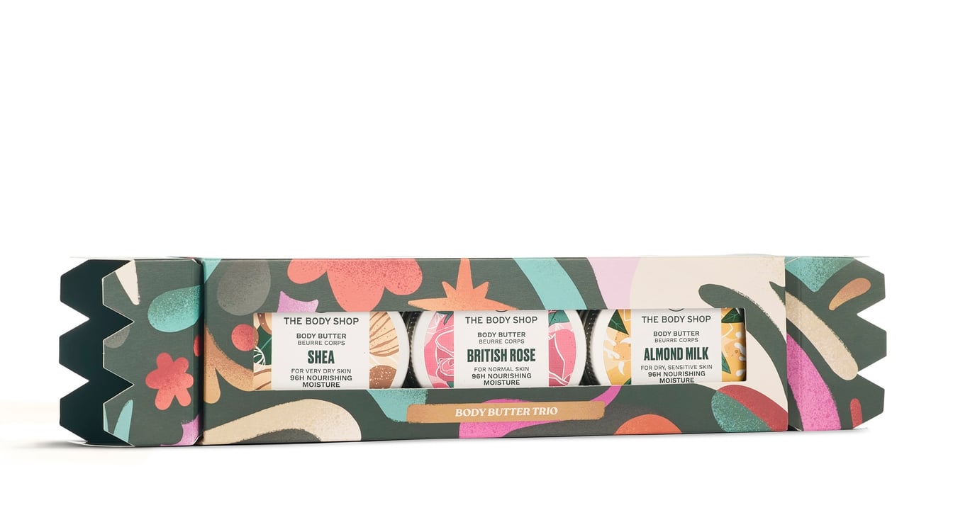 シア、アーモンドミルク、ブリティッシュローズのミニボディバター3点のセット。クラッカー型のパッケージが目印。