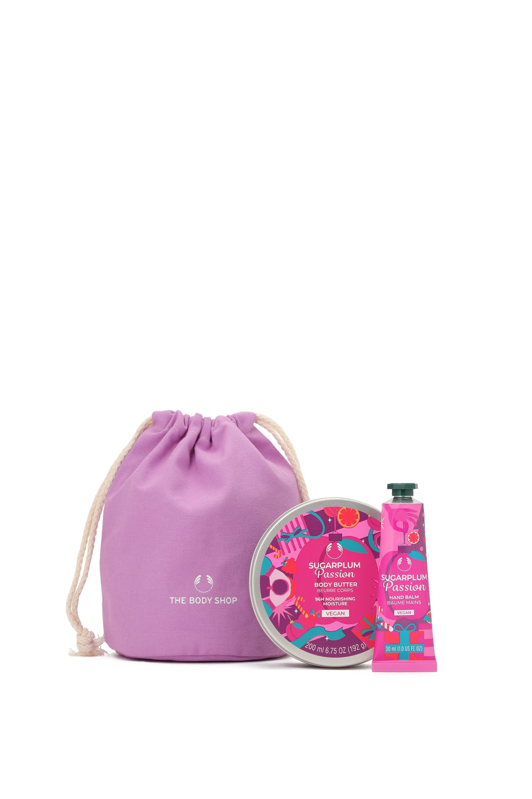 シュガープラムパッションの香りのバス&シャワージェル、ボディバター、ハンドバームがセットになったミニギフト。香りをイメージしたパープルカラーの専用ポーチ付きで登場します。