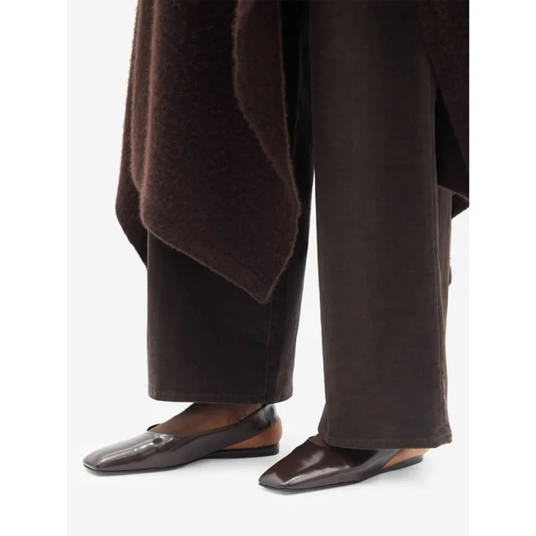 バレエのトゥシューズを思わせるような、立体的なスクエアトゥに洒落感が宿るデザイン。チョコレートブラウンの色味や、光沢のあるレザーが足元で存在感を放ちます。スマートなフォルムなので、ワイドパンツとも好相性。