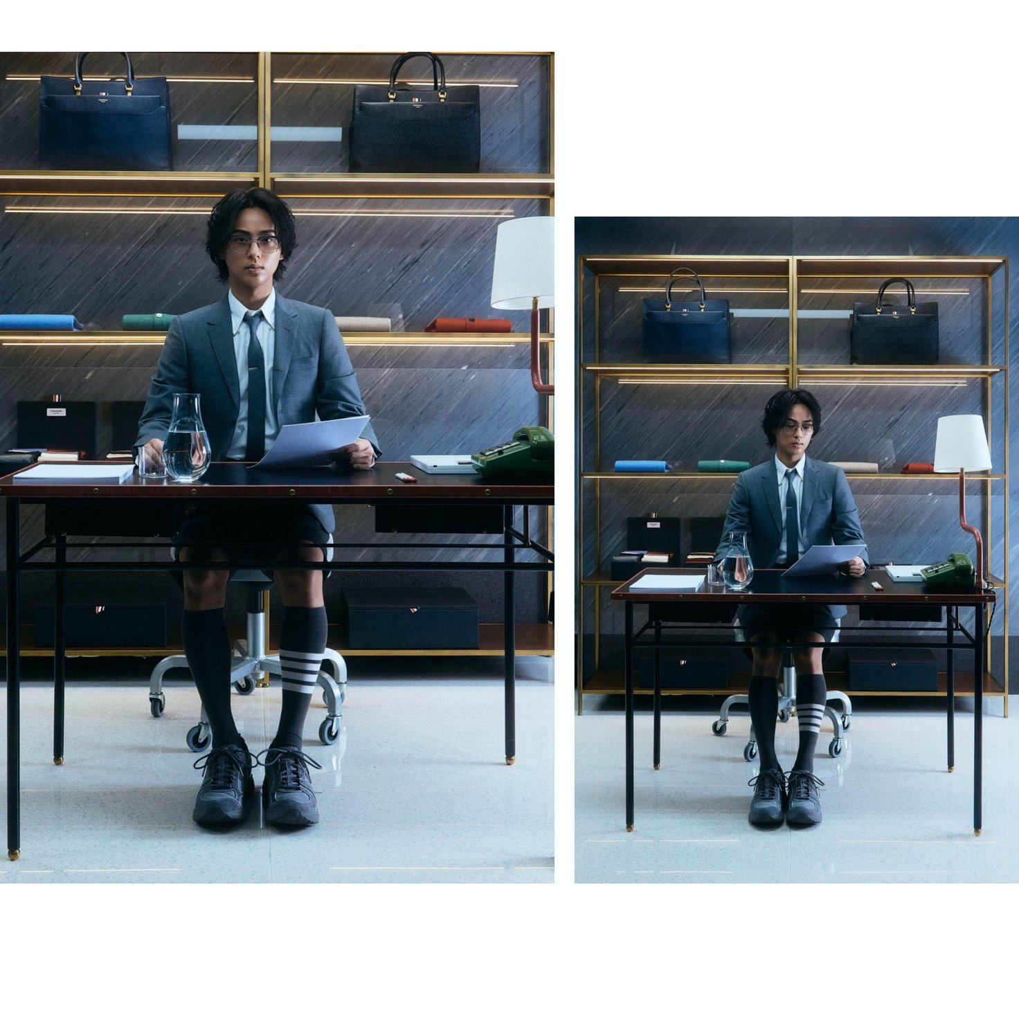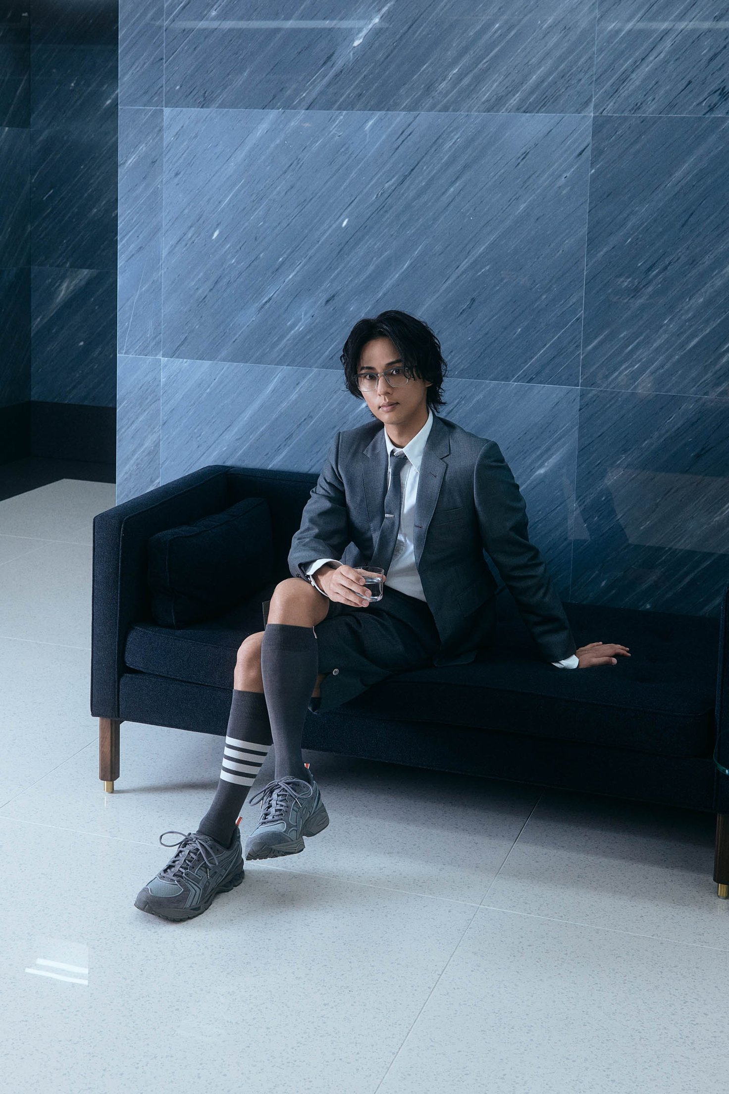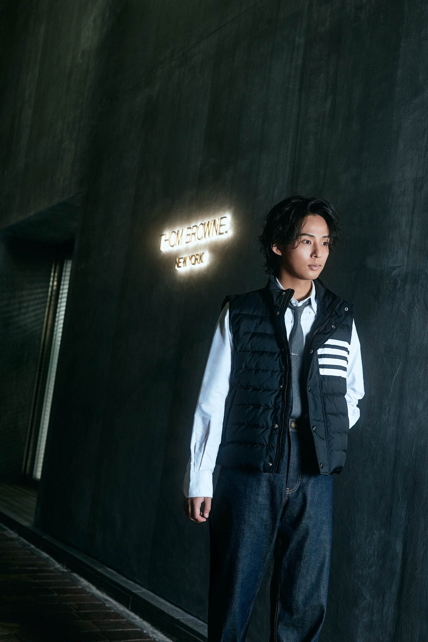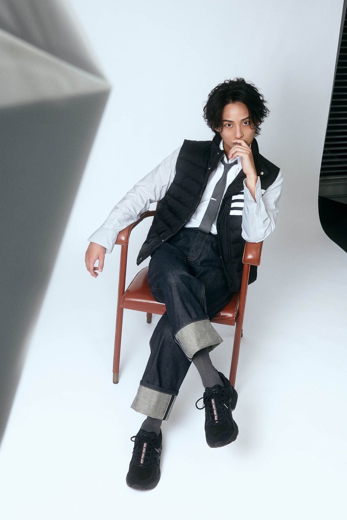古着を取り入れたアメカジスタイルから、エレガントなジャケットスタイルまで、幅広いスタイルを自分らしく着こなす藤ヶ谷にとっても、トム ブラウンのスリムフィットなシルエットやハーフパンツスタイルは新たな挑戦。その姿は、彼の素直な眼差しをありのまま描き出す。