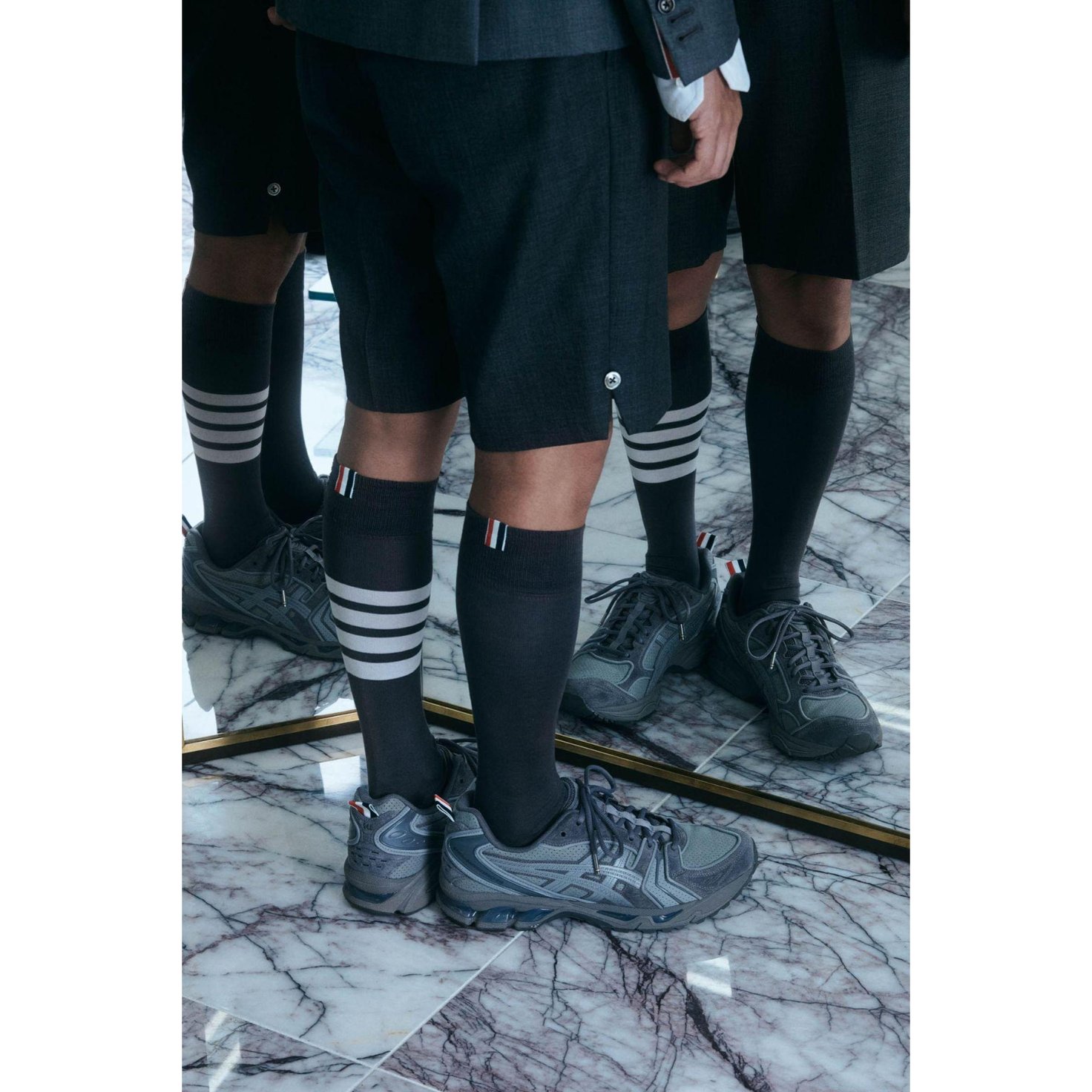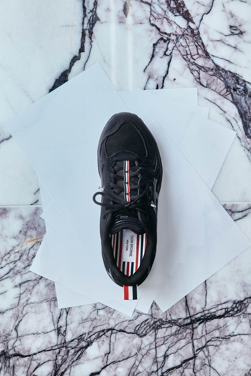 トム ブラウンがスポーティなハイテクスニーカーを発表するのは今回が初めて。アシックスの人気モデル「GEL-KAYANO」をベースに、トム ブラウンらしいテーラードの要素を加え、アッパーの一部にはスエードを採用している。