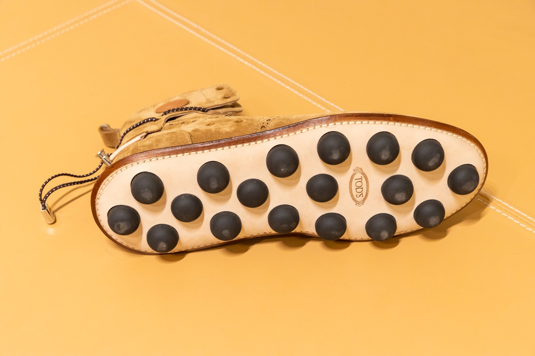 形状のユニークさが際立って見えてしまうかもしれませんが、これはトッズが長年かけて作ったアイコニックなペブルや既存のゴンミーニのイメージが存在し機能してのデザインなので、そういった文脈を無視して我々が根も葉もなく「こういったソールを作りました」と言っても全く機能しない。両社のコラボだからこそ意味があって成立するデザインなんですよね。