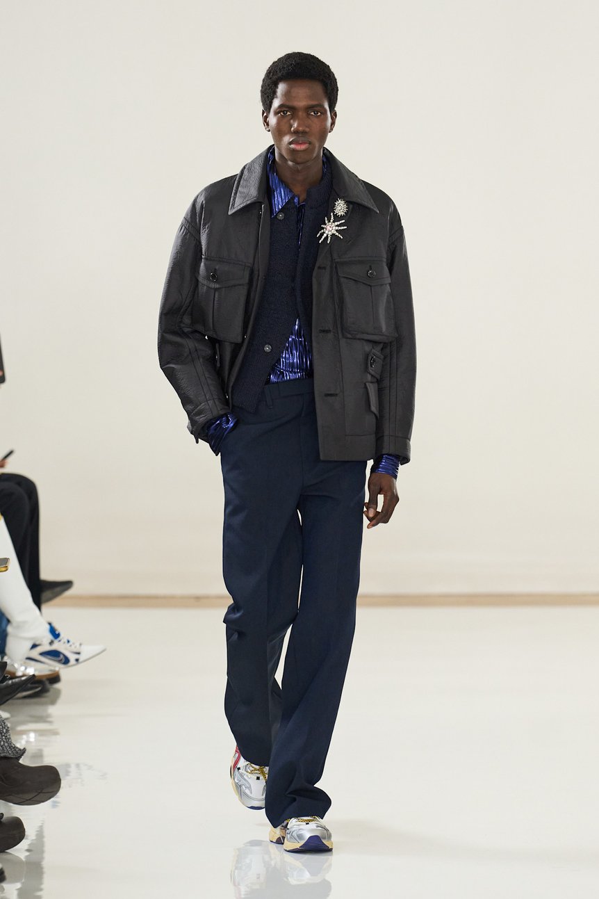 足元には、新たにアシックスとのコラボレーションスニーカーが登場。今までトーガといえば、ヒールやローファー、ブーツなどフォーマルシューズで足元を引き締めていた中、あえてフォーマルウェアにスニーカーをスタイリングすることでより新境地を強調していたように見えた。ジュエリーでは、開きっぱなしのシガレットライターのようなネックレスがラフに首元にかかり、小物やディテールからもフォーマルに対して遊び心のある揺さぶりをかけてくる。まるで私たちに「これはフォーマルと言える?」と無邪気に問いかけてくるように。