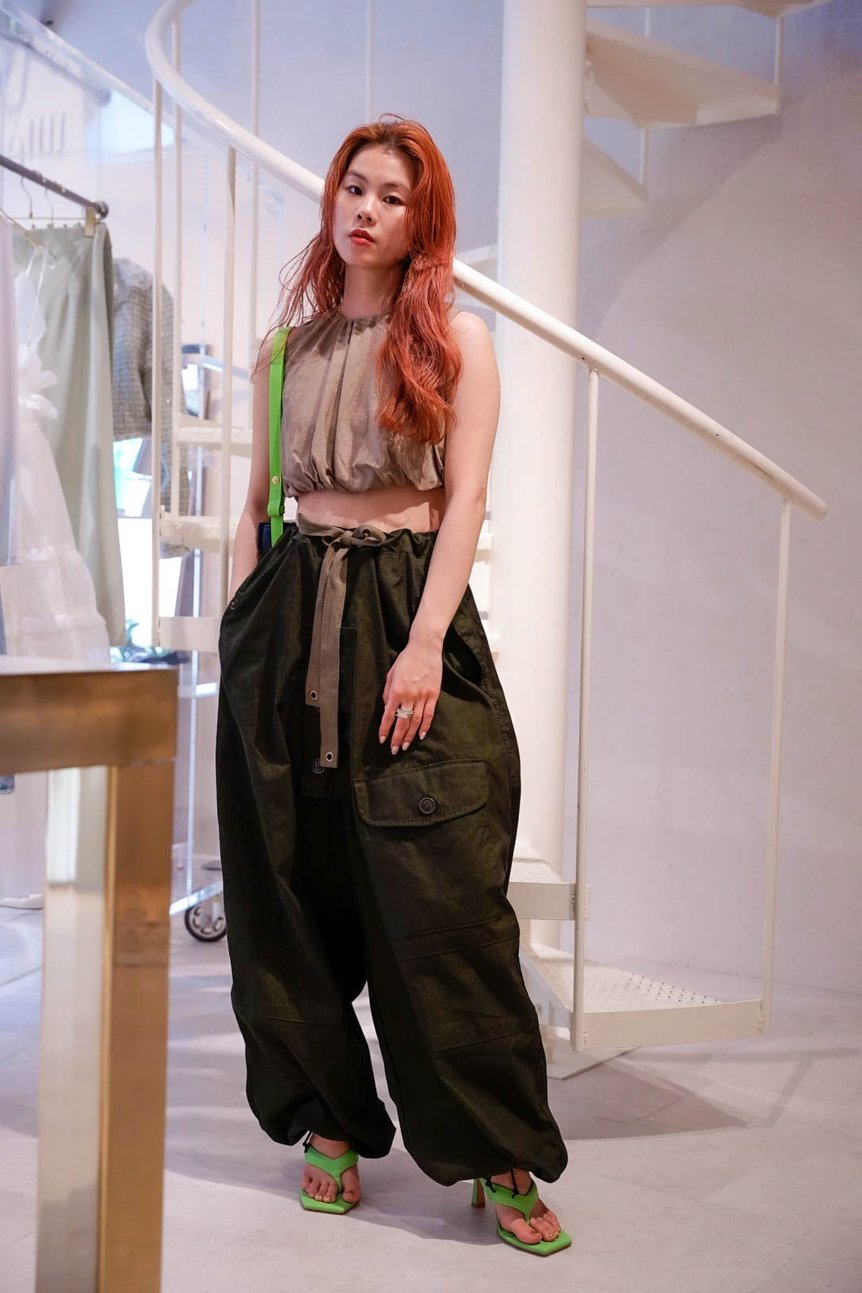 タイトなへそ出しトップスとワイドパンツを組み合わせてAラインシルエットを