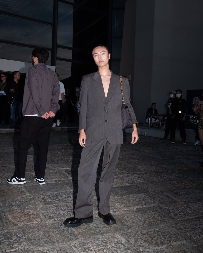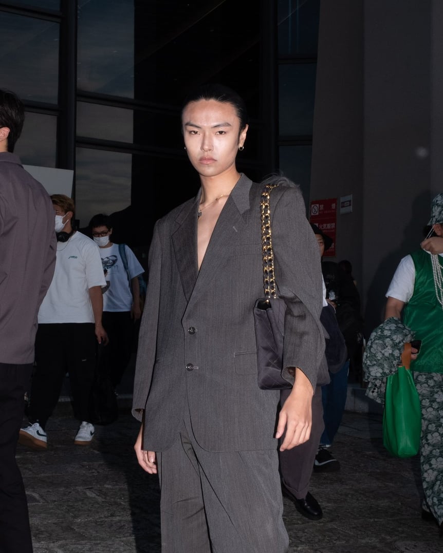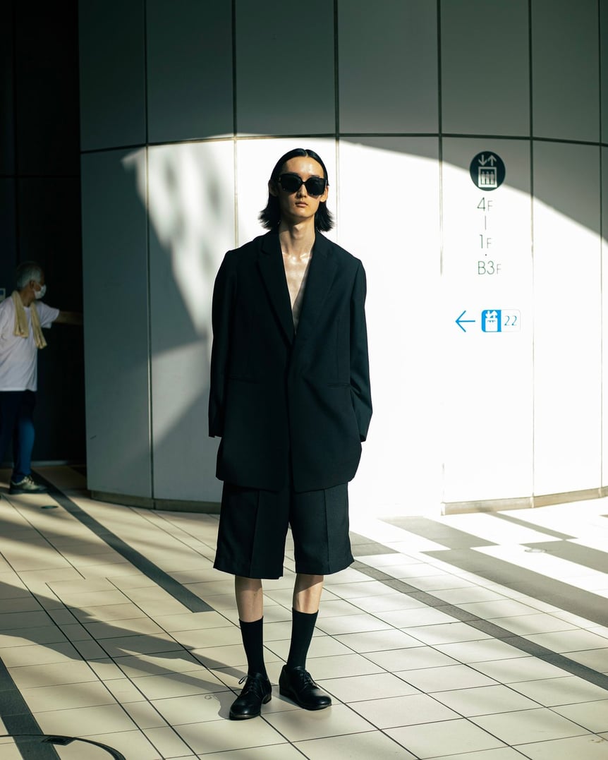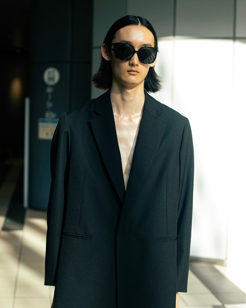 ファッションショーのルックや、海外セレブがレッドカーペットで裸に直接タキシードを着たりと、時々見かけることのある裸に直接ジャケットを羽織るスタイル。ハードルの高い着こなしではありますが、東京のファッションフリークたちはそれぞれ自分流のスタイルに取り入れています。ゴールドのチェーンが印象的な「シャネル(CHANEL)」のバッグや、大ぶりなサングラスなどと合わせたスタイリングが目立ちました。