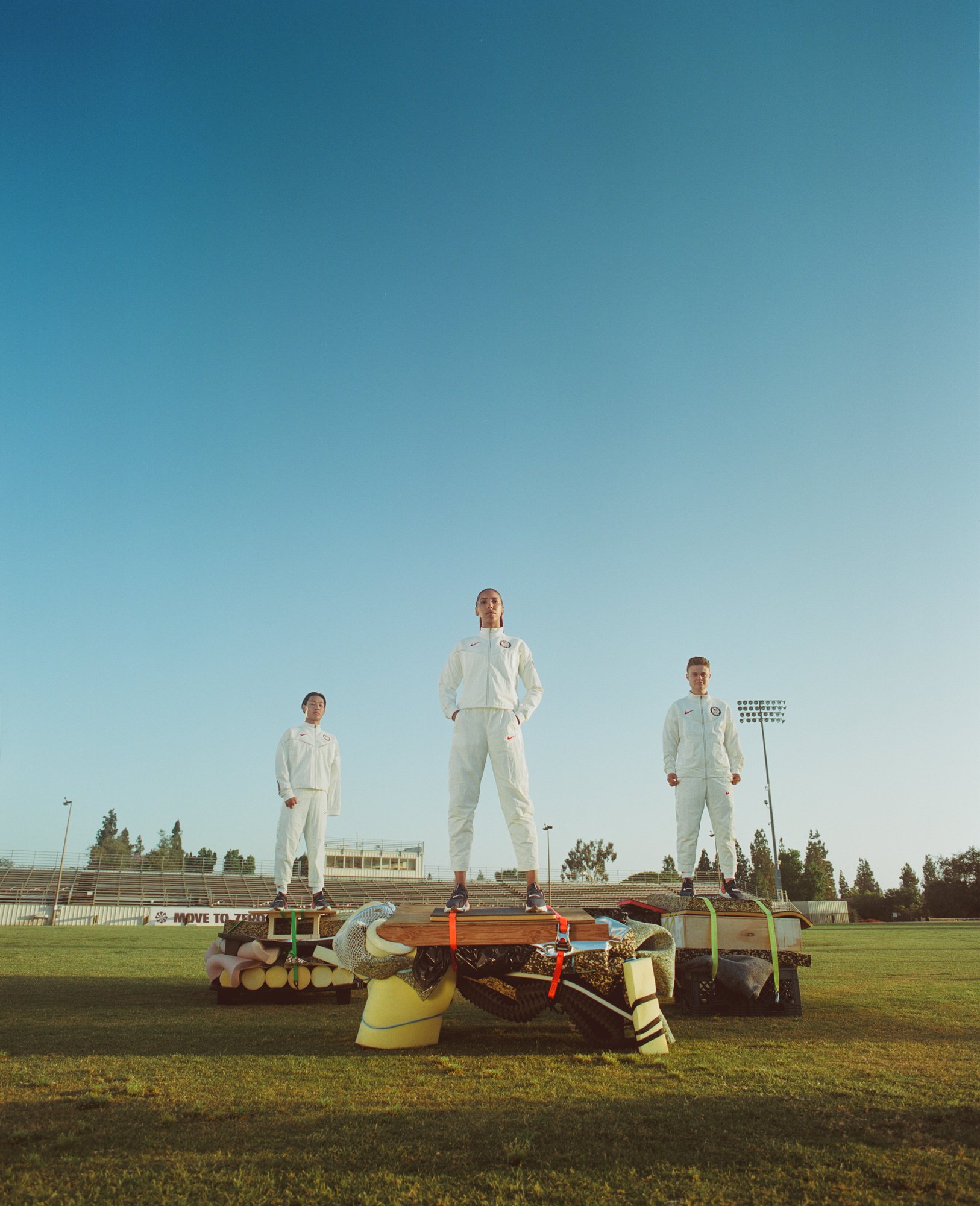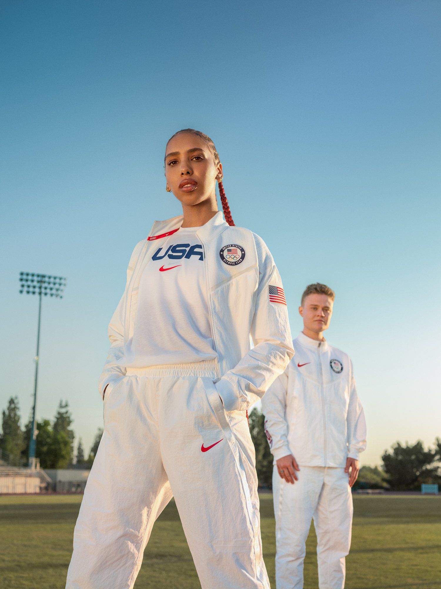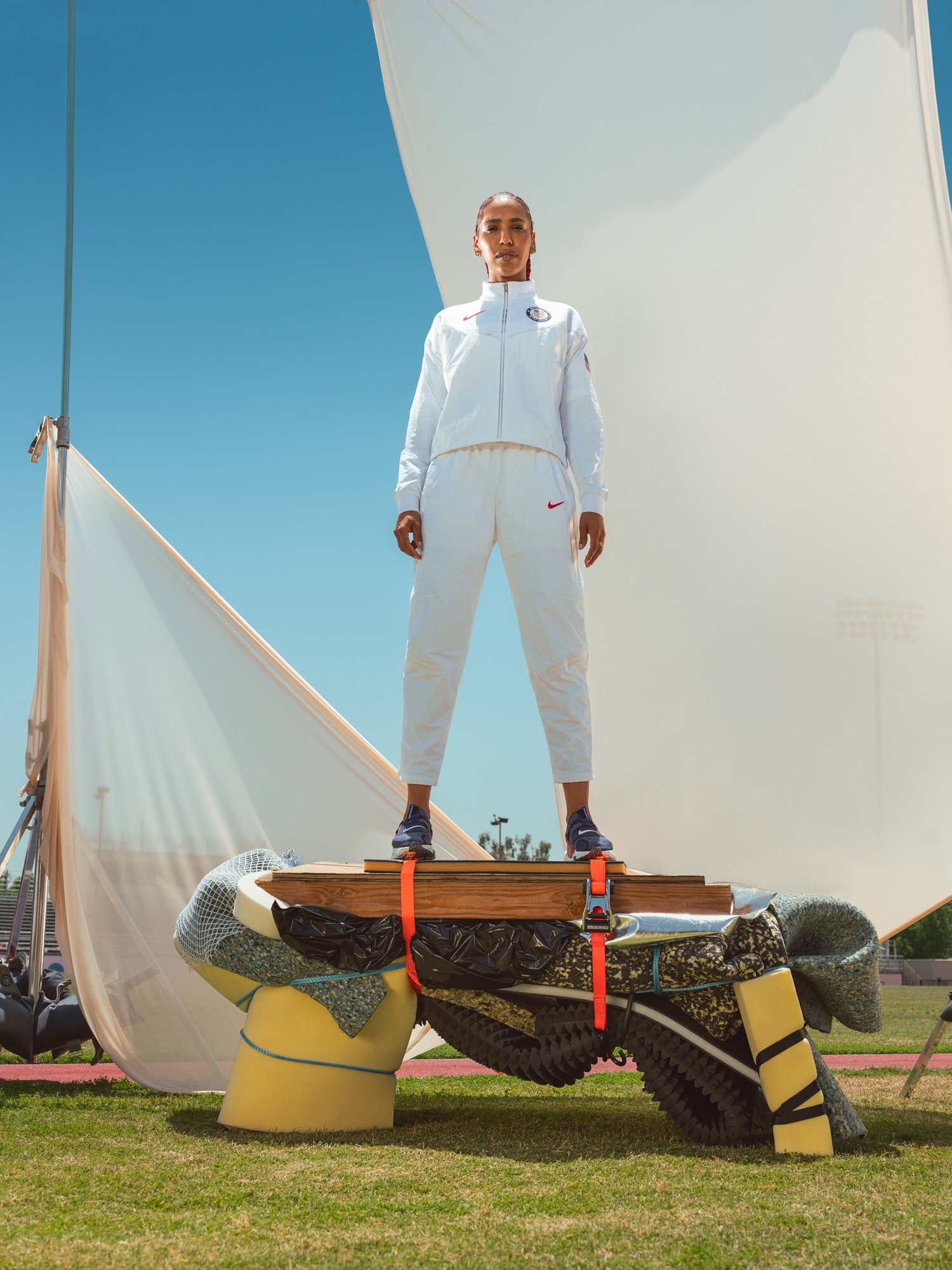 表彰台では、再生素材をインスピレーション源にしたナイキのメダル スタンド コレクションとエア ヴェイパーマックス2020を着用。ジャケットは日本の着物を参考に胸元のV字の切り替えが特徴で、背面のUSAロゴやパンツのドローコードの先端、ジッパーのつまみなどには再生素材のナイキ グラインド素材を使用しています。