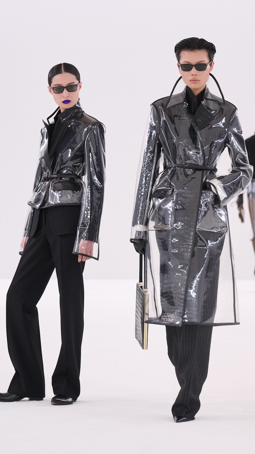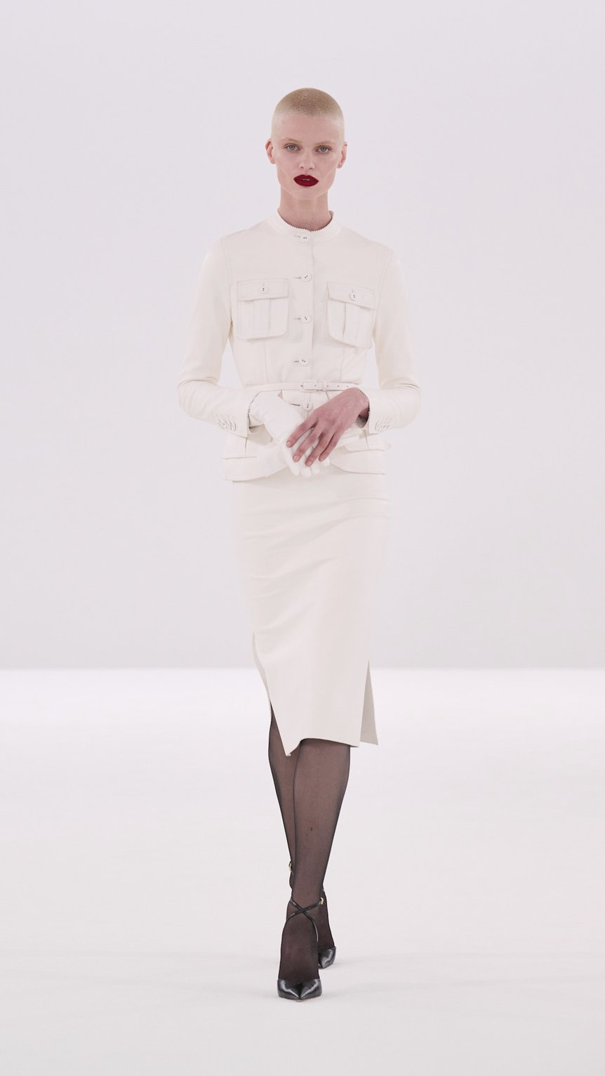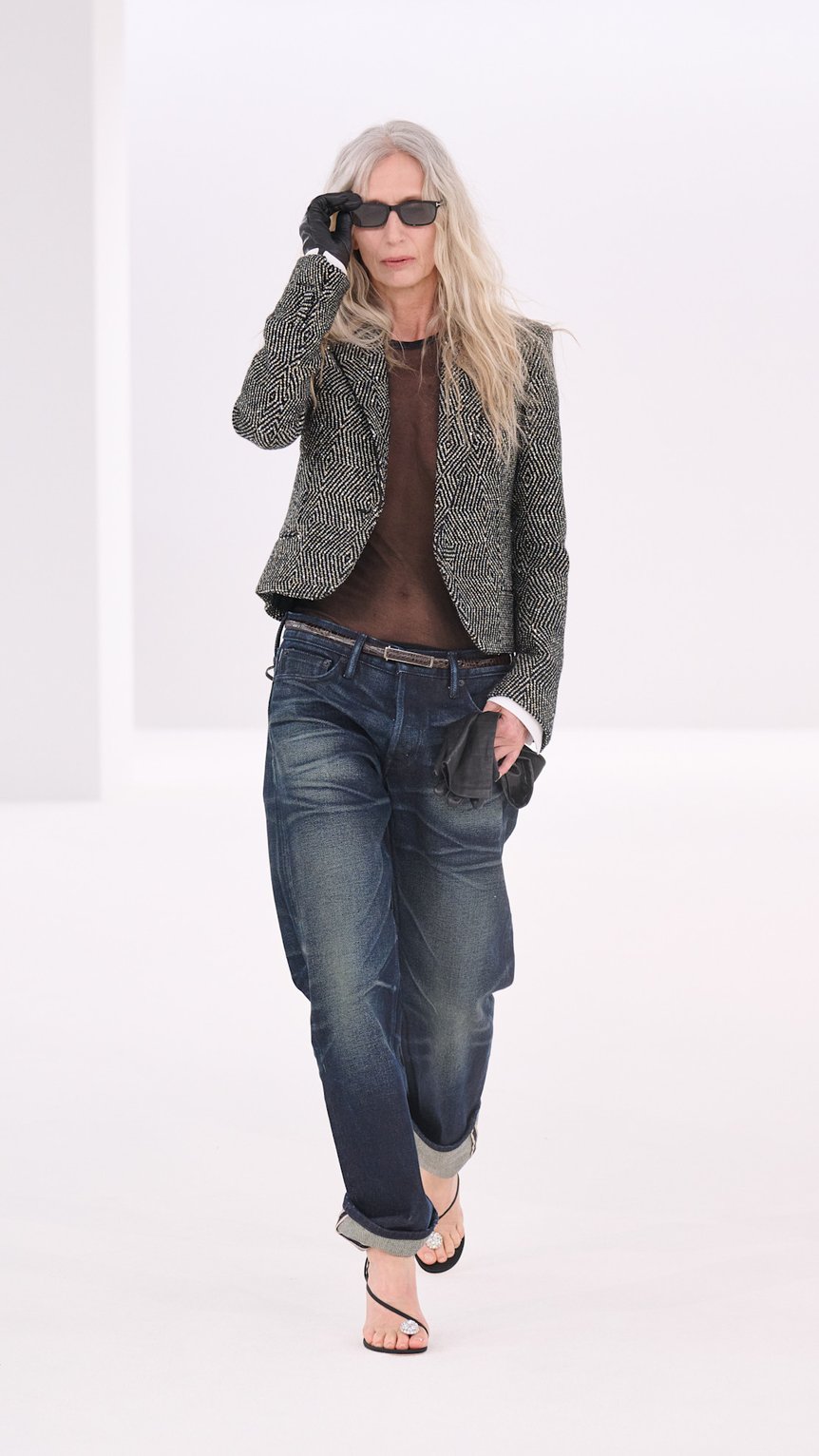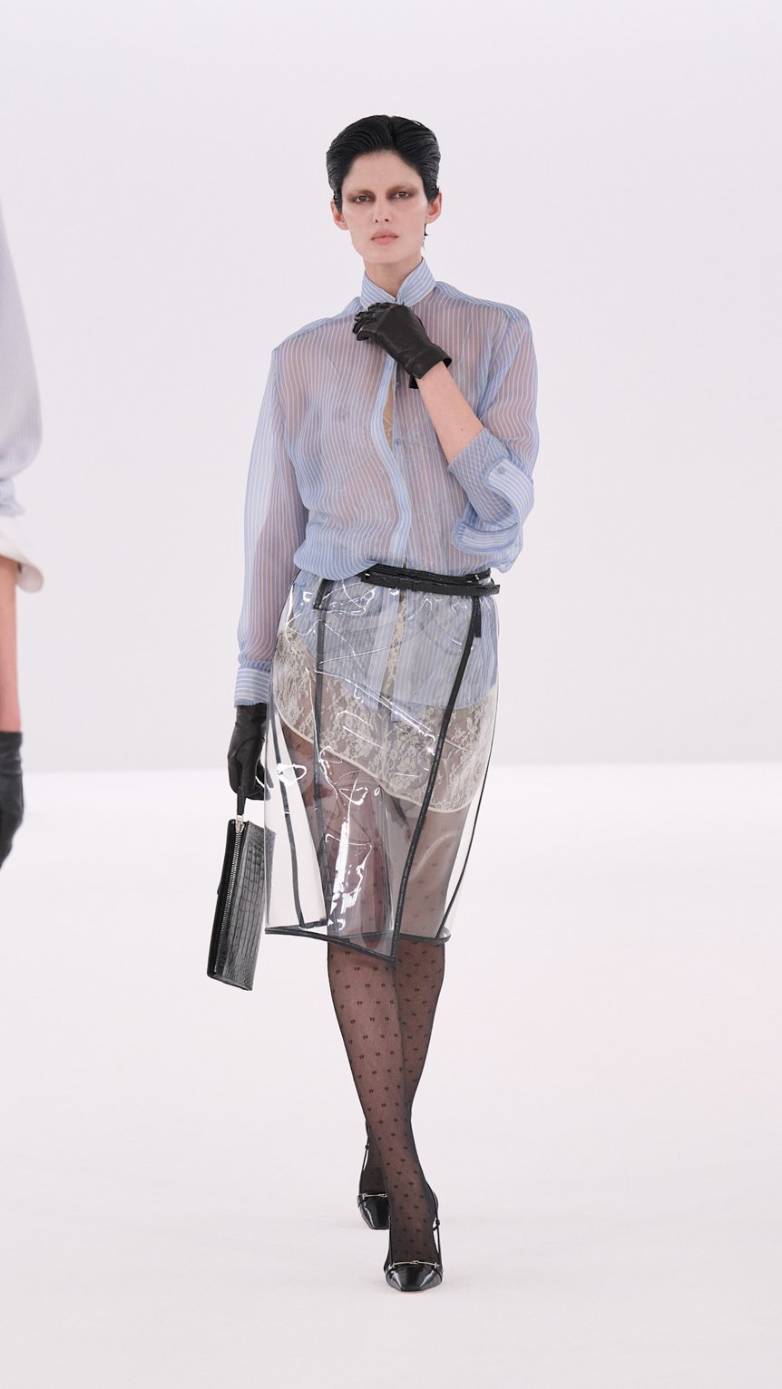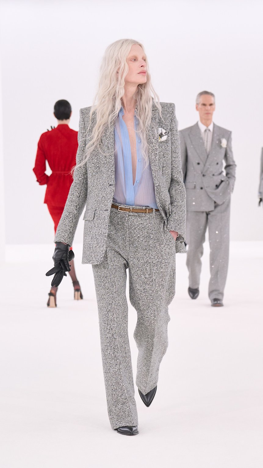 個性豊かなモデルたちは、バッグに新聞や花を忍ばせ、紳士淑女の嗜みを匂わせる。片手だけにはめたレザーグローブの所作、交差する視線と仕草——アティチュードそのものをスタイルへと変える。服が人に着せられるのではなく、人が服をまとい、生きる。その純粋な営みの中に、ハイダー・アッカーマンが描くトム・フォードの官能性とエレガンスが立ち現れていた。