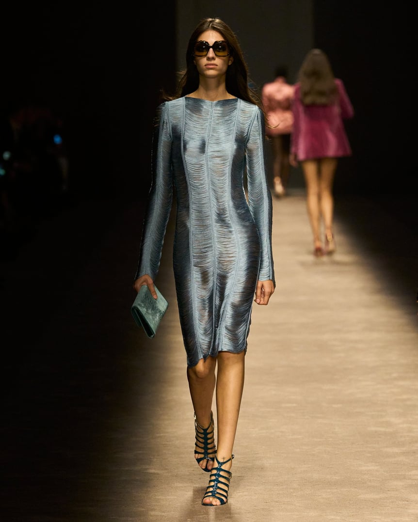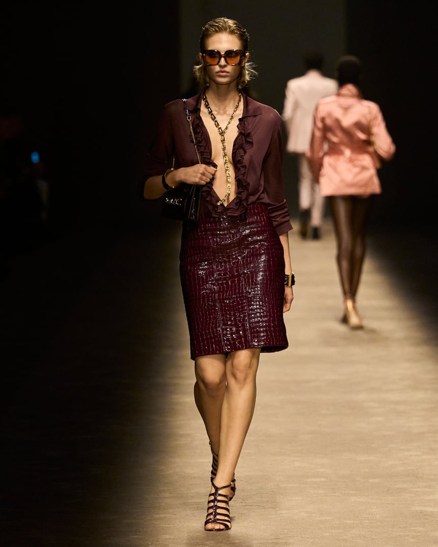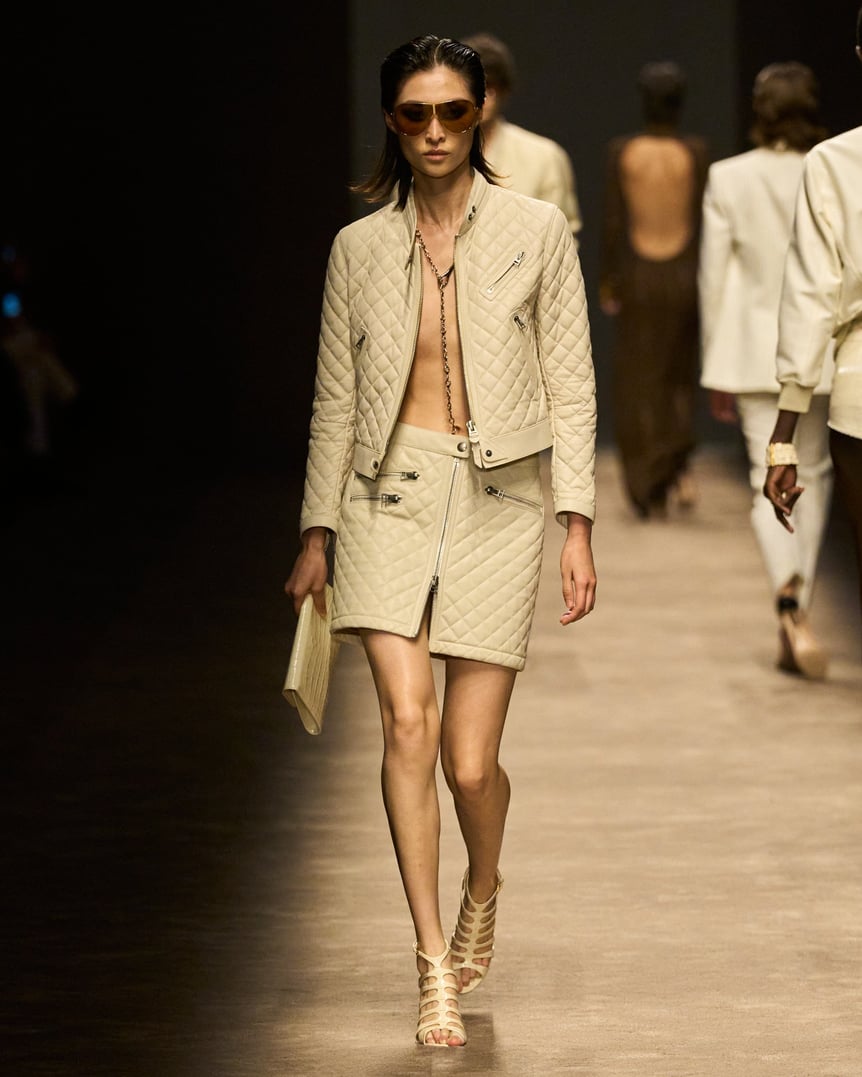 2024年サマーウィメンズコレクションは、アンディ・ウォーホル(Andy Warhol)や写真家のリチャード・アヴェドンのミューズとして、60年代から70年代初頭にかけて活躍したデトロイト生まれの黒人モデル、ドニエル・ルナ(Donyale Luna)からインスピレーションを得て製作。ショーは艶感あるクロコダイルの型押しのレザーコートのルックでスタートし、ゴールドのタッセル付きショートパンツや、キルティングのブルゾンとショートパンツ、フェザーの装飾を施したスカートなどを発表。大きく穴を空けたゴールドのバックルが付いたベルトはスタイリングにアクセントを、アイボリーホワイトやコスメティックピンク、ペルシアンブルー、コニャックブラウンといった差し色は、ブラックを軸にしたコレクションに彩りを与えた。