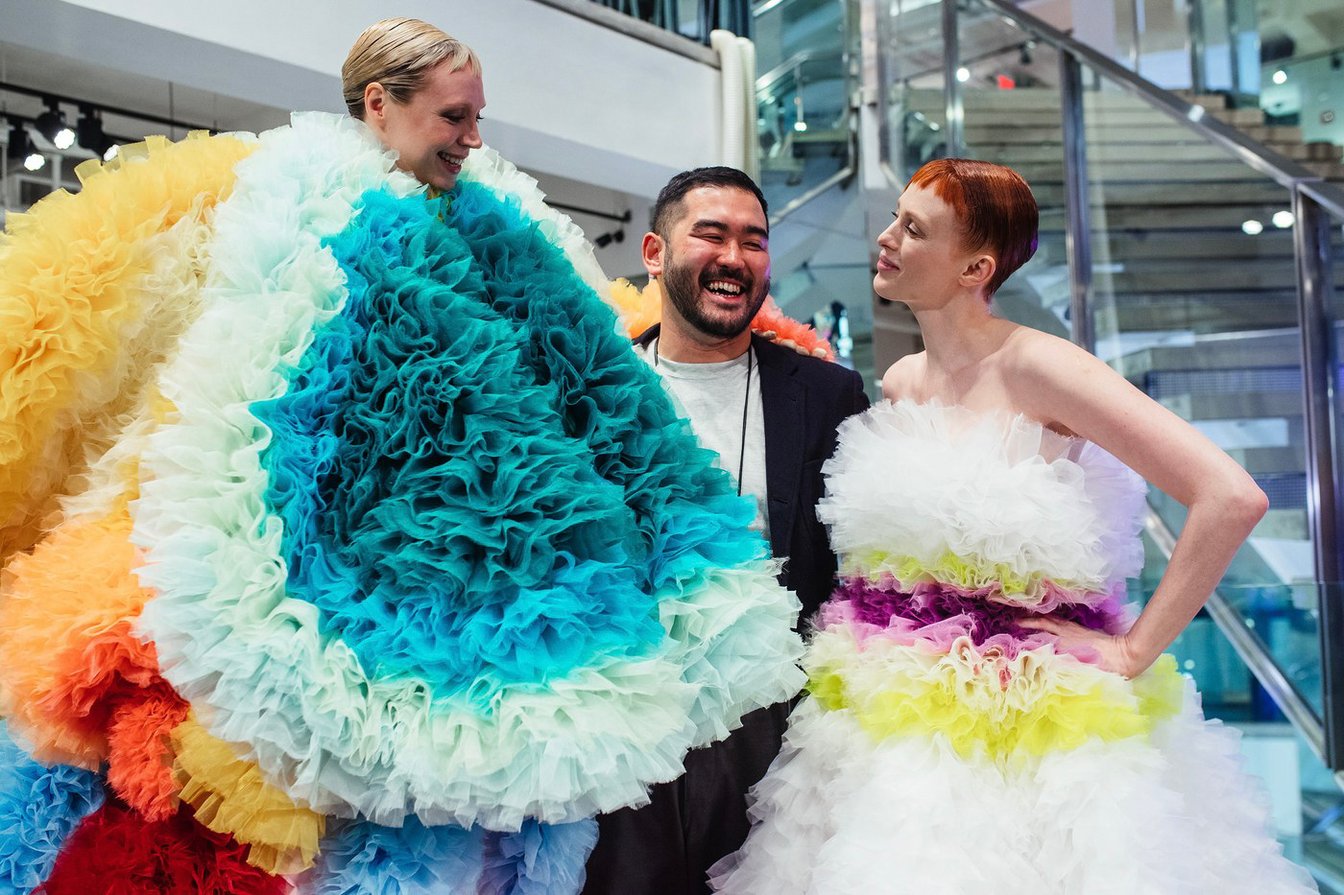 葛藤することはありました。一時期、海外を見据えて「ここのがっこう」に通っていた頃、発表会で外部の方が審査に来られるんですが「何をしたいのかわからない」と酷評されたことがあって。それで「くそ〜」と思って反骨精神というか、普段はワンレイヤーで作るドレスを3枚とか4枚とか重ねて巨大なドレスを作ったんです。後日その作品が目に留まってニューヨーク行きのきっかけになり、デビューショーのラストを飾って、メトロポリタン美術館に買ってもらい所蔵されることになった。当時はムカッとしましたけど、今となっては辛口の評価をしてくれた方に感謝ですね。思い出深いドレスです。