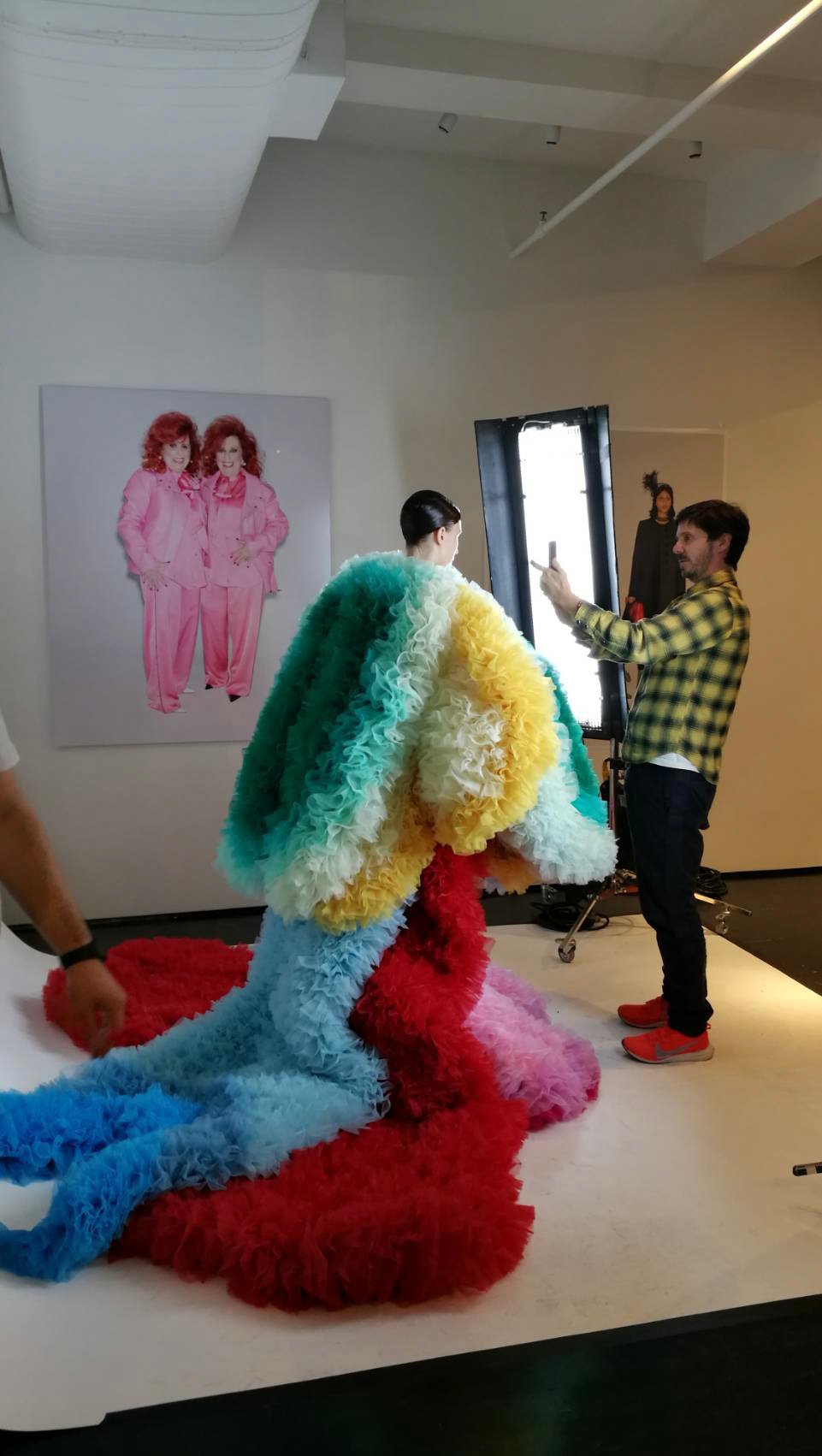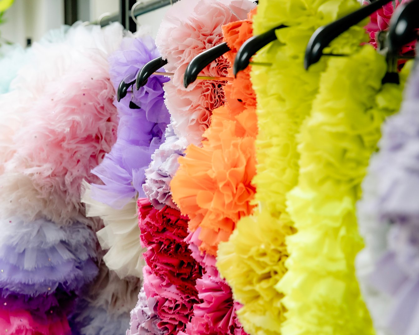 衣装の仕事の合間にポートフォリオになるような作品やサンプル作りをしていて、その時に日暮里の生地屋街でたくさん生地を買っては試していたんです。その中のひとつが安価でたくさんの色があるオーガンジーで、フリルを色々と試作しました。ドレスに使い始めたのは2015年くらいからだと思います。