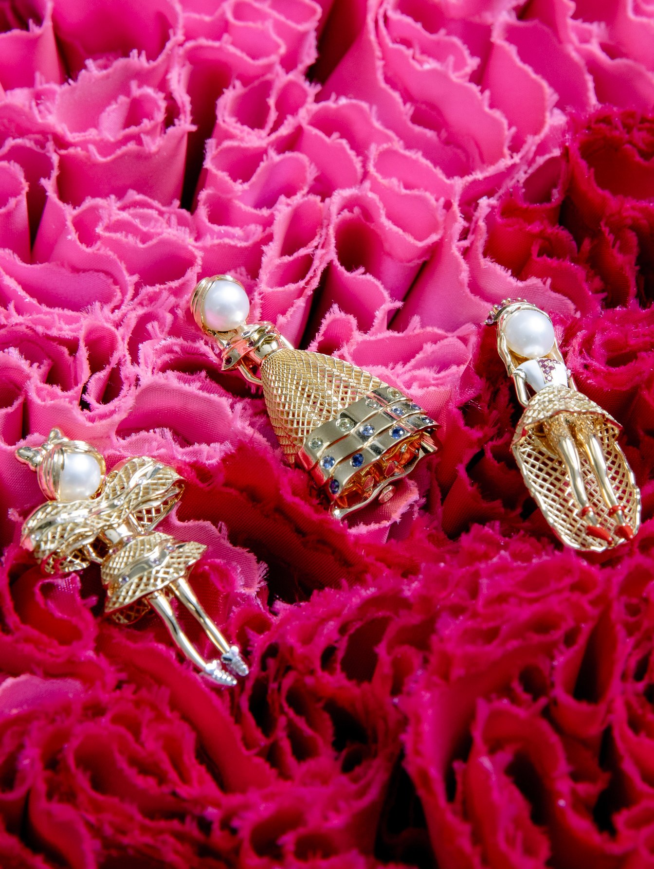 ジャン=ポール グードとのコラボレーション以来、12年ぶりとなる「フレッド」のフレディズの新作「フレディズ トモズドールズ」。ブランドとして初めて日本人デザイナーとのコラボレーションとなった。展開はペンダントにもなるブローチ3型で、写真左から「シュシュ」「チュチュ」「フルフル」。