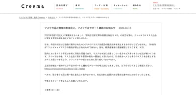 マスクの販売そのものを止めるプラットフォーマーもいたが、僕らは管理を徹底した上で逆に販売を強化する方針に振り切った。あの状況で高い値段で使い捨てマスクが転売されているのは本当に腹が立ったからです。当時、手作りマスクの販売を継続することに賛否両論があったかもしれないが、クリエーターの力で社会の課題を解決する一つの機会になったし、このタイミングでクリーマを使ってくれたユーザーさんはリピートしてくださっていることも分かっているので、判断は正しかったと思う。