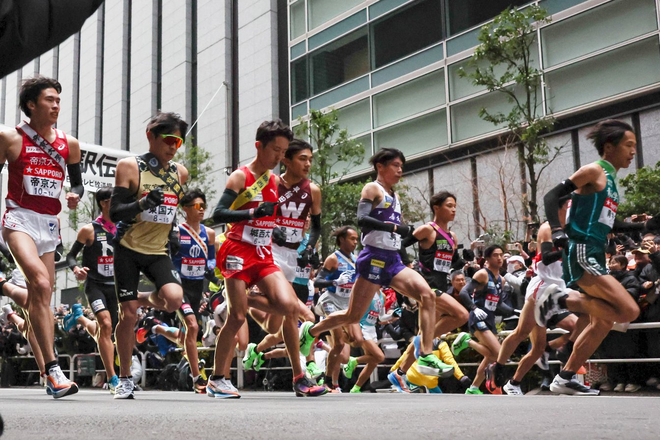 2026年の箱根駅伝往路スタート地点。アシックスのグリーンのシューズ「メタスピード」が目立った。
