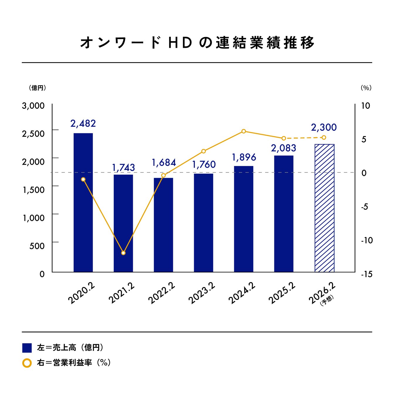 1927年、樫山純三氏が樫山商店として創業。1947年に樫山株式会社を設立。1960年、東京・大阪・名古屋各証券取引所第2部に上場し、1964年に同証券取引所第1部に上場指定替え。1988年、オンワード樫山に社名変更。2007年にはホールディングス制に移行し、オンワードホールディングスに商号変更。2022年に東京証券取引所の市場区分見直しにより市場一部からプライム市場に移行。2025年2月期の業績は売上高が前期比9.9%増の2083億円、営業利益が同9.8%減の101億円、純利益が同28.8%増の85億円。