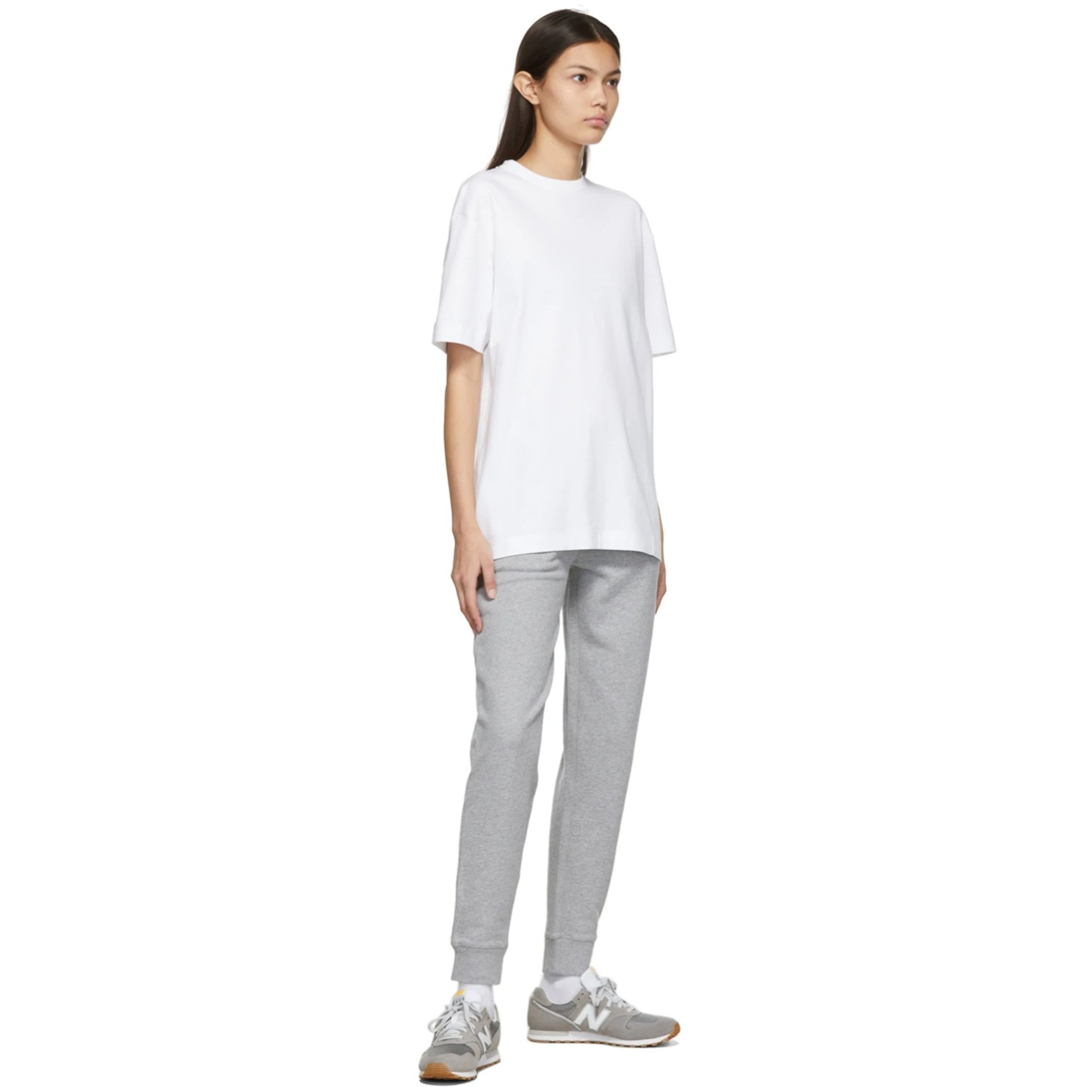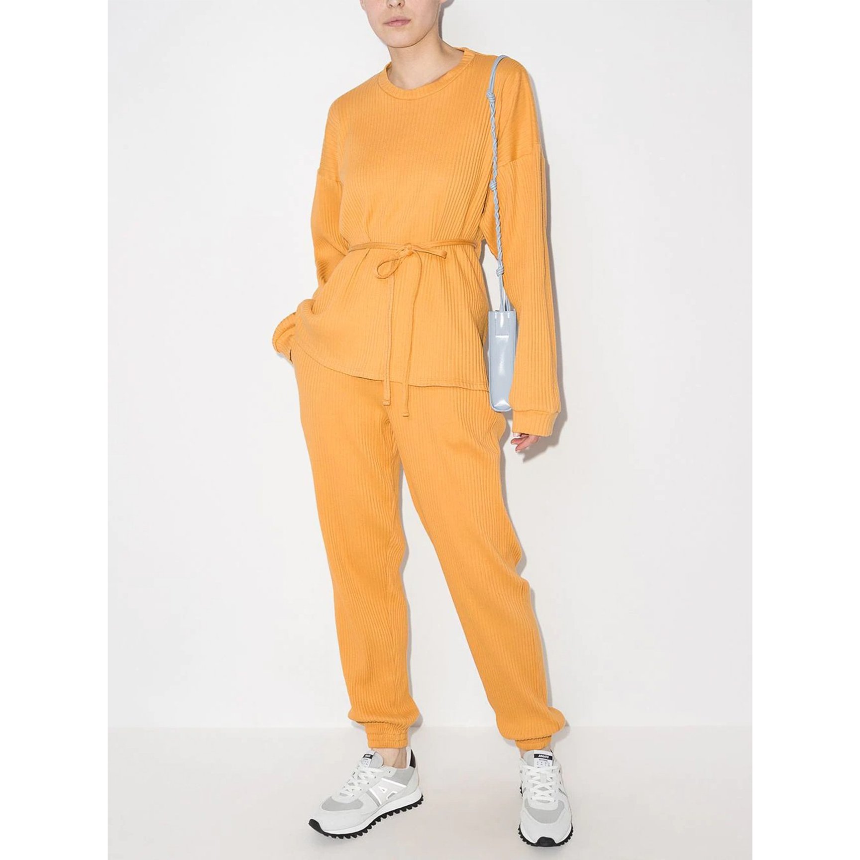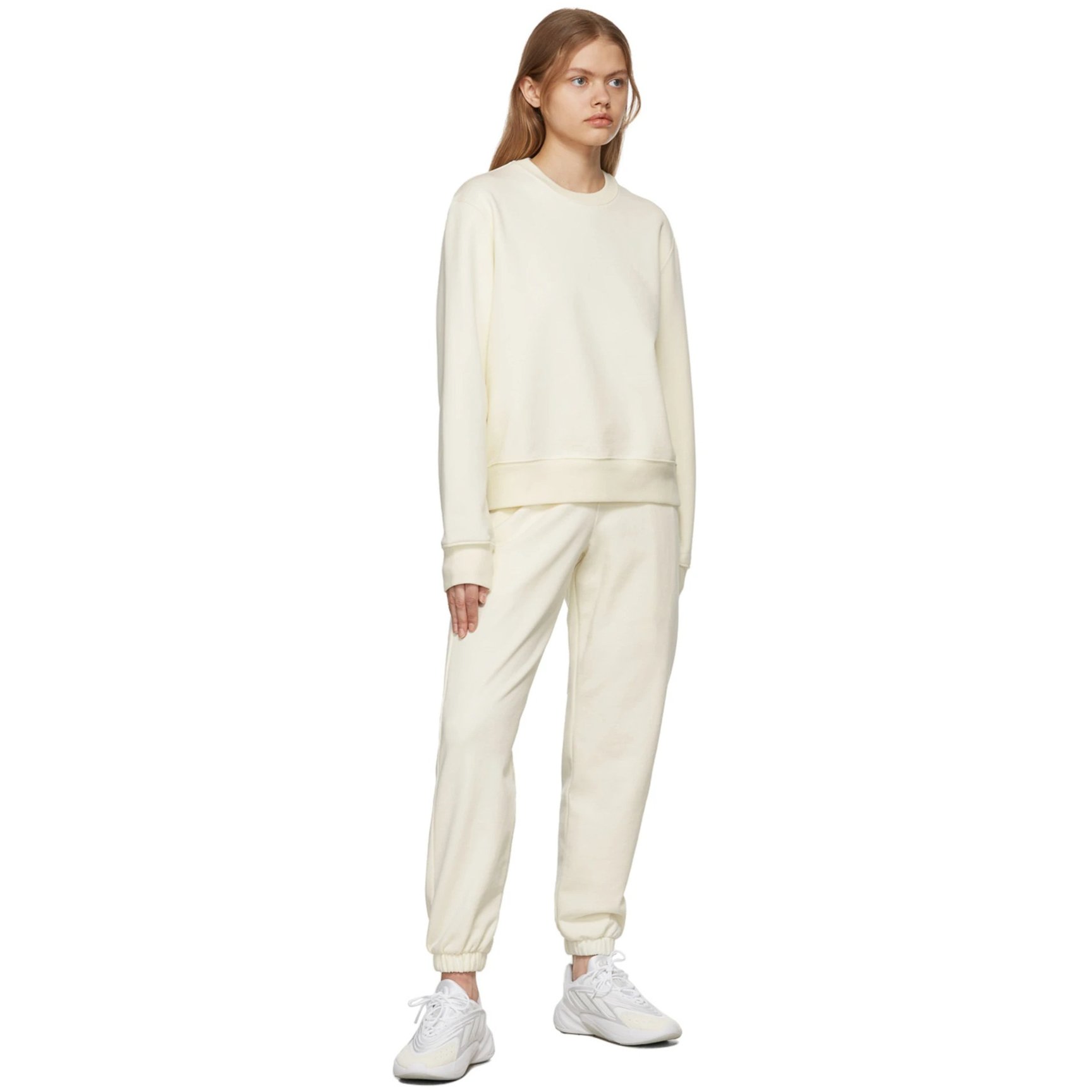 清潔感のあるオフホワイトのトラックパンツは「ワードローブ エヌワイシー(WARDROBE.NYC)」のもの。イタリアで製造した高品質な素材のアイテムを限定数のみ生産、長く愛用できるベーシックなデザインで消費サイクルを減らし環境に配慮したウェアが魅力です。