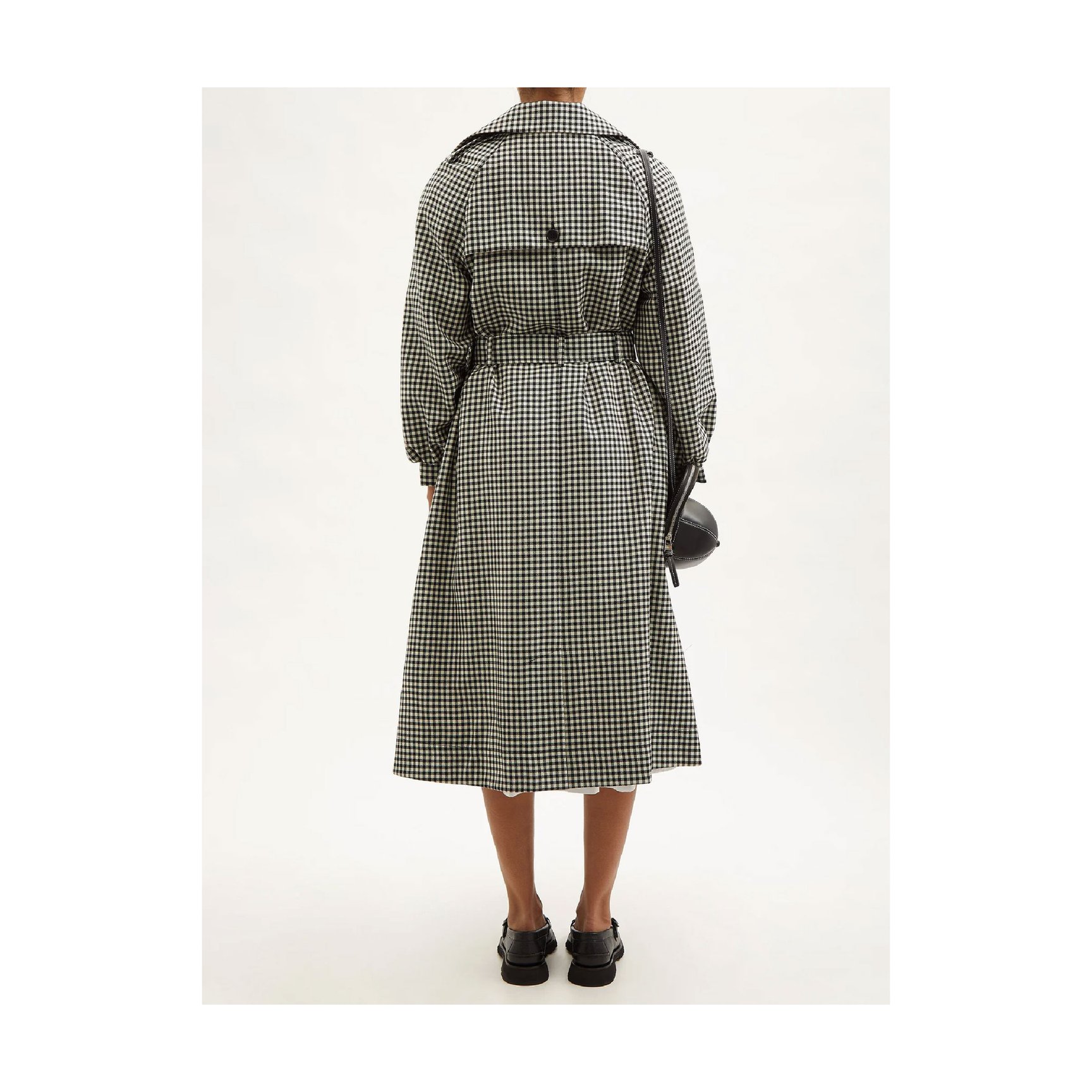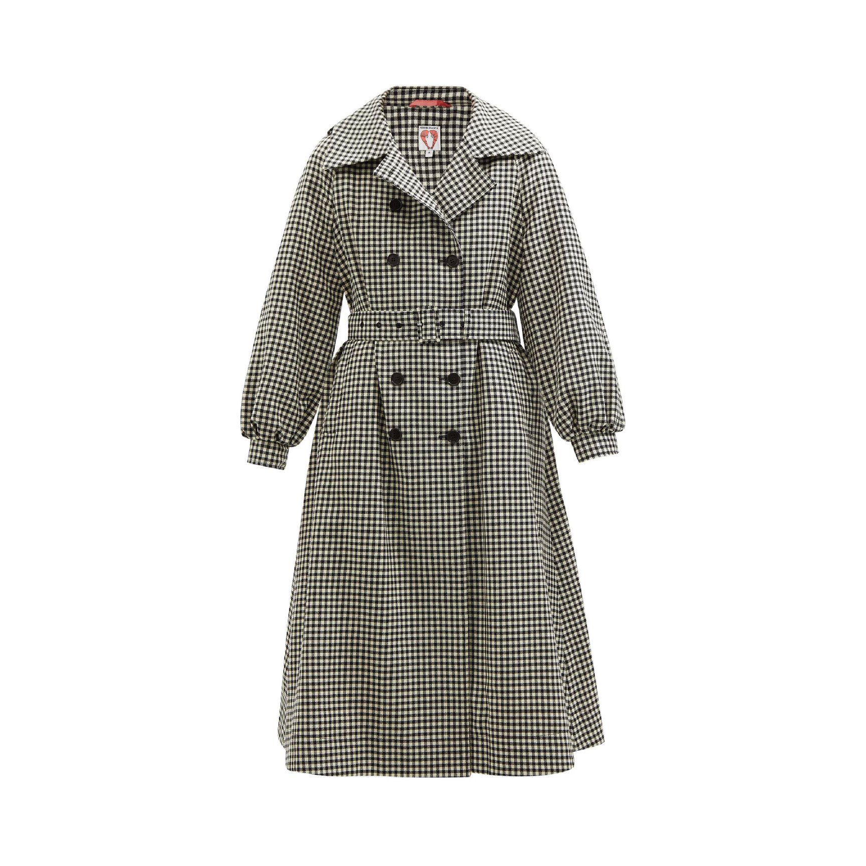 「シュリンプス(Shrimps)」のトレンチコートは、ブランク&ホワイトのチェックをあしらった女性らしい1着。ウールツイードを使用したダブルブレスシルエット、そしてベルト付きウエストでシックな印象を与えてくれます。