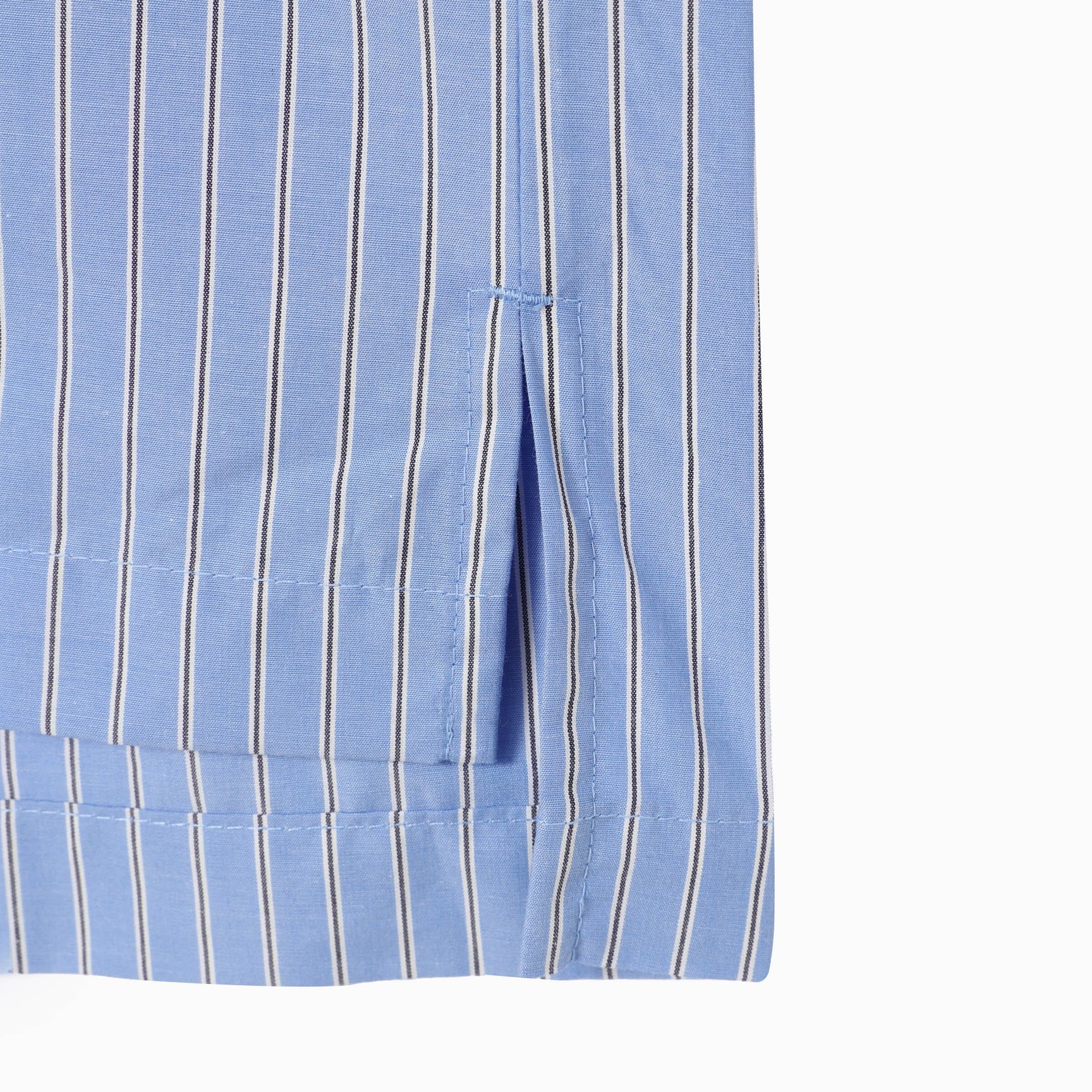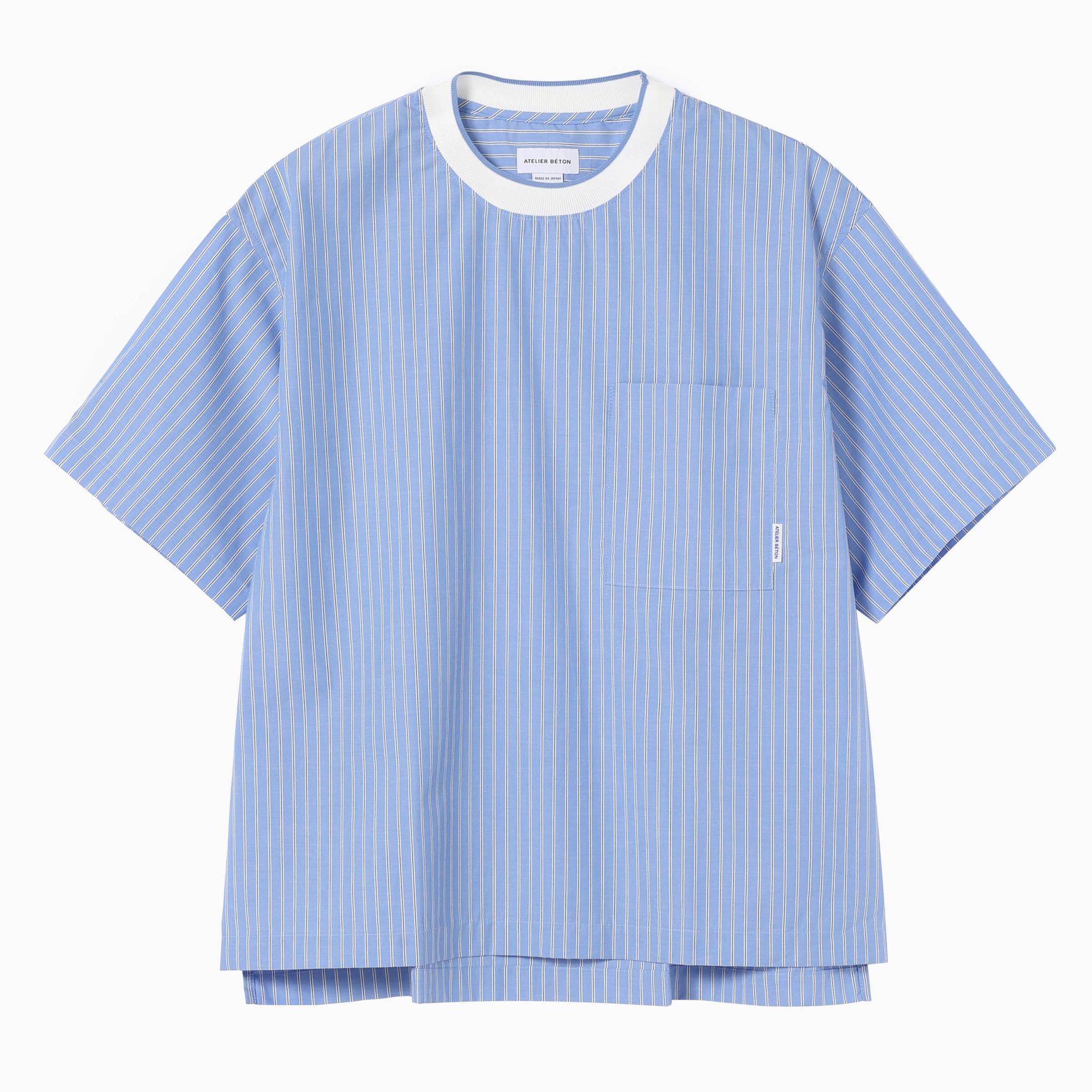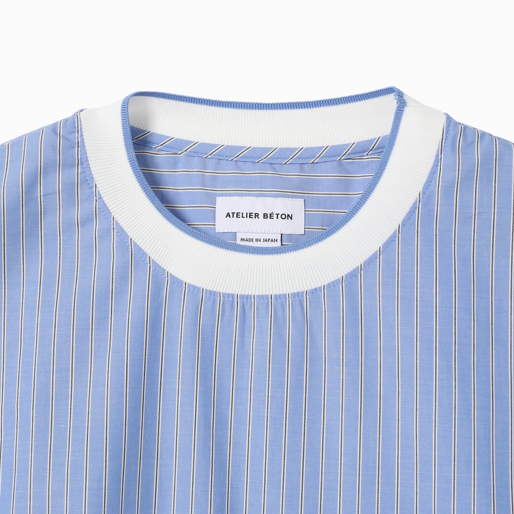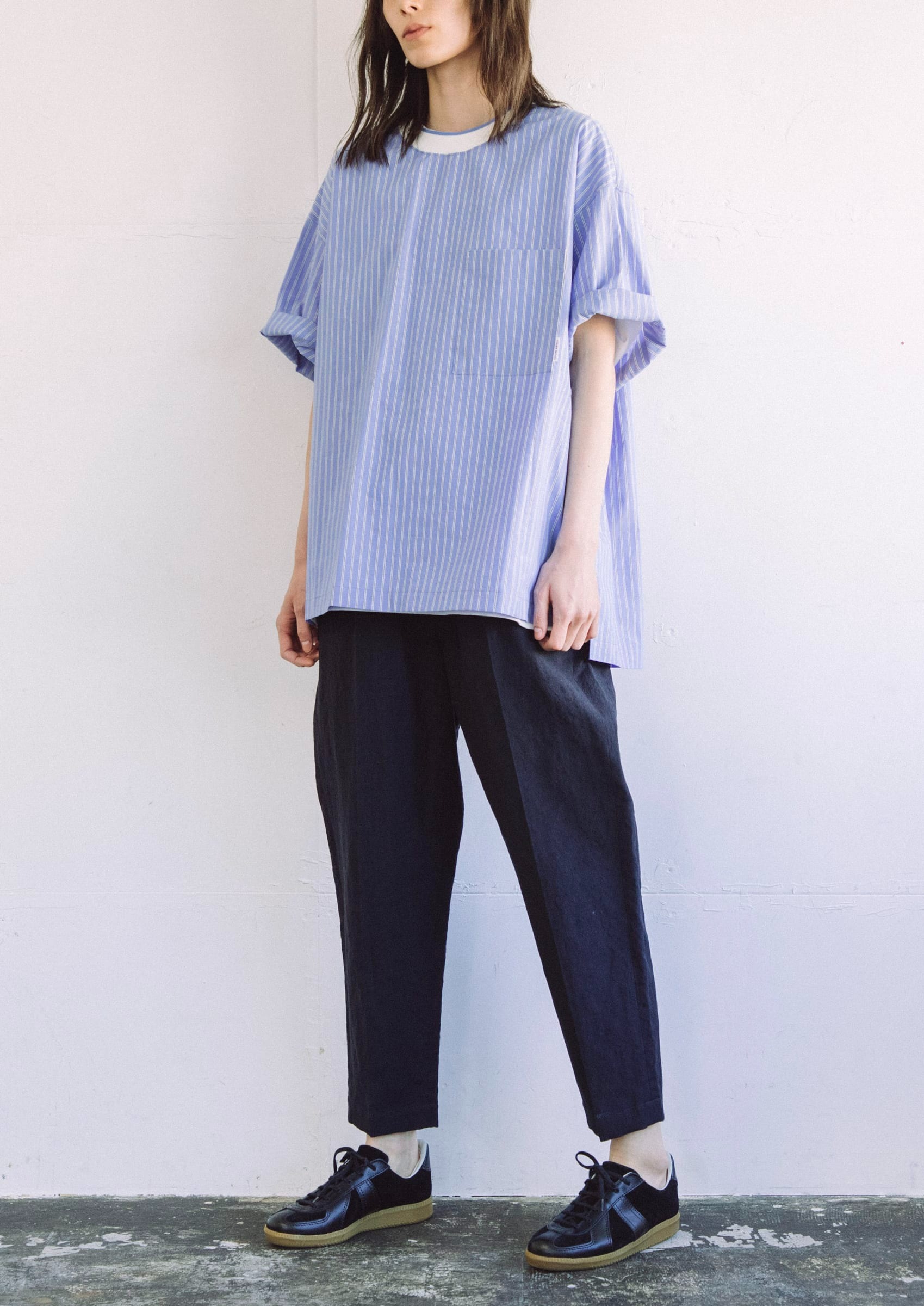 オーバーサイズのボックスシルエットが印象的なTシャツは「アトリエ ベトン」のアイテム。仕上げに特殊な加工を加えているので、まるでシルクのような滑らかな風合いを実現。Tシャツなのに、シャツのようにさらっと着ることができます。ブルーのストライプ柄と相性の良いデニムやホワイト系のパンツと組み合わせると、爽やかでガーリーなコーディネートに仕上がります。