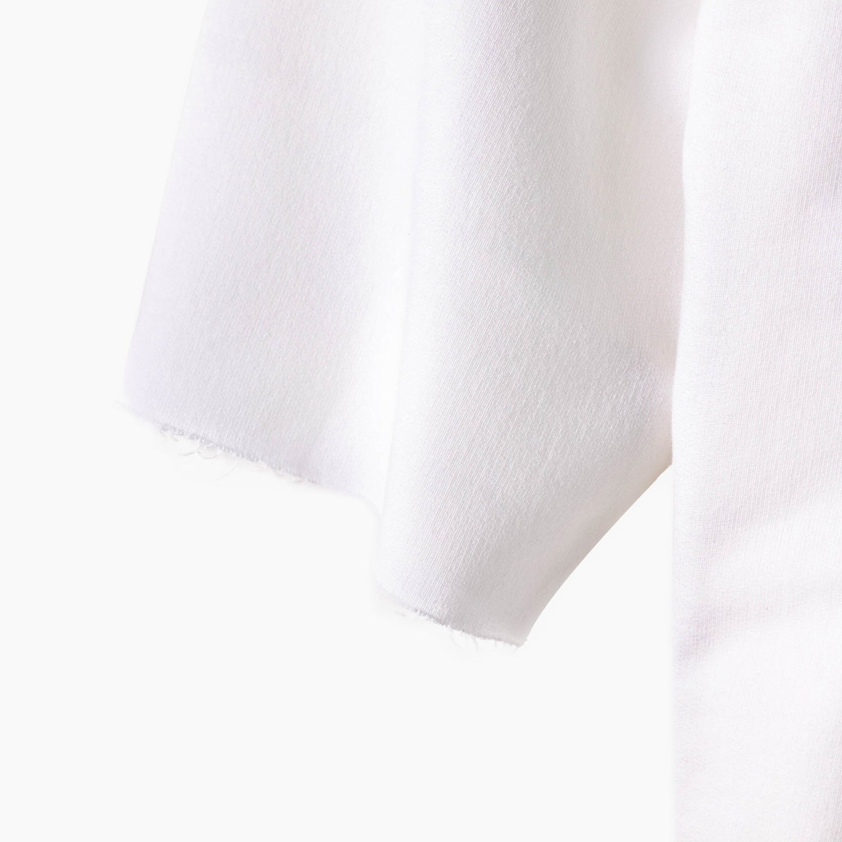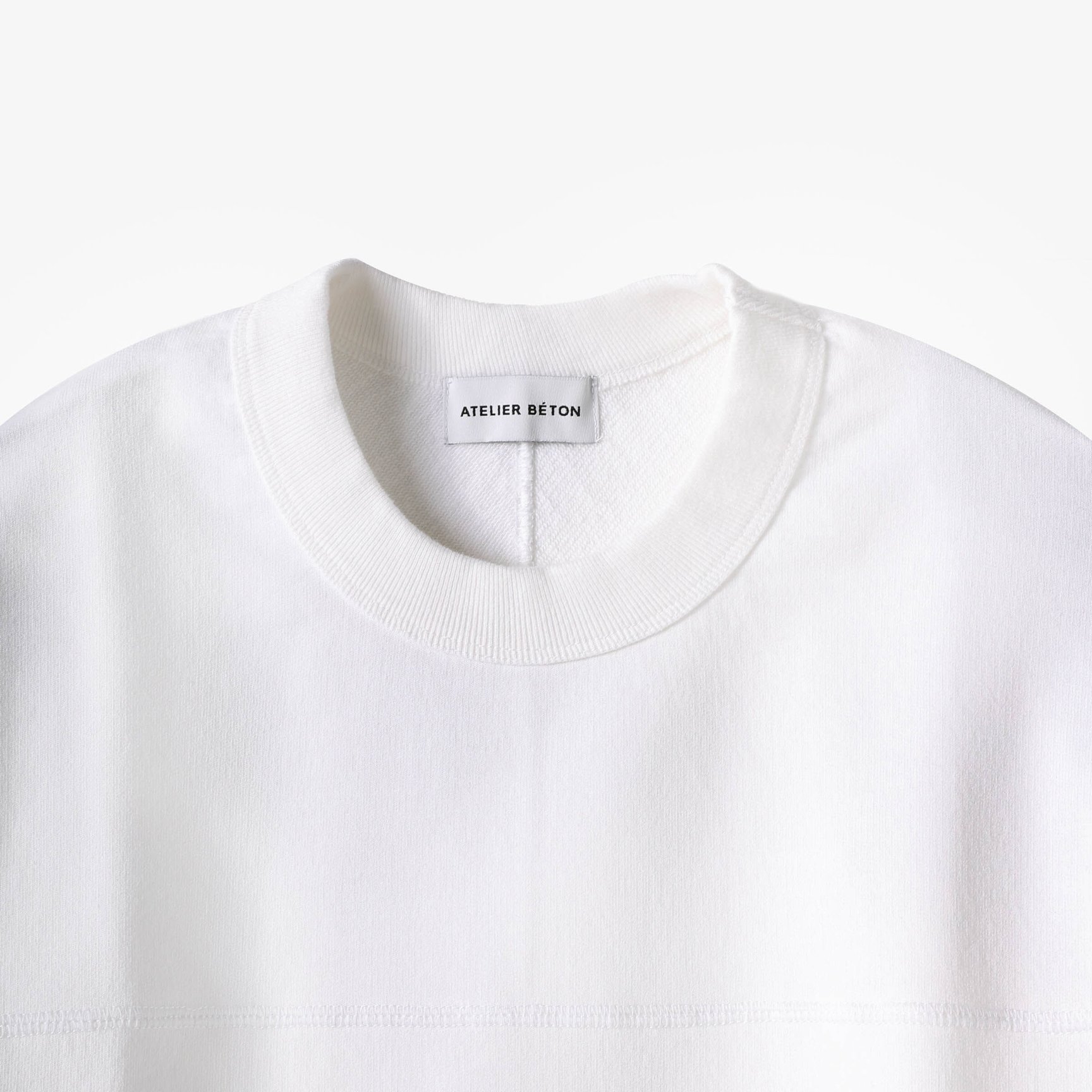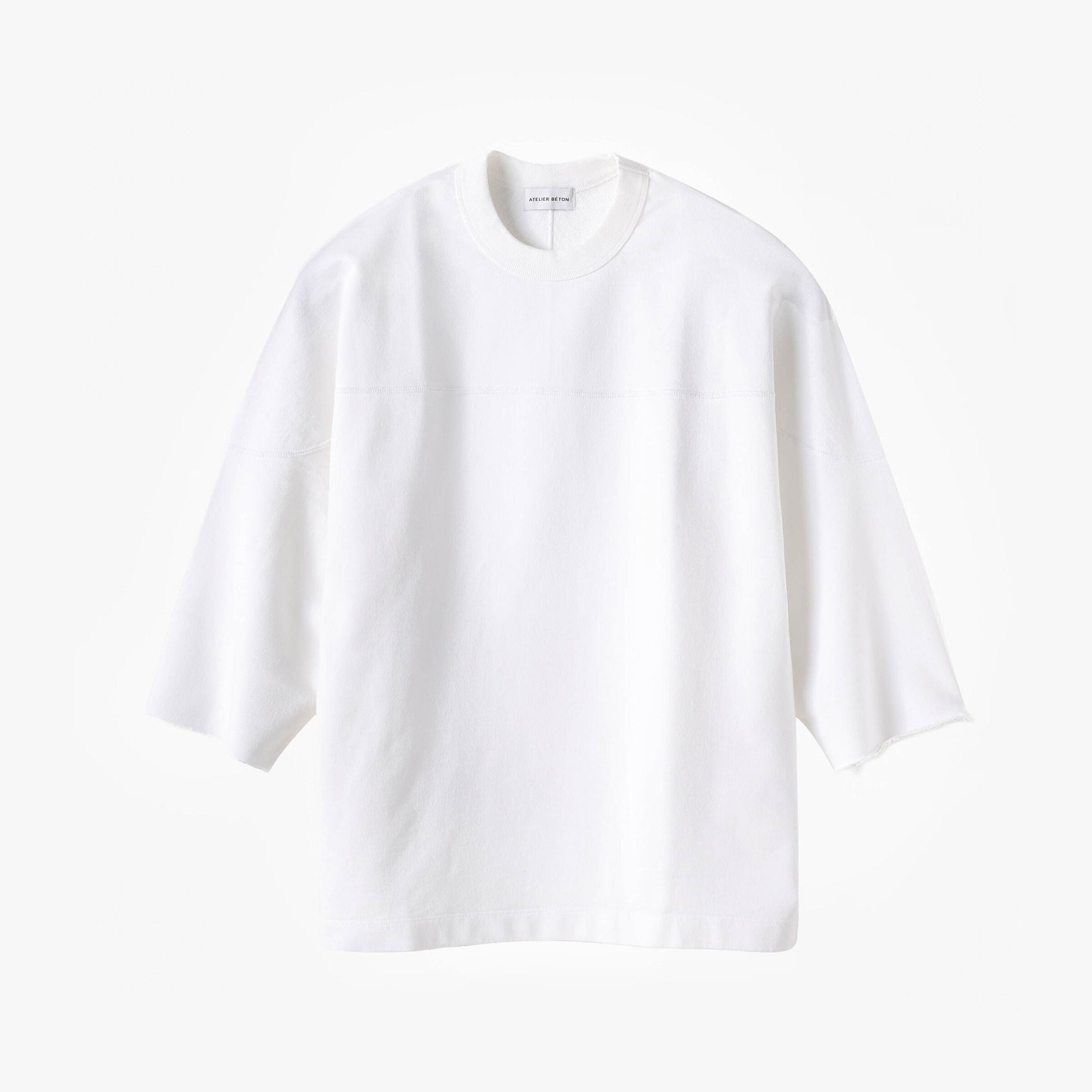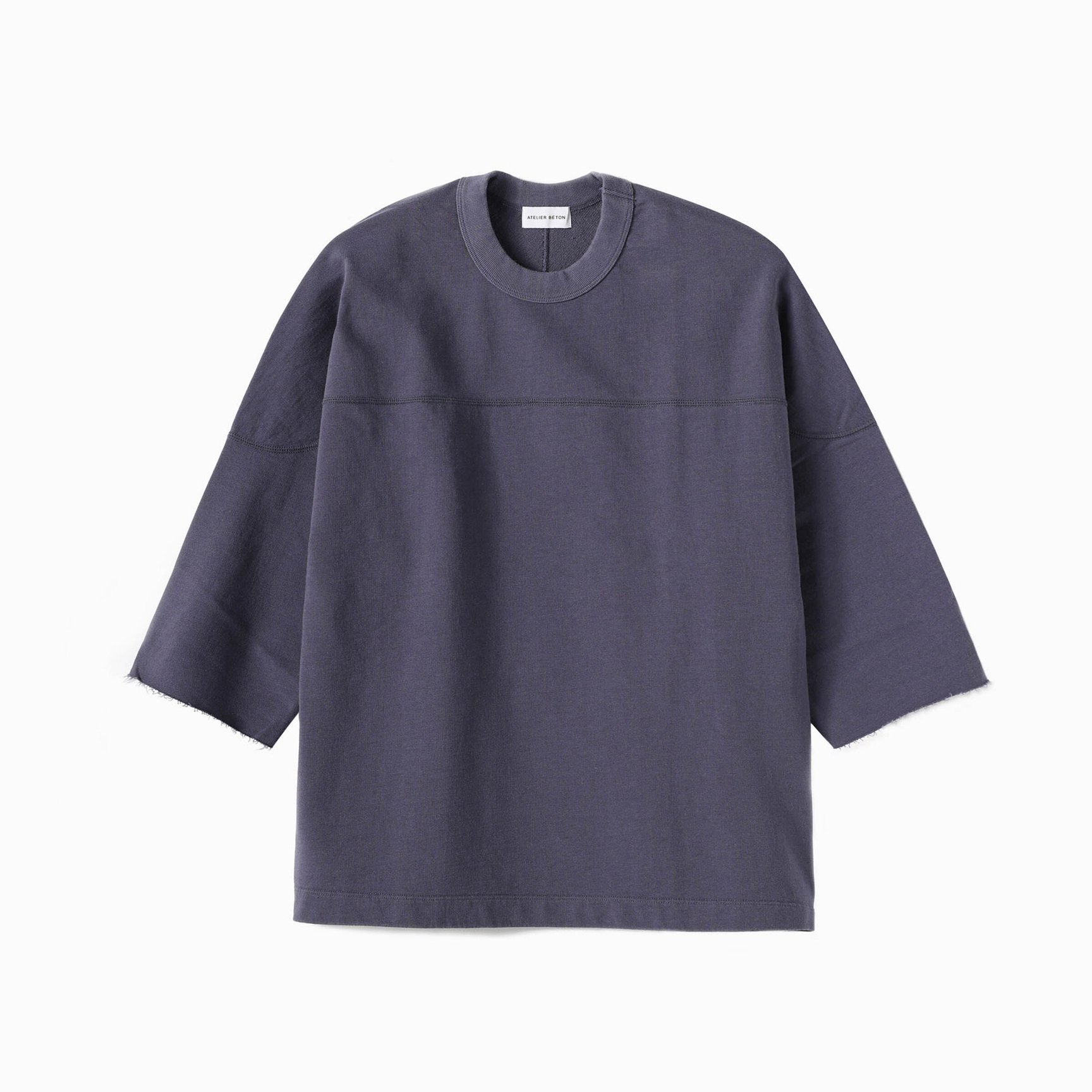 「アトリエ ベトン(ATELIER BÉTON)」からはフットボールTをピックアップ(その名の通りアメフト選手が着ていたユニフォームがもとになっています!)。アメカジ系の古着では定番アイテムですが、こちらはブランドらしい無地のミニマルなデザインやオーバーシルエット、袖のカットオフ仕様などでモダンにアップデート。アメカジに限らずどんなスタイルにもハマる1枚です。見た目はヘビーウェイトTのような無骨な印象ですが、最高級といわれる超長綿スーピマコットンにキュプラをブレンドしたオリジナル素材を使っており、とろみと適度な落ち感が出る生地感で優しい着心地を実現してくれます。カラーはホワイトの他にこなれた印象のネイビーも用意しています。