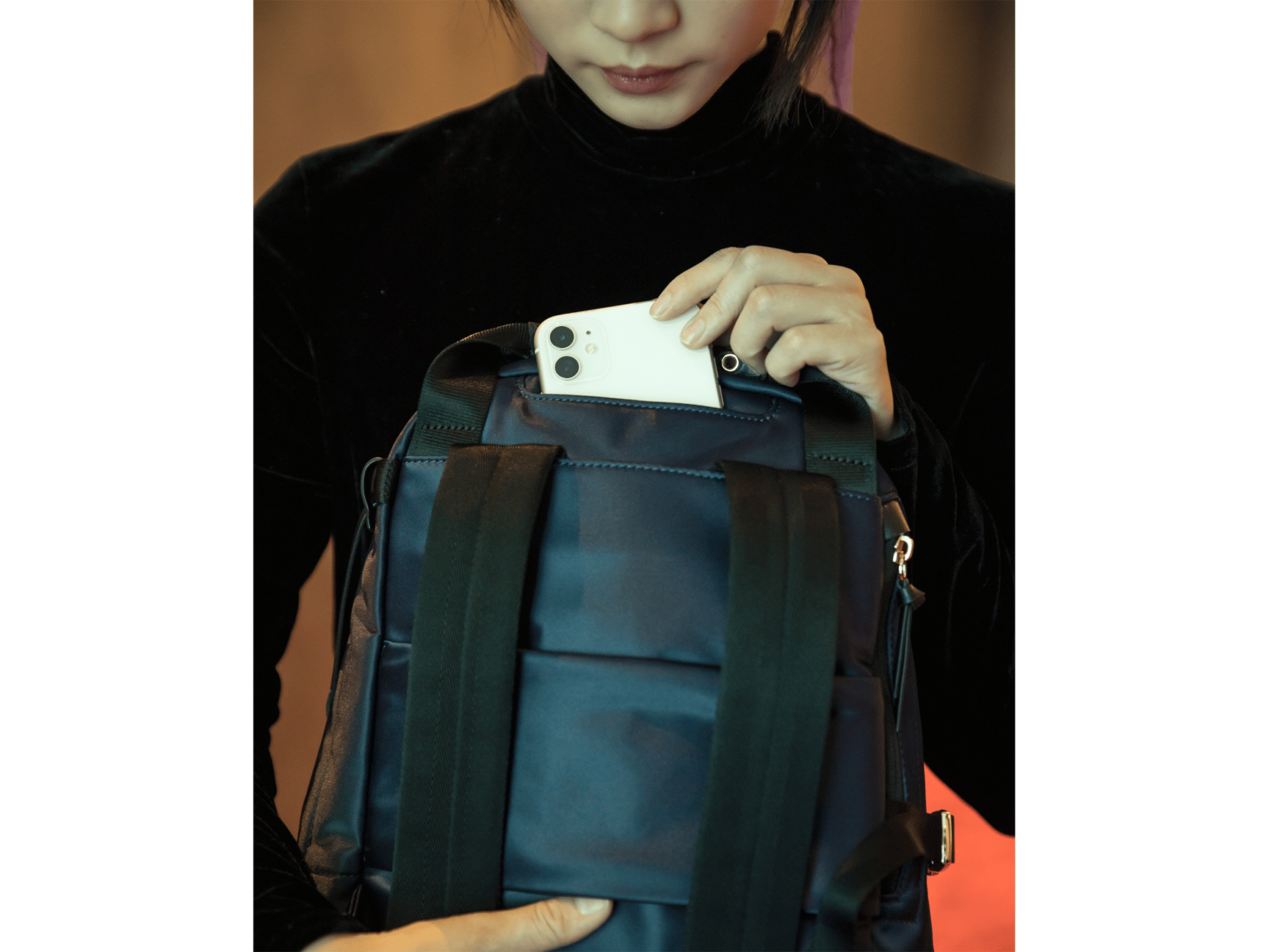 携帯電話などをさっと出し入れできるクイック・アクセスポケットは、安全性を考慮したマグネット付き
