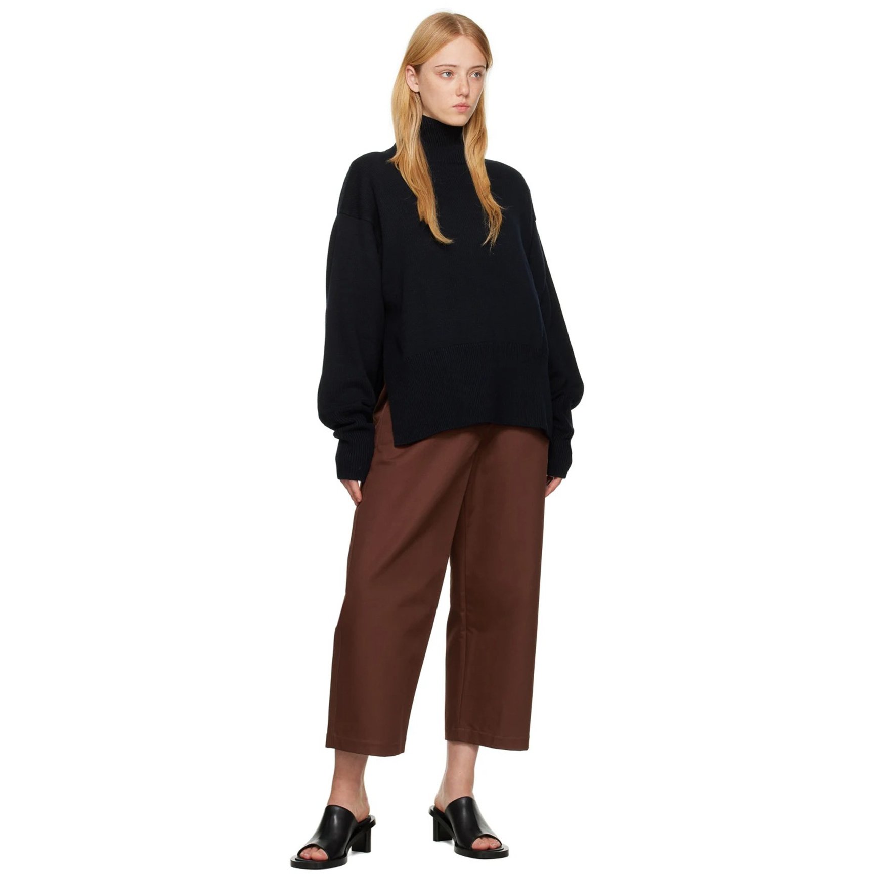スタイルを選ばないダークネイビーのタートルネックは「スタジオ ニコルソン(STUDIO NICHOLSON)」のもの。お尻まで覆うゆったりとしたサイズ感も嬉しい。ボトムスに明るいカラーを持ってくればコントラストの高いコーディネートが楽しめます。