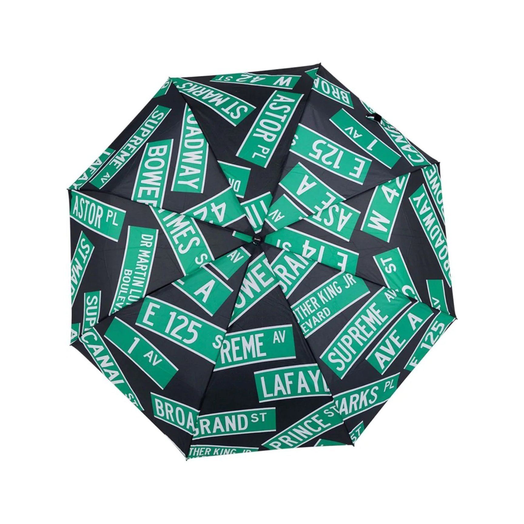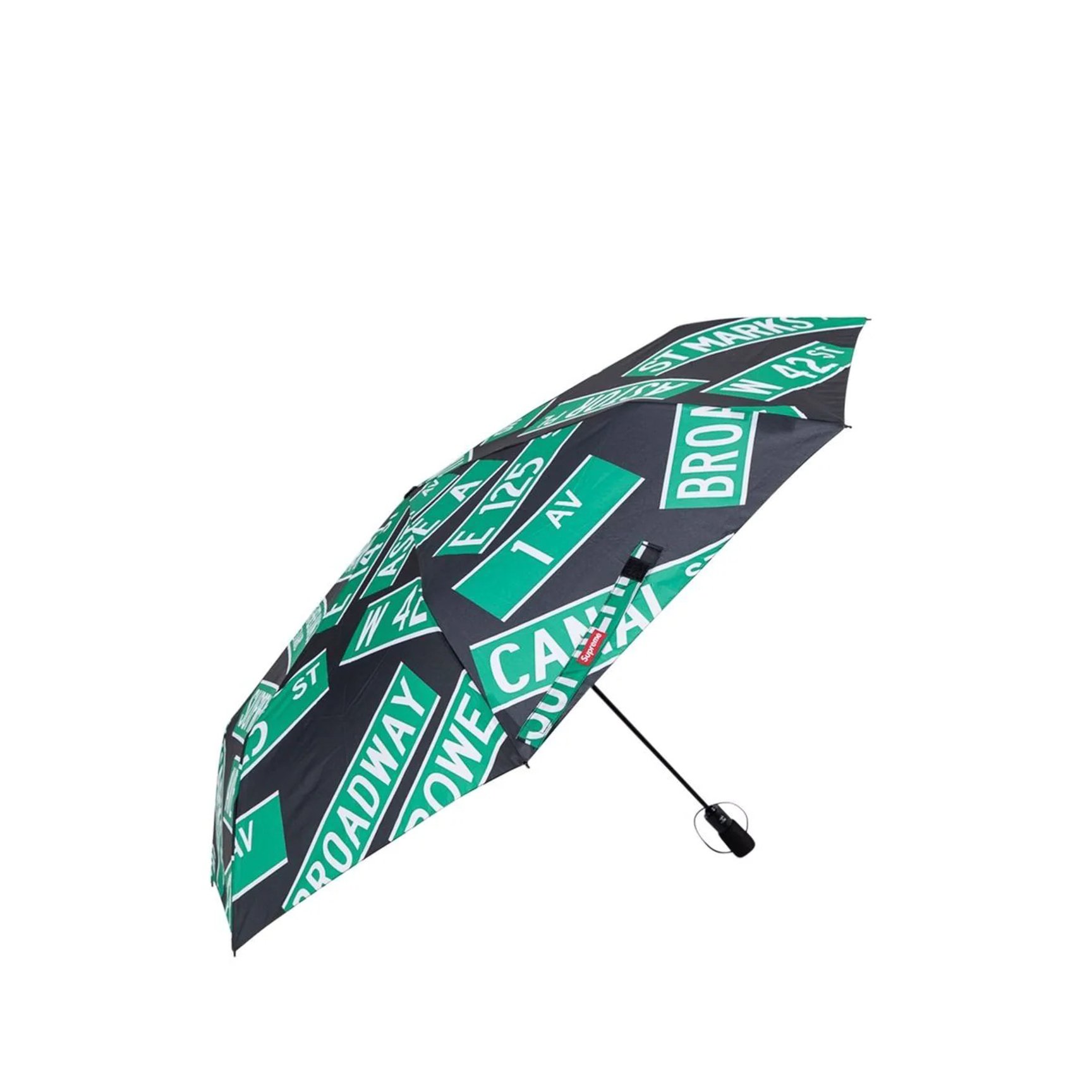 突然の雨に降られても気分が落ちない、「シュプリーム(SUPREME)」の折りたたみ傘。ブランドを象徴するボックスロゴが、グリーンの標識と共に散りばめられたストリートスタイルにぴったりのアイテムです。