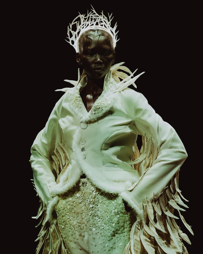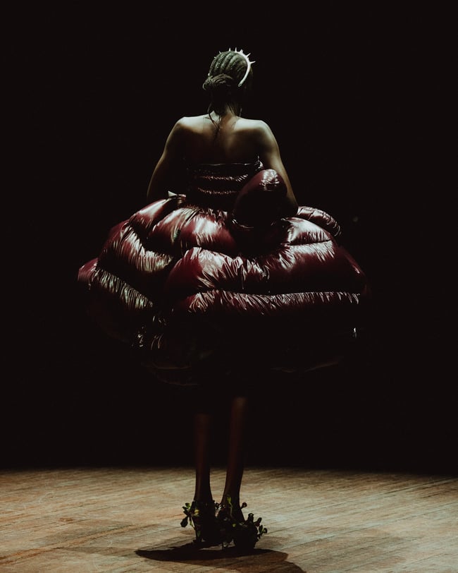 冬の日常着であるダウンジャケットをクリノリン風のドレスに仕立てた2体は、顔や手足のようなパーツが見え隠れし、歩くたびにふわふわと動いて生き物のよう。小さな羽と無数のボタンが刺繍された2体のドレス、そしてフェニックスのような羽根を持つ2体のセットアップは、ブライトサイドとダークサイドという二面性とともに「but beautiful」のテーマを体現し、ラストを飾った。