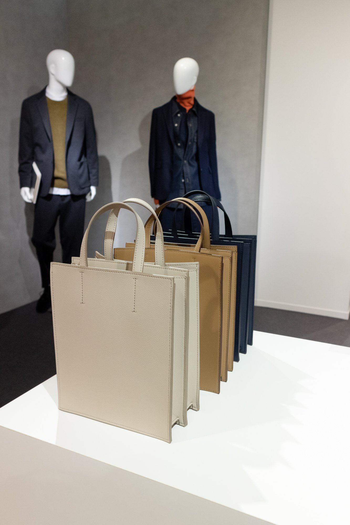 ミニマルなデザインのトートバッグに注目。コンパクトなサイズ感で、内ポケットを付けるなど機能性も確保しています。