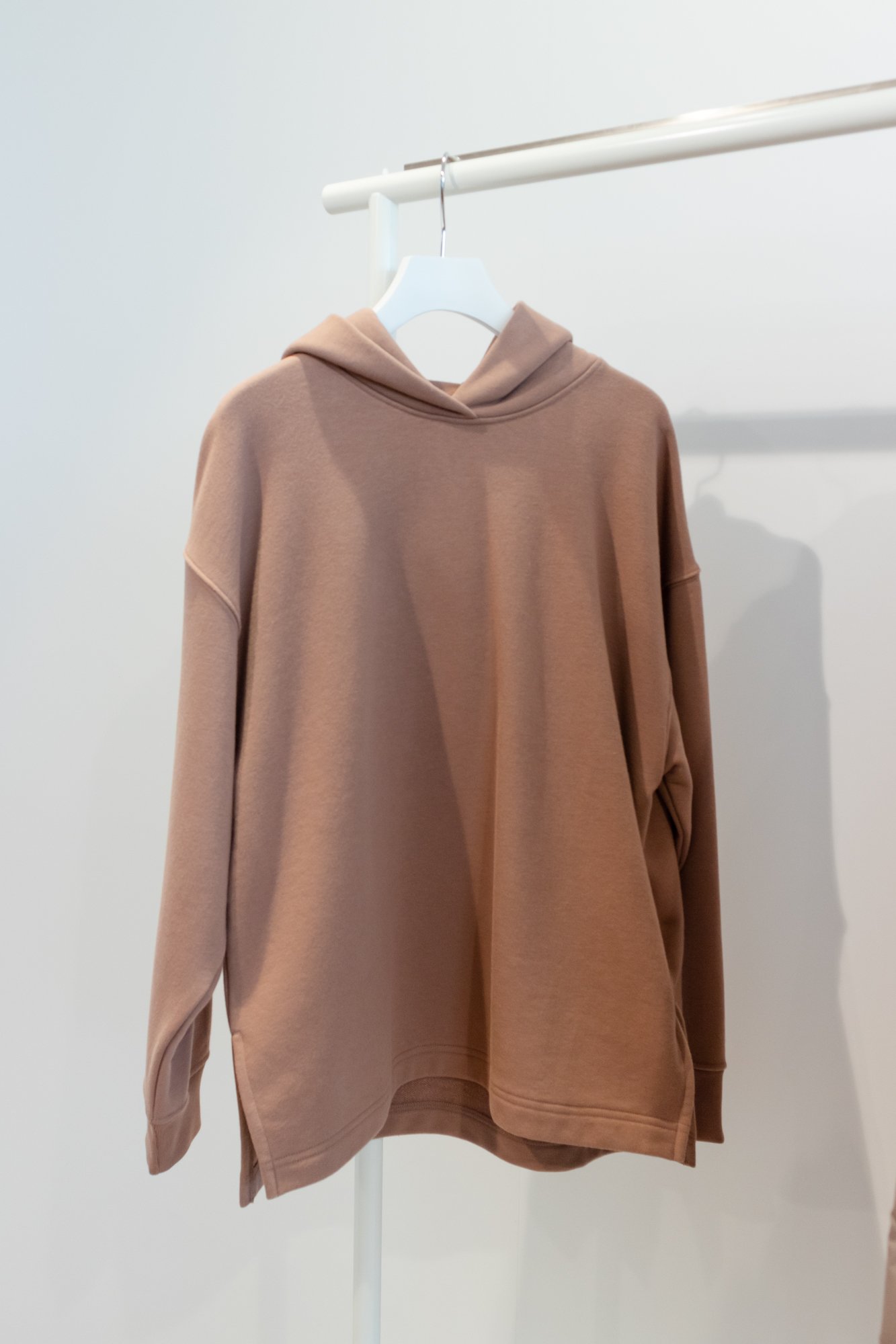 ウィメンズでメンズサイズのスウェットが人気だったことから、ボリュームのあるシルエットのフーディーが登場。両脇のサイドにスリットを配し、デザイン性を向上させています。