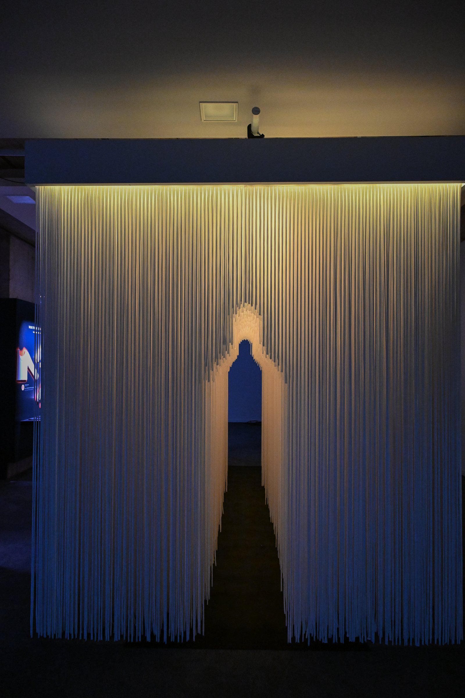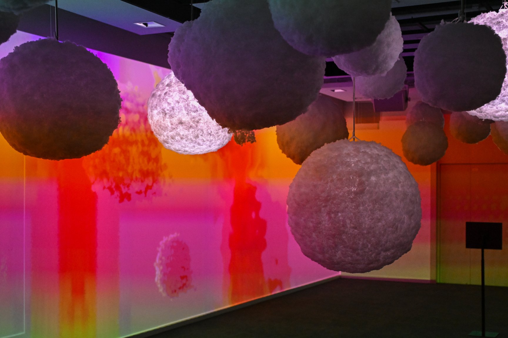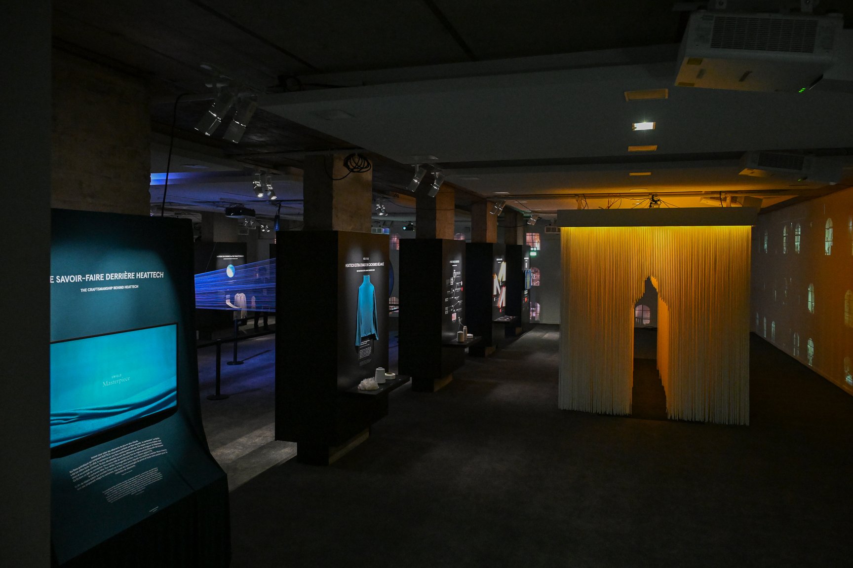 さらに、地下へと足を踏み入れると、1階とは真逆の視覚と感覚に訴えるフォトジェニック世界が広がる。“目に見えない繊維の世界”が壁面いっぱいのダイナミックなプロジェクションマッピングで描き出された「Journey of scale」。東レの最先端技術「NANODESIGN®」を大型インスタレーションで表現した展示や、パフテックの中綿を、光の演出で見せる展示。さらに、くぐると暖かい色に発光し、ヒートテックのメカニズムを体感できるトンネルなど、ユニクロと東レとの協業によるテクノロジーを立体的に体感できる仕掛けがとてもユニーク。ファッションの域を超えた展示の数々に、来訪者は皆、驚いていた。