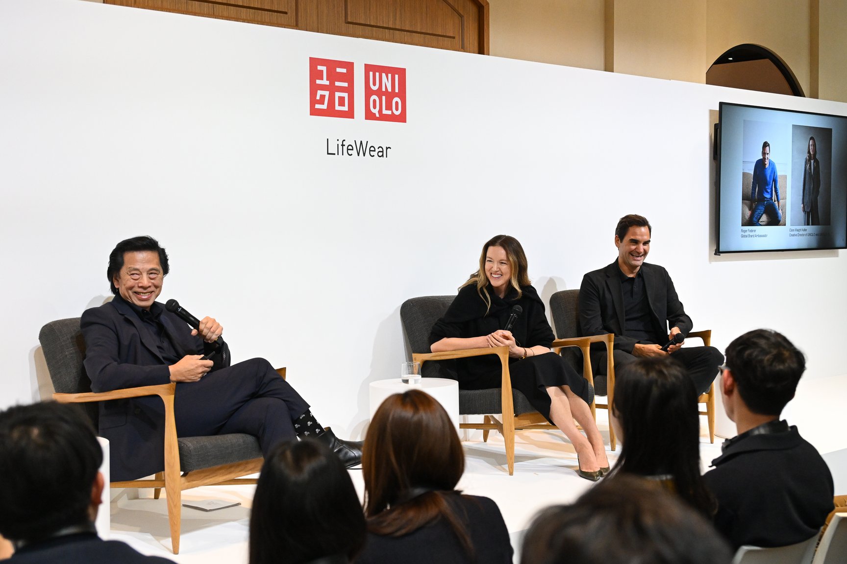 さらに、記者会見では、グローバルブランドアンバサダーであるテニスプレイヤーのロジャー・フェデラー(Roger Federer)と、新たにユニクロのクリエイティブディレクターに就任したクレア・ワイト・ケラー(Clare Waight Keller)がパネルディスカッションに参加。それぞれ、同展のテーマである「人々の生活をよりよくするするものは何か?」や、「自分にとって人生で大切なものは何か?」、また「それがユニクロのLifeWearのデザインにどう影響を与えるのか」などについて語った。