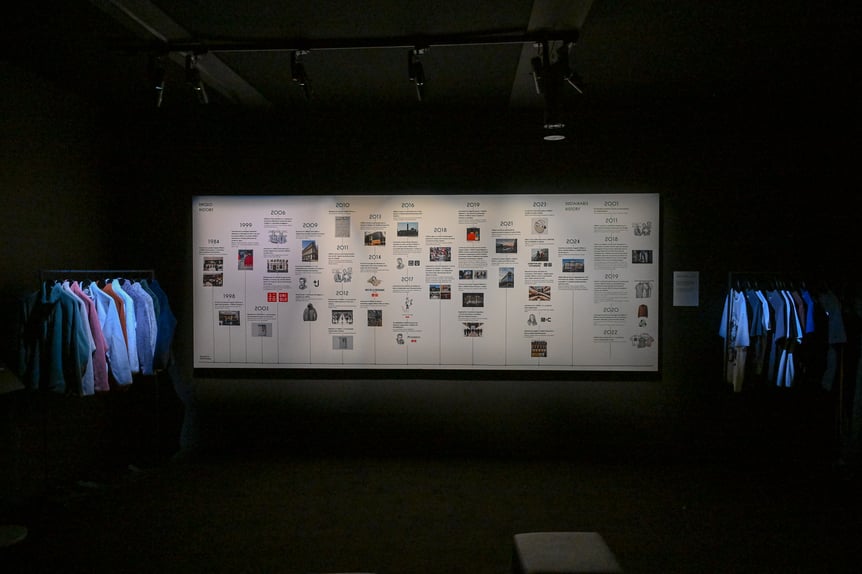 展示の締めくくりは、ユニクロの40年の歴史を一堂に会したパネルと映像。「私たちは40年にわたり、服だけでなく、 服をつくる会社にできることを、見直し続けてきました。 その私たちの価値観の結晶が『LifeWear』です。ユニクロの服は国籍・年齢・職業・性別を超えた『あらゆる人々のための服』。シンプルかつ上質、機能性と耐久性を持ち、しかも毎年、その機能が高まっていく。 『使い捨ての服』ではなく、長く着られる究極の普段着。これが『LifeWear』の哲学です」とユニクロが「LifeWear」に込める想いについてメッセージを発した。