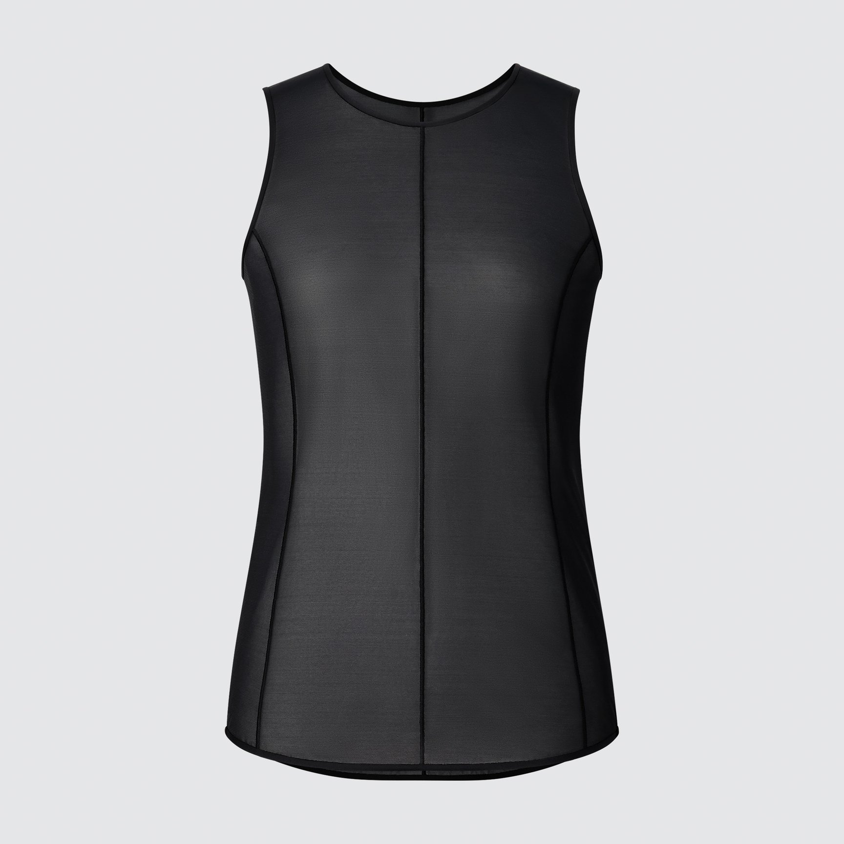 透明感のあるシアー素材を使用したタンクトップが、ブルー、ブラウン、ホワイトとブラックで登場。ネック、アームホールと裾を縫い目が見えないパイピング仕様にするなど、ディテールにもこだわりが光ります。
