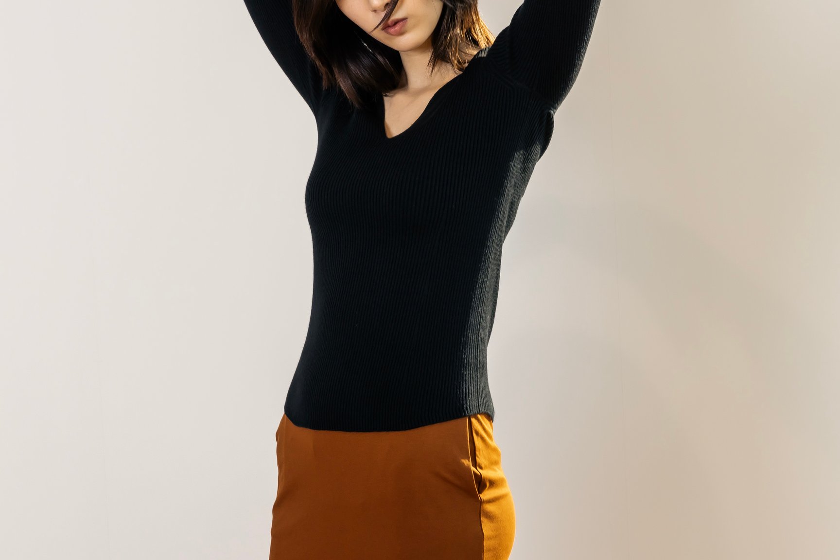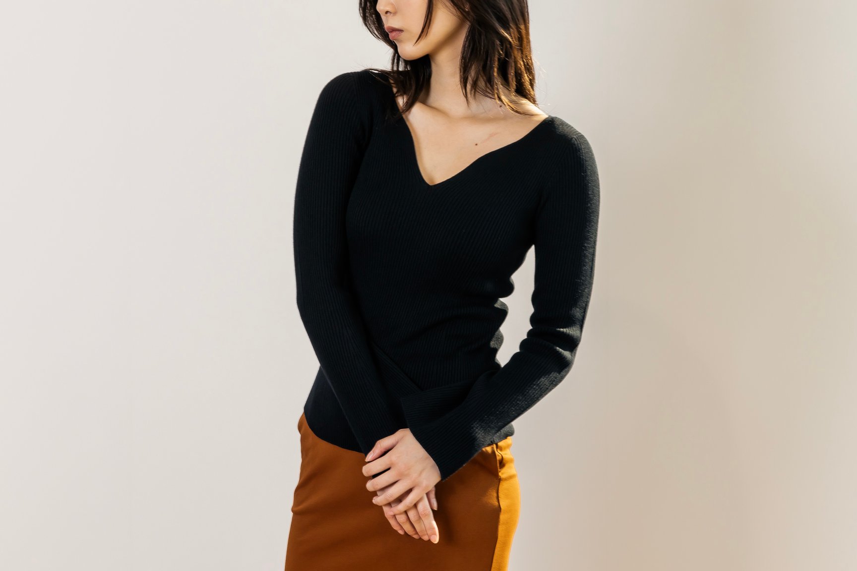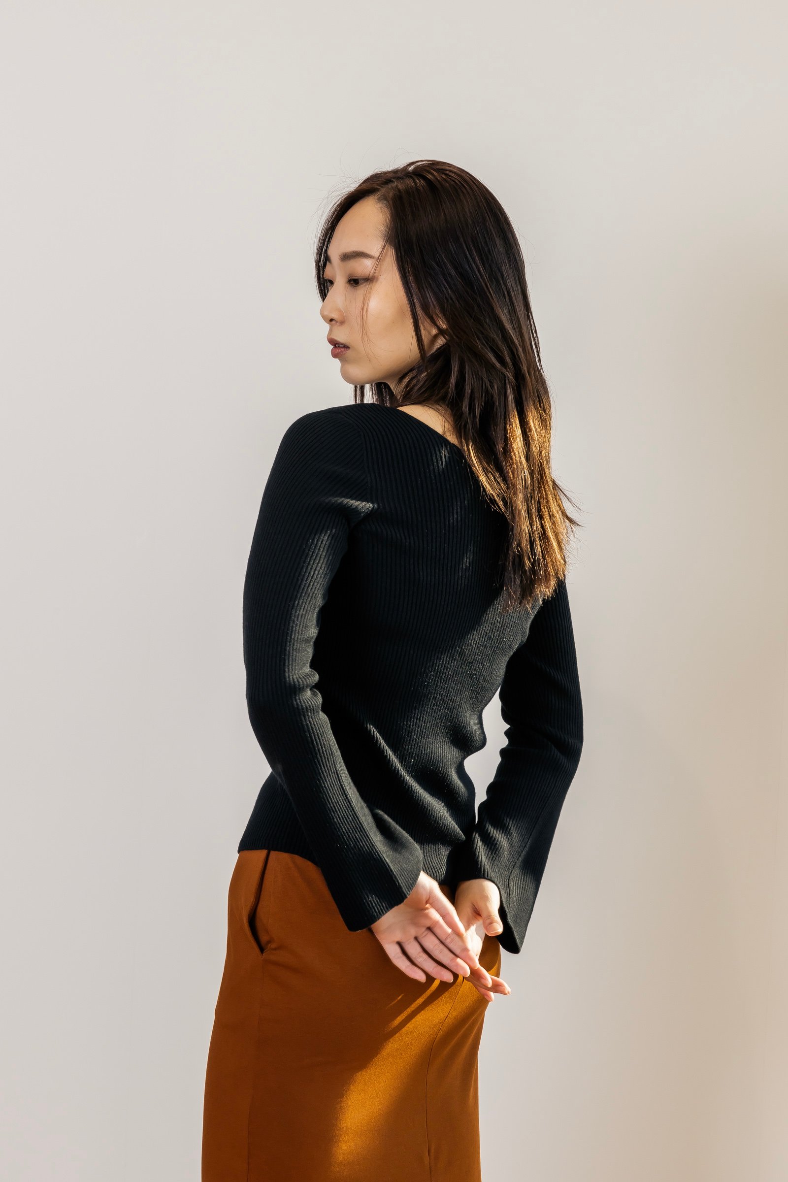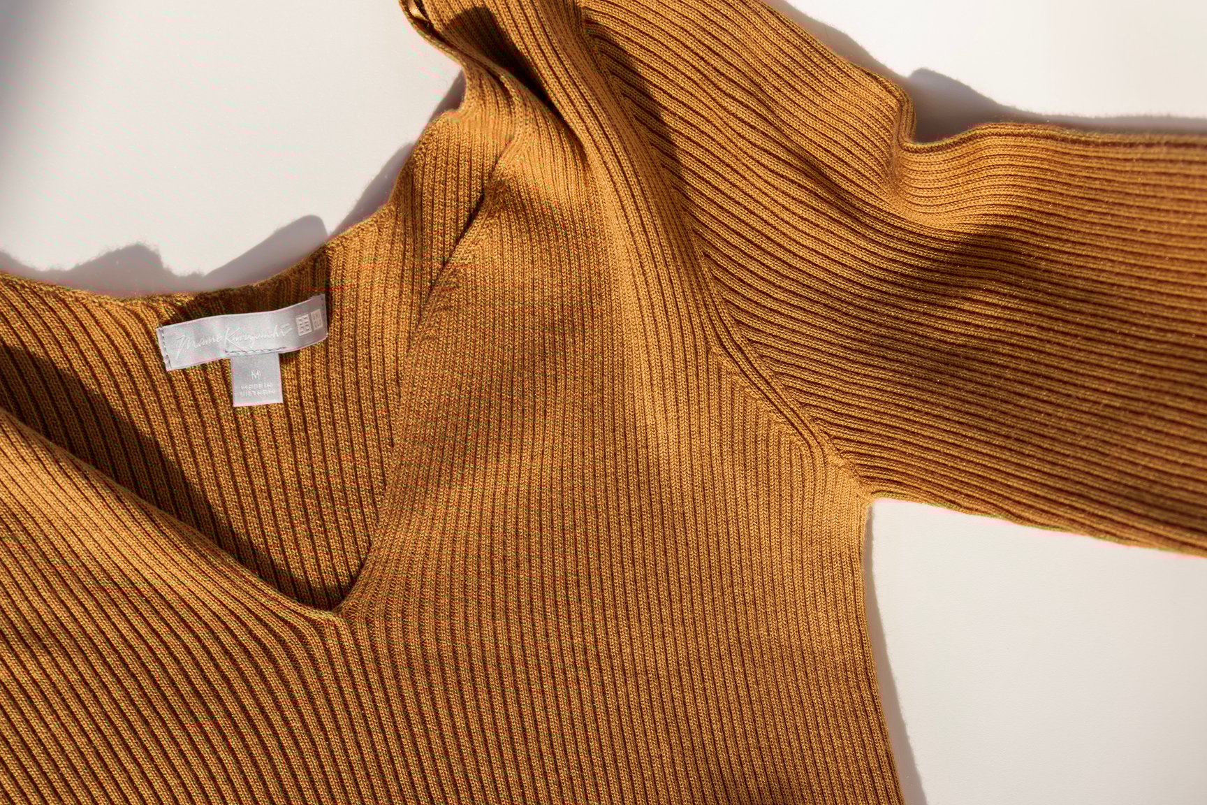 N:ここまで立体的な曲線シルエットのニットは、ユニクロの既存ラインには無かったように思います。デコルテの空きが広めでエレガント。