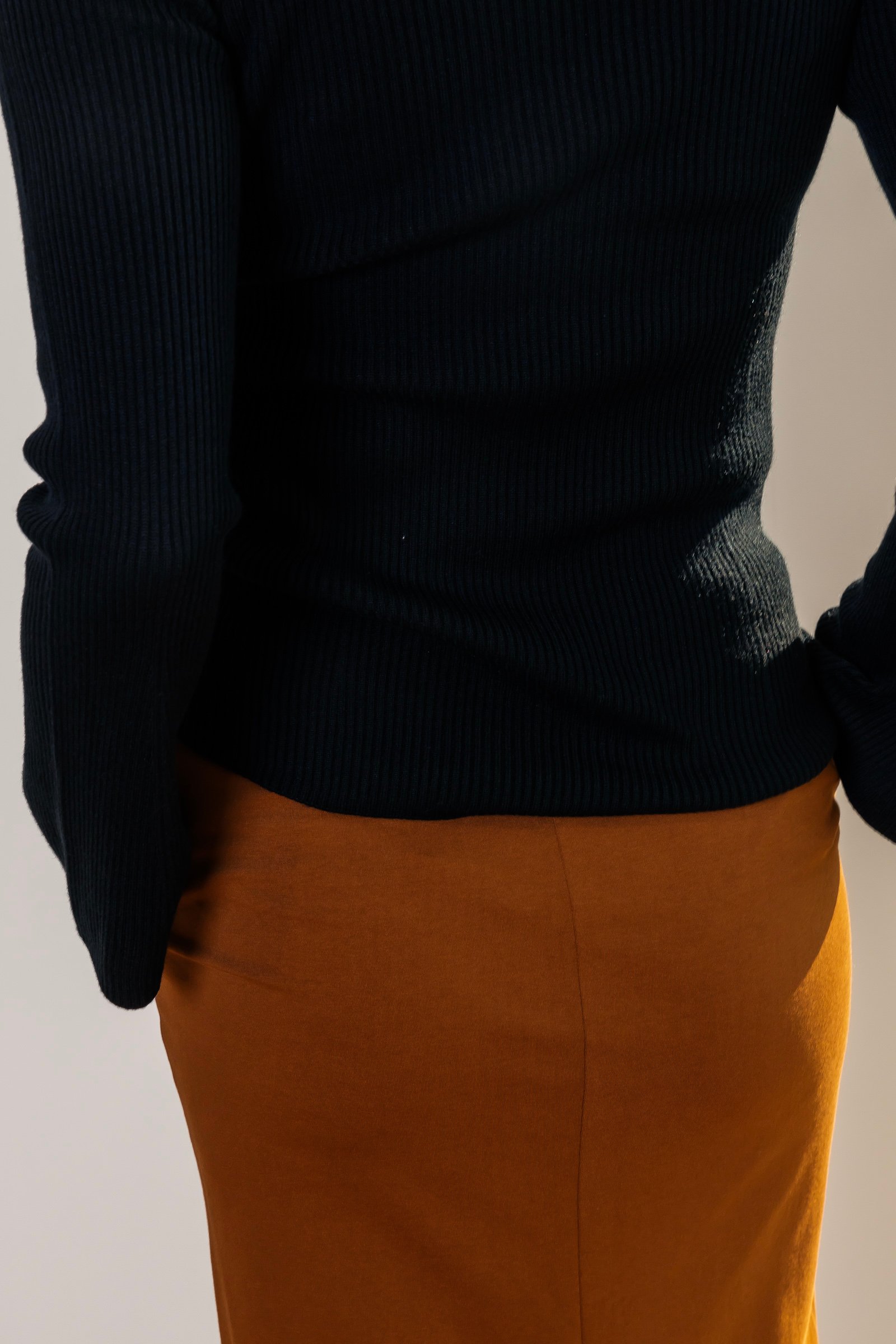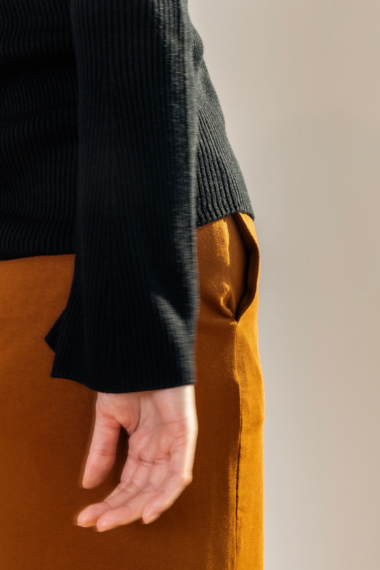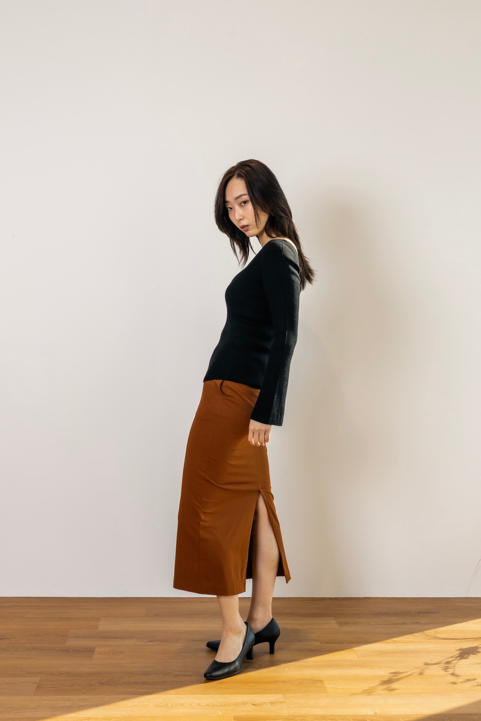 K:畝が細かい薄手のリブニットで、しなやかに肌に添う感覚です。インナーにはマメクロのブラキャミがぴったり合いそう。ニット類で唯一4色展開なんですが、そのうち2色がブラウンというのも、マメクロならではですよね。
