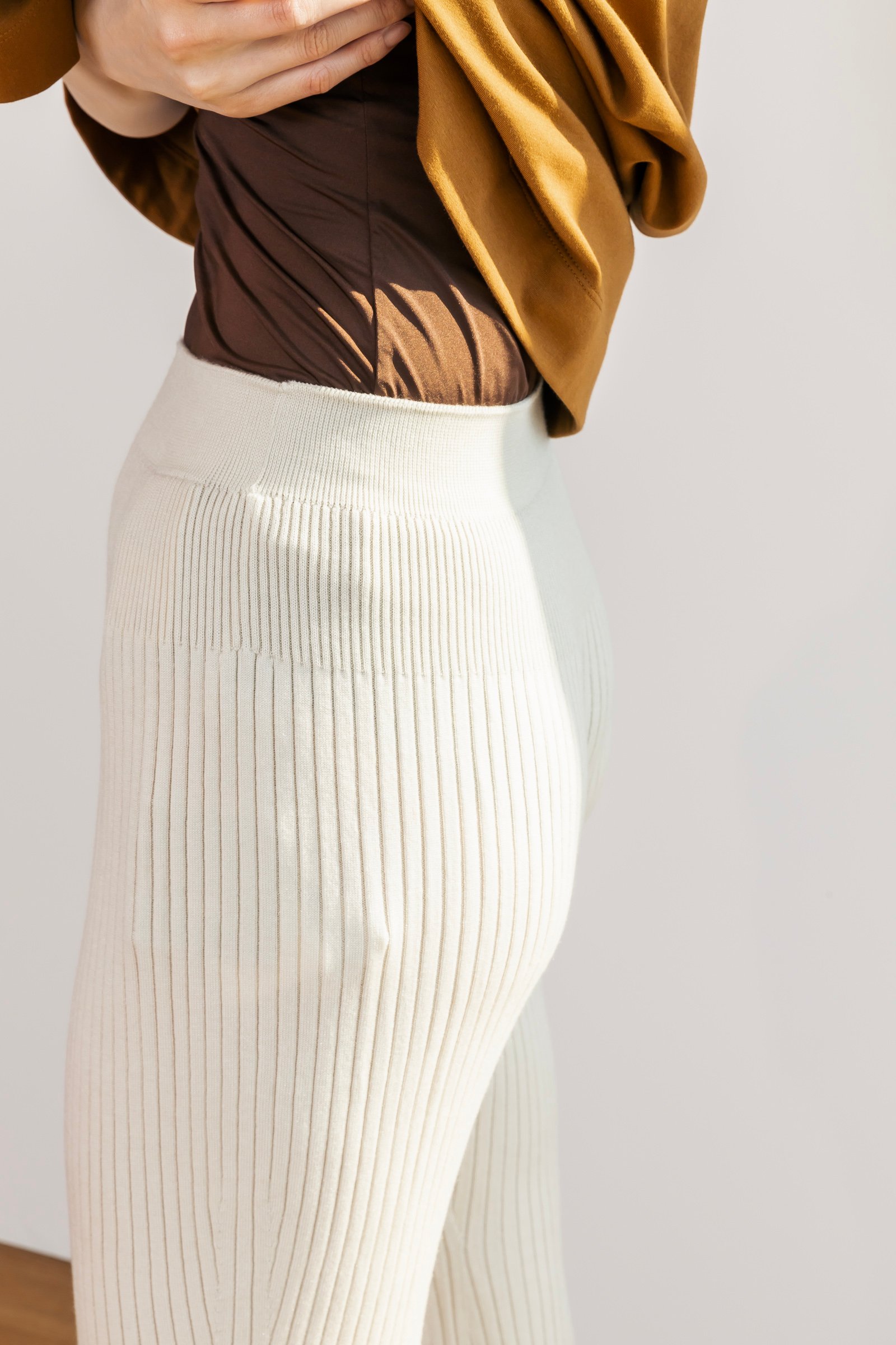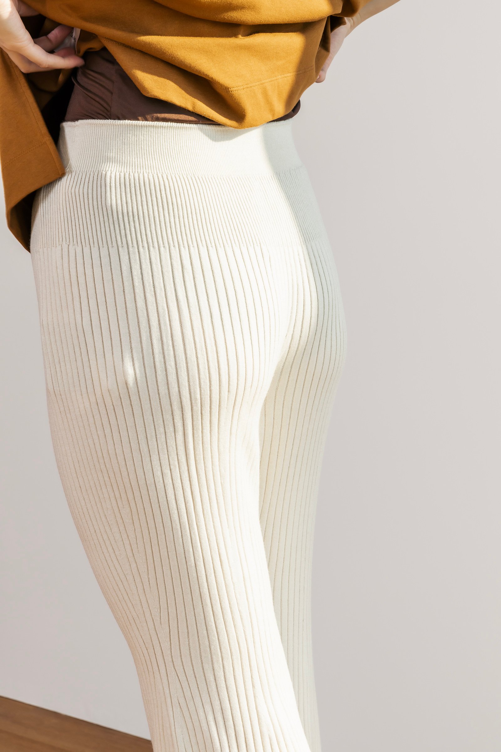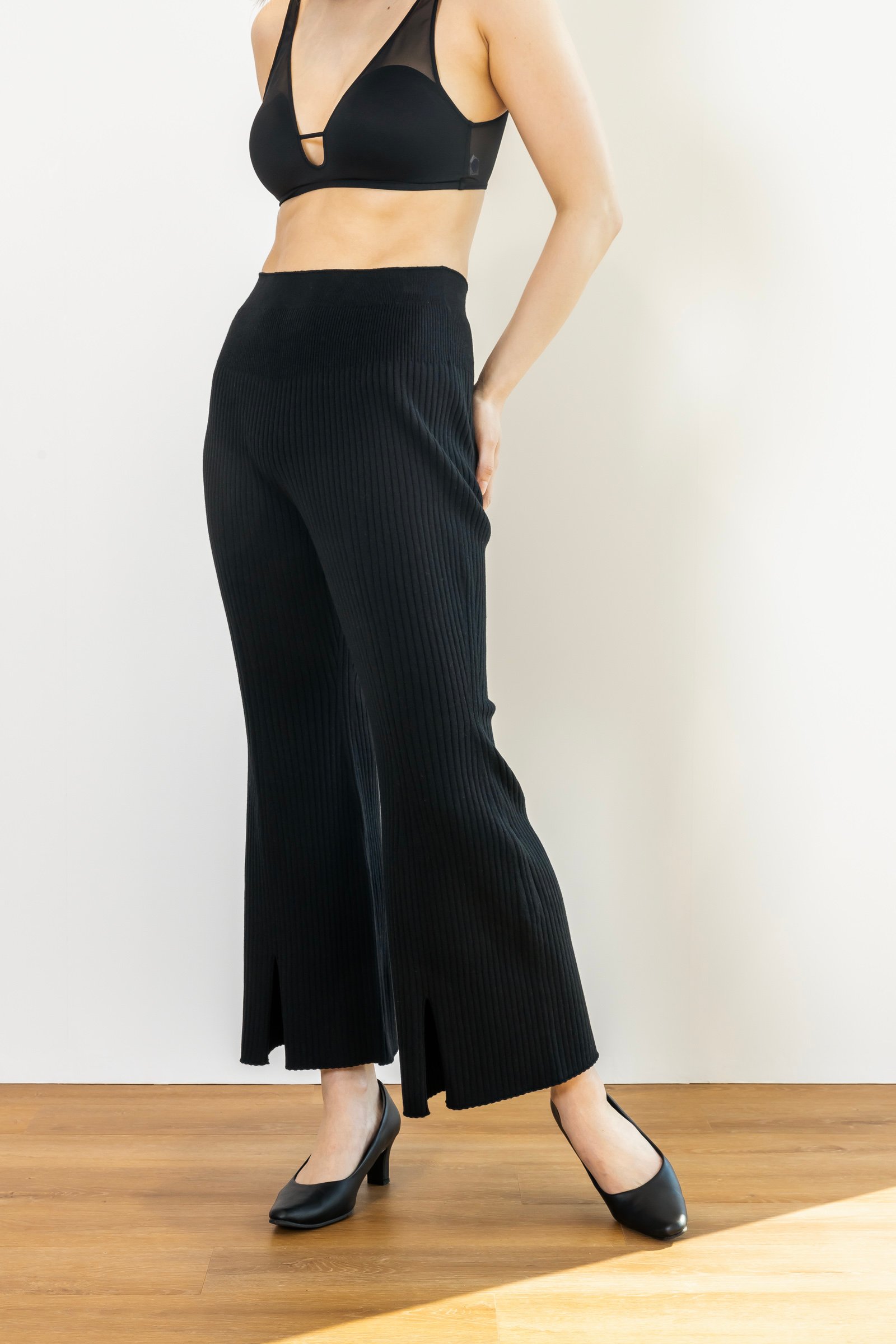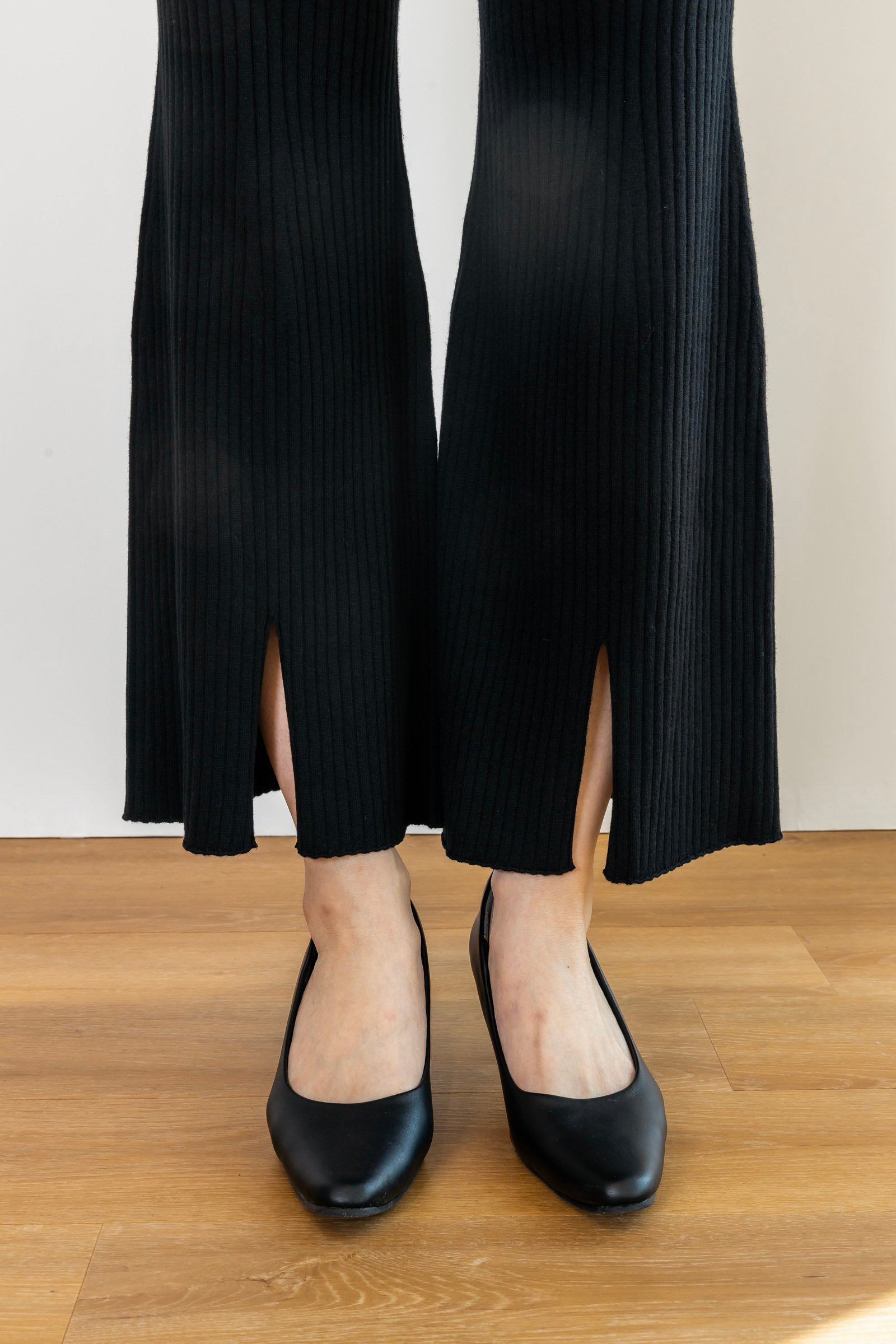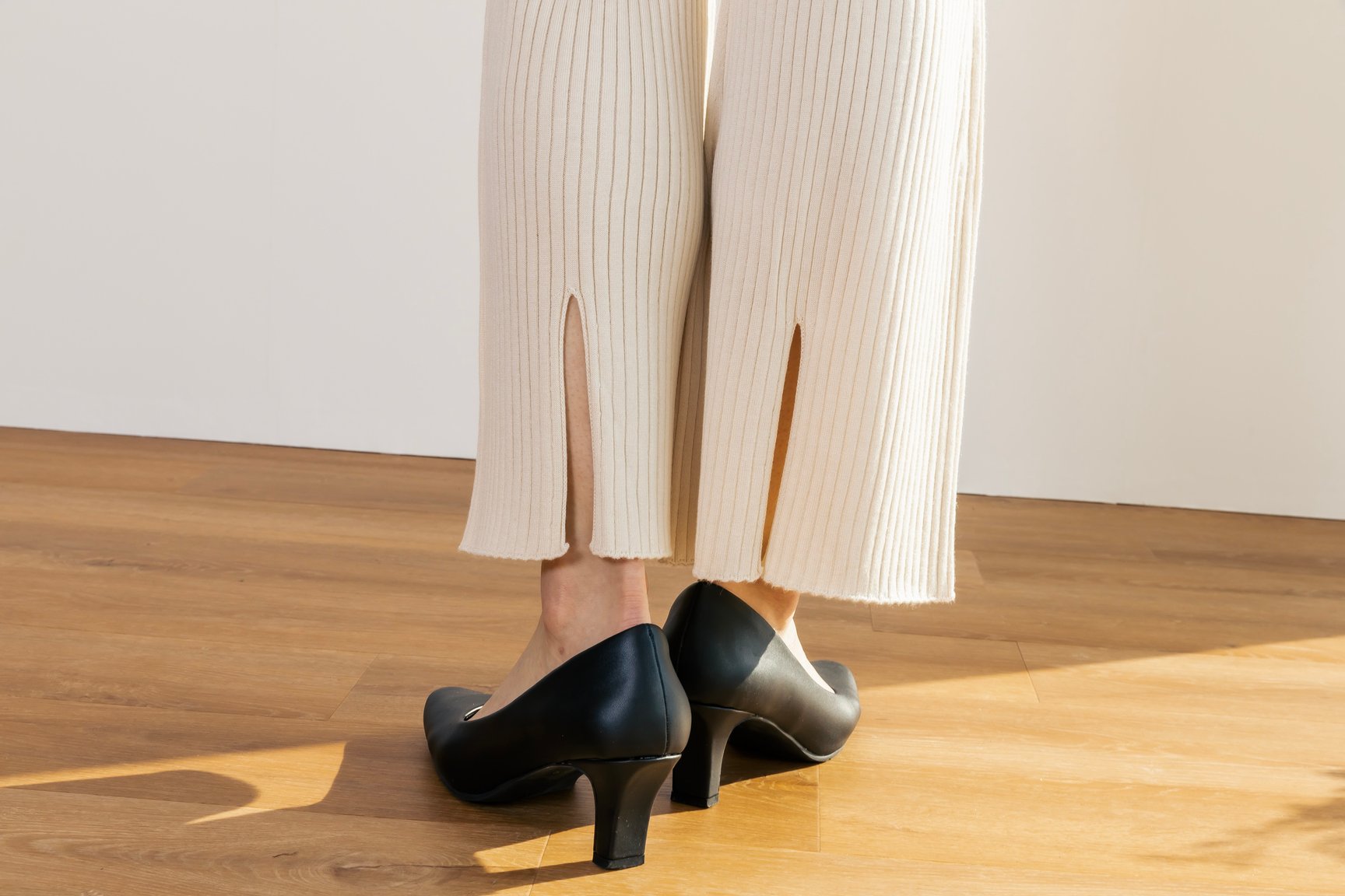 N:先ほどのリブニットと同じ混率で、リブの畝は太め。膝上のあたりから程よいフレアシルエットで、フロントのスリットが効いています。