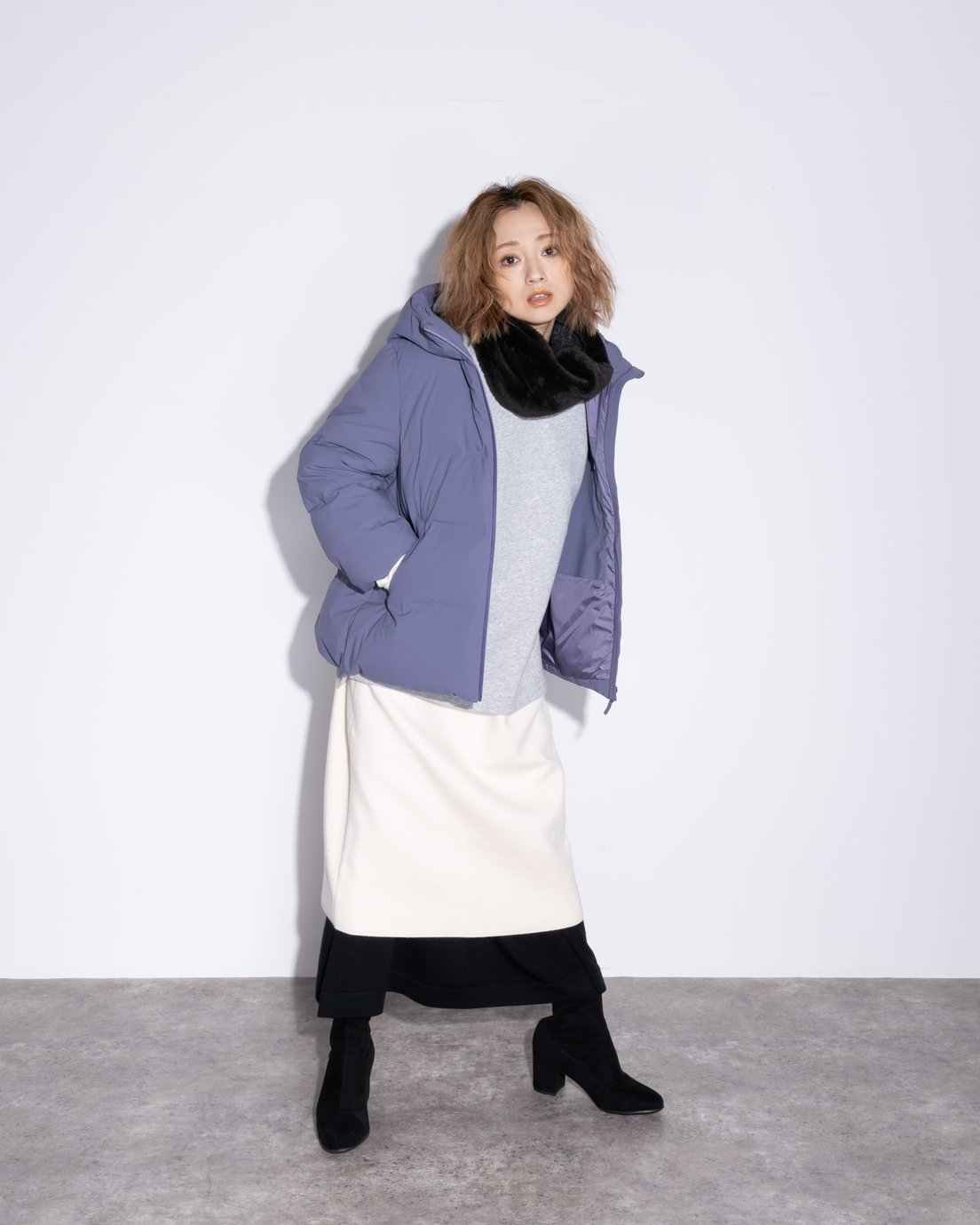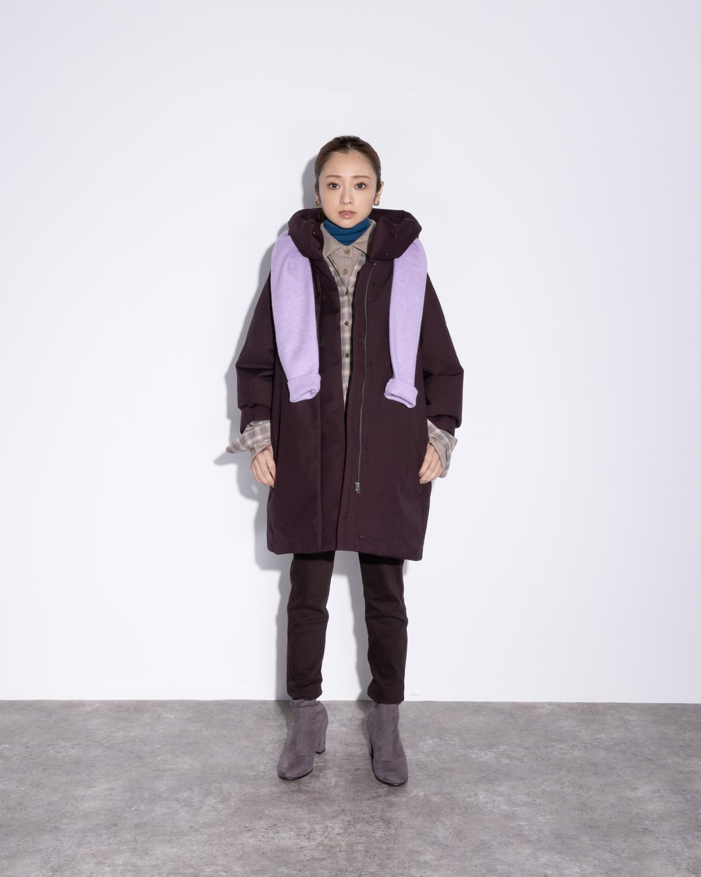 撥水加工が施されたマットな生地感でスタイリッシュさが際立つ膝上丈のAラインコートは、首をすっぽり覆うボリューミーなフードのバランスが"大人可愛い"絶妙なシルエット。部位によってダウンと機能中綿を使い分けるというハイブリッド構造は暖かさと動きやすさを両立。深いワインカラーは色馴染みのよいベージュなど明るめトーンとも好相性。