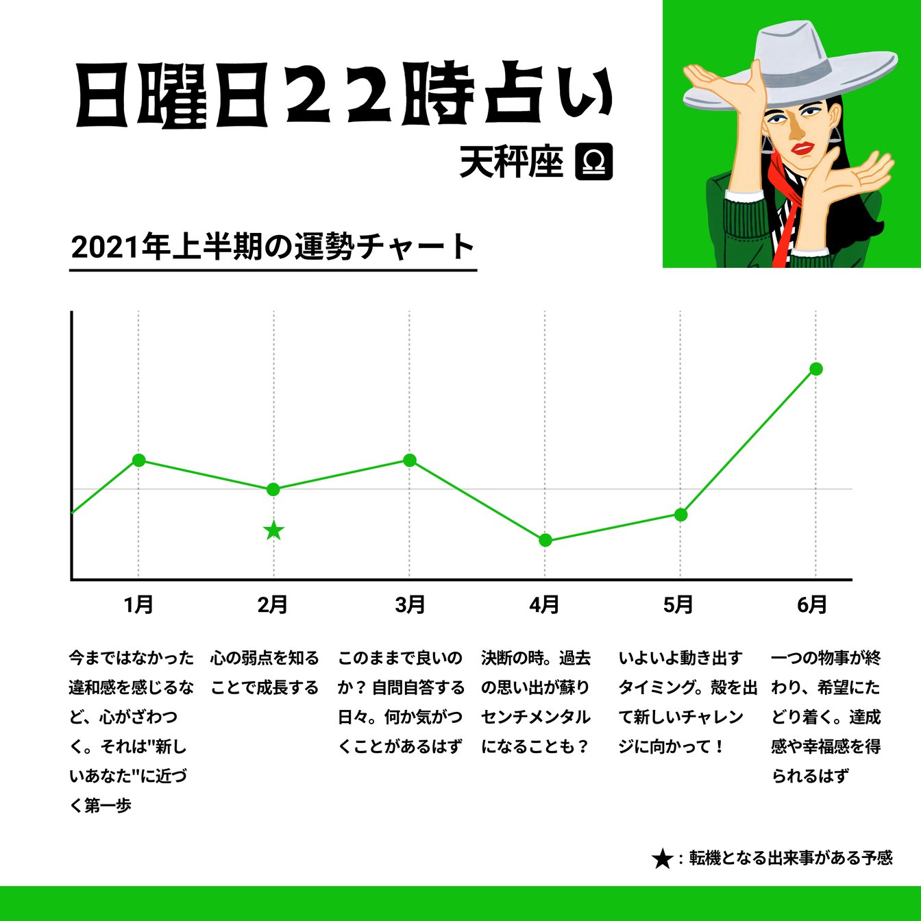 2021年上半期の運勢は割と好調です。本格的に動き出してくるのは、ゴールデンウィークを過ぎた頃になりそうです。それまでの間に関しては、あなたなりに心の整理や葛藤を経験してから動き始めることによって、成功につながる道を見つけることになりそうなのです。慎重派の天秤座のあなたのやり方ですから、本格的に動き出すタイミングが上半期の後半になっているということは、決して遅いわけではなく、丁度良いタイミングとなっていくのでしょう。その間に、あなたの内々で先にやっておくべき経験が降りかかってきそうなので、それをしっかりとこなしておくと、スムーズに事が進んで行きますよ。無駄はないということを覚えておいてくださいね。1月、3月、6月に何か出発のきっかけとなるような伏線が張られていきそうです。上半期は、運勢の流れとメンタルのバランスを図ることがポイントです。